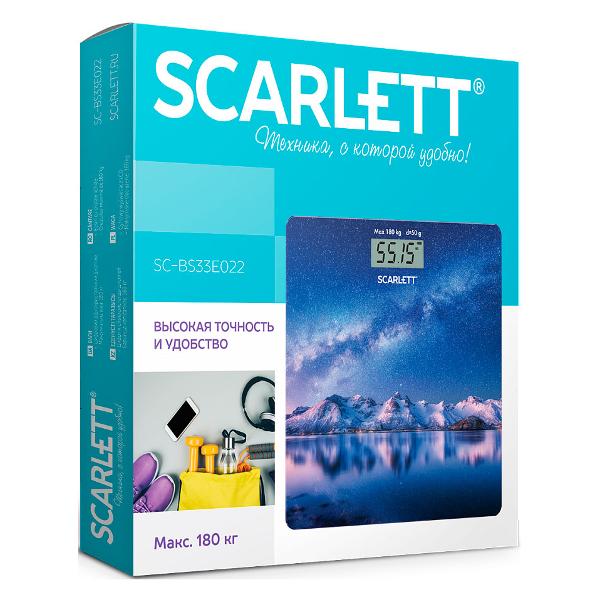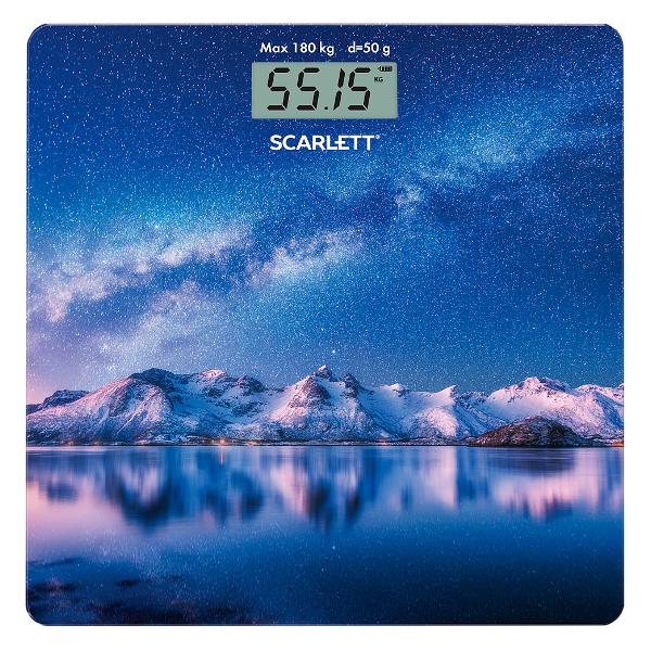 Напольные весы Scarlett SC-BS33E022 располагаются на тонкой платформе высотой 5 мм. Поверхность выполнена из закаленного стекла с рисунком ночного неба и гор. Модель позволяет определять вес до 150 кг, измеряя его с погрешностью 50 г. Для отображения показаний предусмотрен LCD-дисплей.