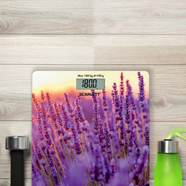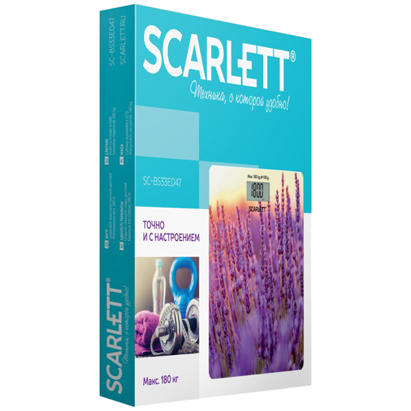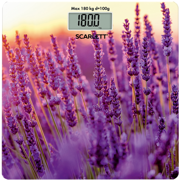 Электронные напольные весы Scarlett SC-BS33E047 выполнены в фиолетовом цвете и дополнены ярким рисунком. Квадратная платформа изготовлена из ударопрочного стекла и справляется с нагрузкой до 180 кг. Устройство питается от батарейки CR2032.