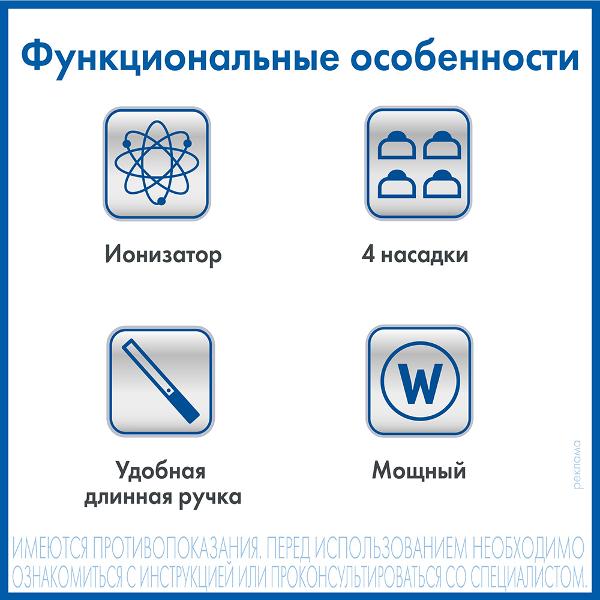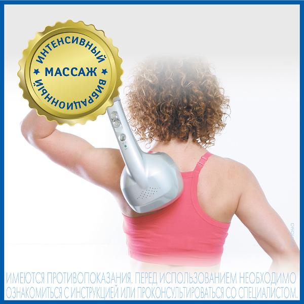 Эргономичная длинная ручка позволяет достать до любой части тела. В комплекте — четыре сменные массажные насадки, которые снимают напряжение мышц, улучшают циркуляцию крови. Мощность — 25 Вт. Кнопочное управление позволяет регулировать скорость вибрации. Есть два режима работы со скоростью 900 уд/мин и 1200 уд/мин. Встроенный ионизатор обеспечивает ускорение процессов метаболизма, позитивно влияет на организм с помощью ионов с отрицательным зарядом. Прибор оказывает антицеллюлитное воздействие. Есть таймер выключения.