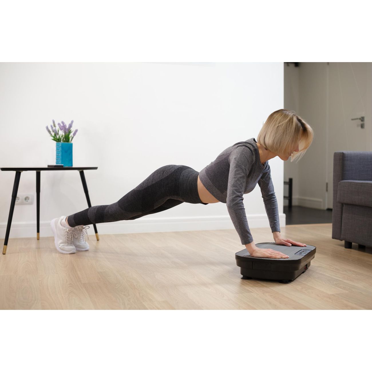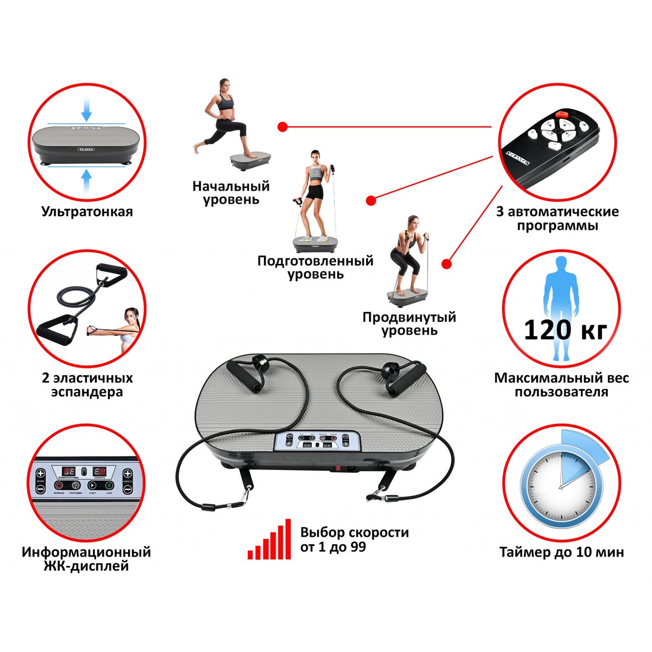 Несмотря на свой небольшой опыт пользования данной виброплатформой, все члены семьи успели его оценить по достоинству. Платформа легкая в подъеме, тонкая, что позволяет задвинуть под кровать или диван. Очень удобно. Для меня еще плюсом оказался серый цвет, который подошел под мой интерьер. Упакована была на славу, т.е. нигде никаких не было ни трещин ни царапин, все доставили в целости и сохранности. В инструкции к платформе были указаны упражнения для эффективности достижения требуемых результатов. Верхнее покрытие платформы прорезинено, ноги не скользят. В комплект входит комплект эспандеров, пока не удалось их использовать в работе, но, уверена, что результат работы с ними тоже будет отличным. Еще одним плюсом можно отметить то что можно регулировать программы и скорость пультом, который идет в комплекте.