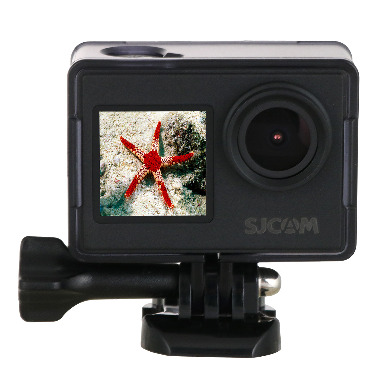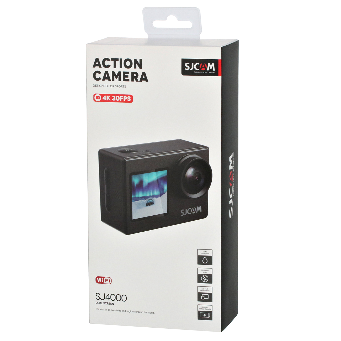 Экшн-видеокамера SJCAM SJ4000 Dual Screen оснащена двумя широкоугольными экранами диагональю 1,3 дюйма и 2 дюйма, что дает возможность с максимальным комфортом проводить съемки. В основе работы лежит CMOS-матрица (16 Мп). Устройство способно проводить съемку видео в разрешении 3840х2160 пикселей (4K Ultra HD) с частотой 120 кадр/сек. Угол обзора 170° обеспечивает хорошую видимость. Технология цифровой стабилизации изображения исключает вероятность размытости картинки. Возможно проведение серийной фотосъемки с частотой 30 кадр/сек.