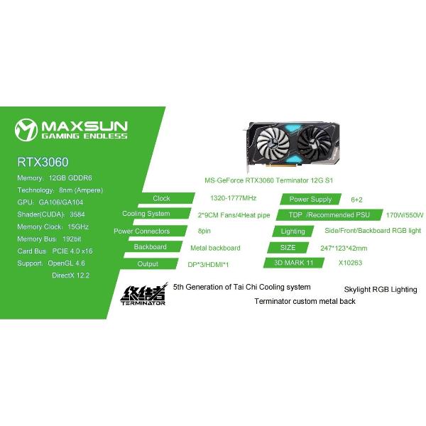 Вы можете купить Видеокарта MAXSUN MS-Geforce RTX3060 Terminator 12G S1 в магазинах М.Видео по доступной цене. Видеокарта MAXSUN MS-Geforce RTX3060 Terminator 12G S1: подробное описание, фото и отзывы реальных покупателей, характеристики, возможность скачать инструкции и подобрать аксессуары.