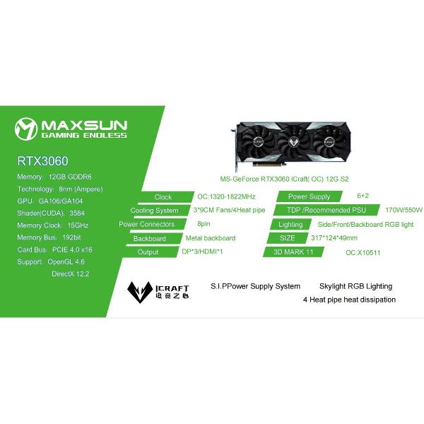 Вы можете купить Видеокарта MAXSUN NVIDIA GeForce RTX 3060 ICRAFT OC 12G S2 в магазинах М.Видео по доступной цене. Видеокарта MAXSUN NVIDIA GeForce RTX 3060 ICRAFT OC 12G S2: подробное описание, фото и отзывы реальных покупателей, характеристики, возможность скачать инструкции и подобрать аксессуары.