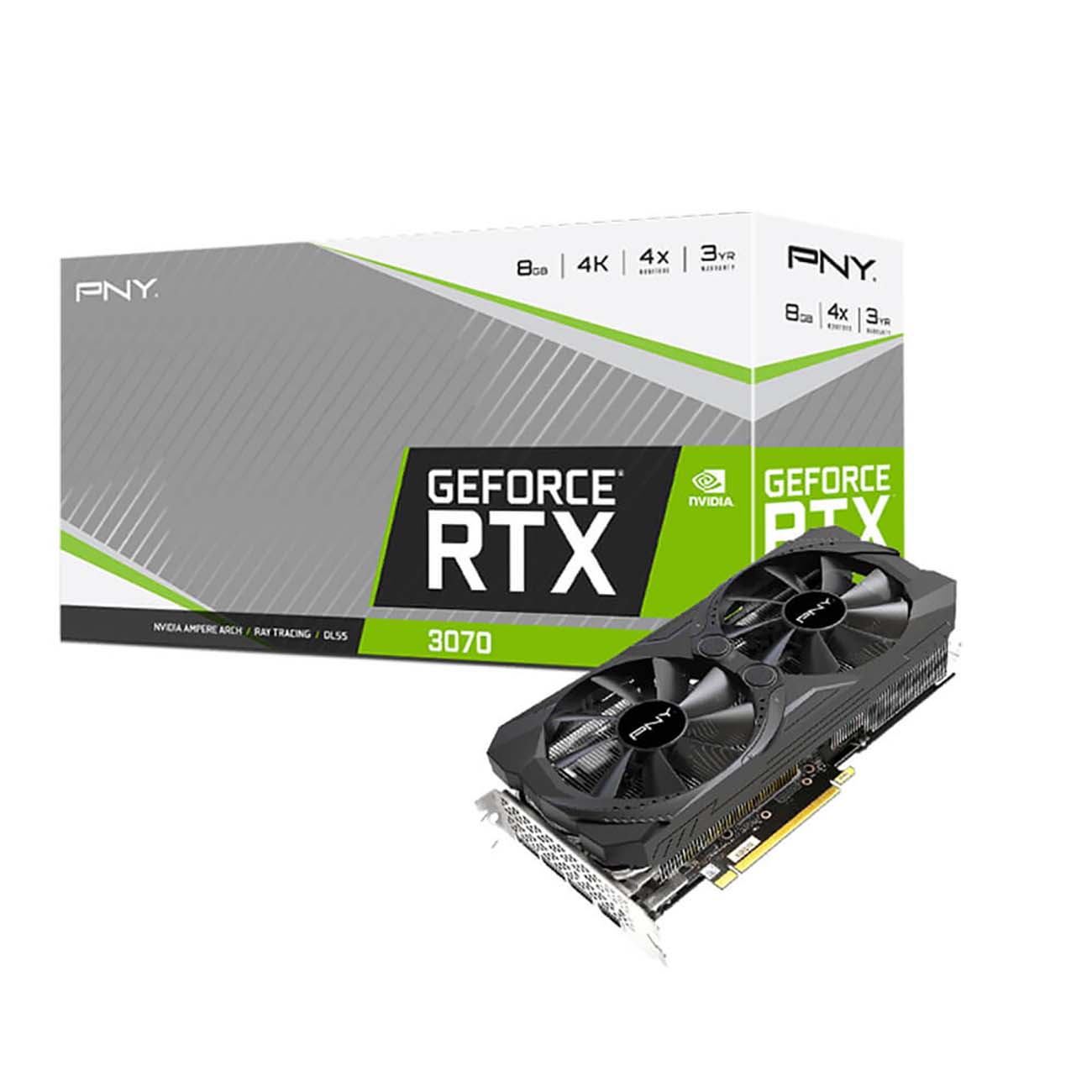 Видеокарта PNY GeForce RTX 3070 Dual Fan с видеопамятью объемом 8 Гб (тип GDDR6) — модель с частотой графического процессора 1725 МГц, которая подходит для запуска игр последних лет, работы с графическим ПО и обработки видео в разрешении до 8К. Она основана на базе Ampere и оснащена улучшенными ядрами для трассировки лучей. Благодаря этому в играх создается реалистичное освещение, тени и отражения. Новые потоковые мультипроцессоры в сочетании с тензорными ядрами обеспечивают необходимую производительность даже для самых требовательных игр. Количество универсальных процессоров достигает 5888.