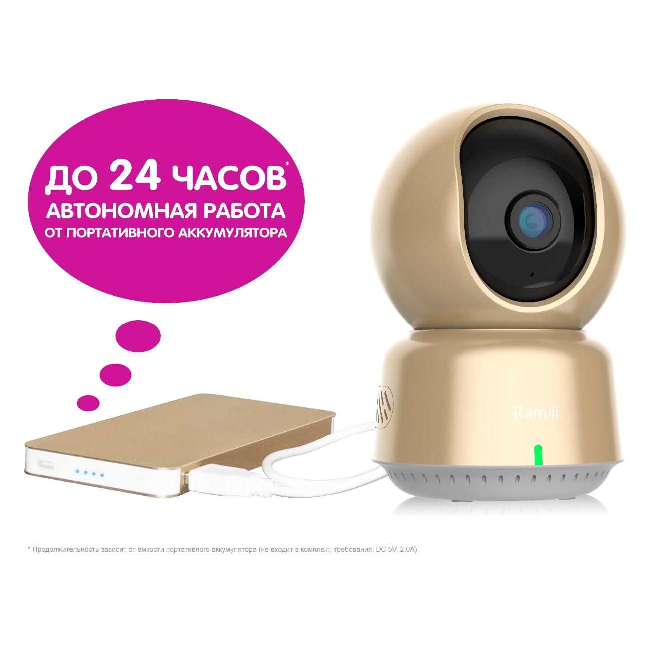 Видеоняня Ramili работает от сети или от обычного портативного аккумулятора (Power Bank, объём 10 000 mAh обеспечивает автономную работу камеры до 24 часов, продолжительность зависит от интенсивности и режима использования);