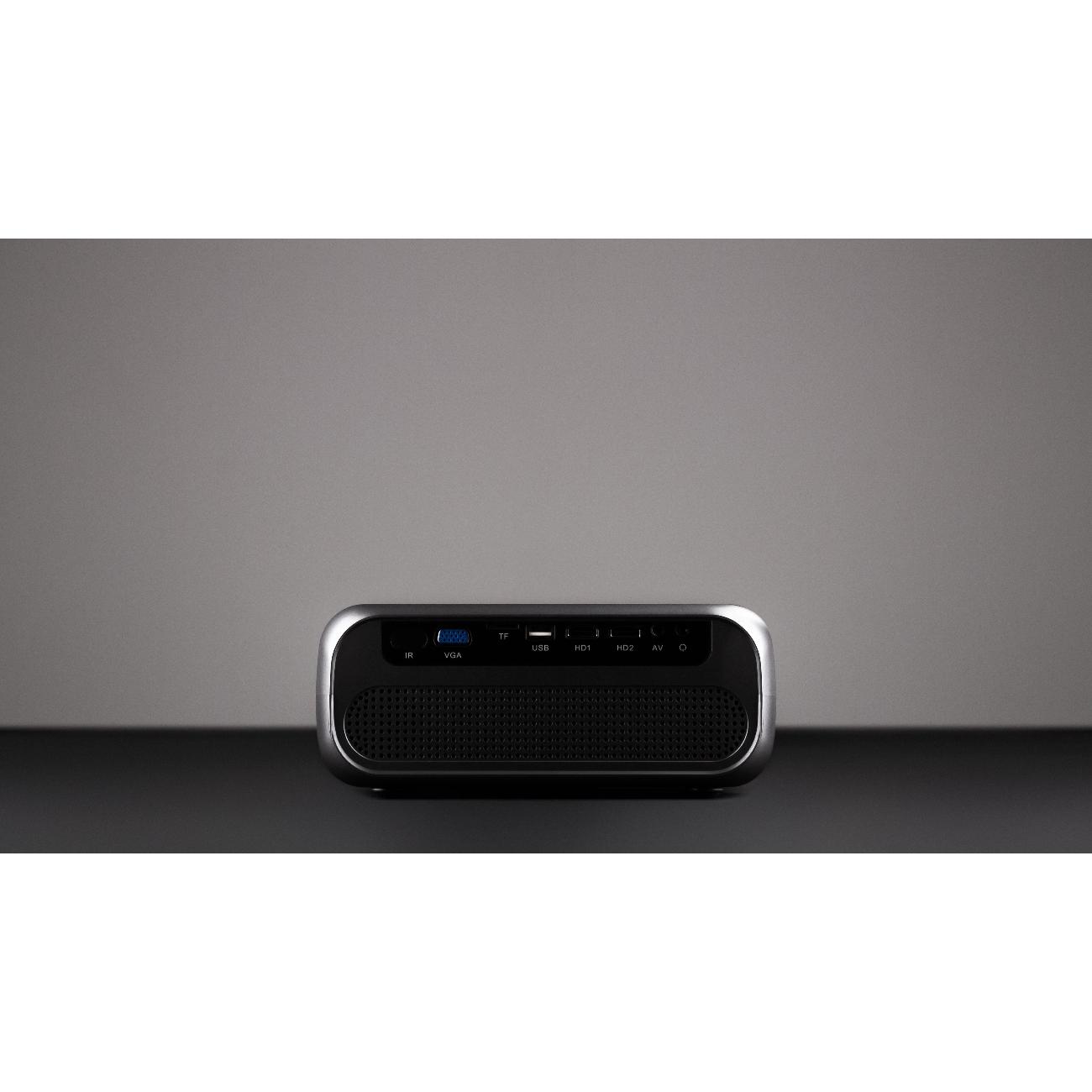 Встроенная акустическая система представлена фронтальными динамиками мощностью 5 Вт. Корпус изготовлен из полиэстера и пластика. Трапеция корректируется по вертикали и горизонтали. Установлена ОС Android версии 9.0 TV OS. Устройством можно дистанционно управлять при помощи пульта ДУ, работающего от трех батарей типа AAA (LR6), которые приобретаются отдельно. В комплекте поставляется AV-кабель (3 RCA) и кабель для цифрового подключения (HDMI). Габаритные размеры устройства — 9,8х23.5х19 см. Вес равен 1,64 кг.