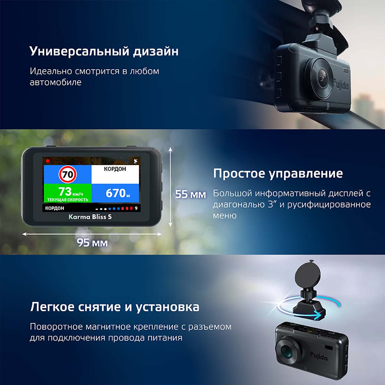 Видеорегистратор Fujida Karma Bliss S WiFi создает ролики с разрешением 1920х1080 пикселей и скоростью до 60 кадров в секунду. Угол обзора — 170°. Есть датчики движения и удара, режимы ночной съемки и аварийной записи.