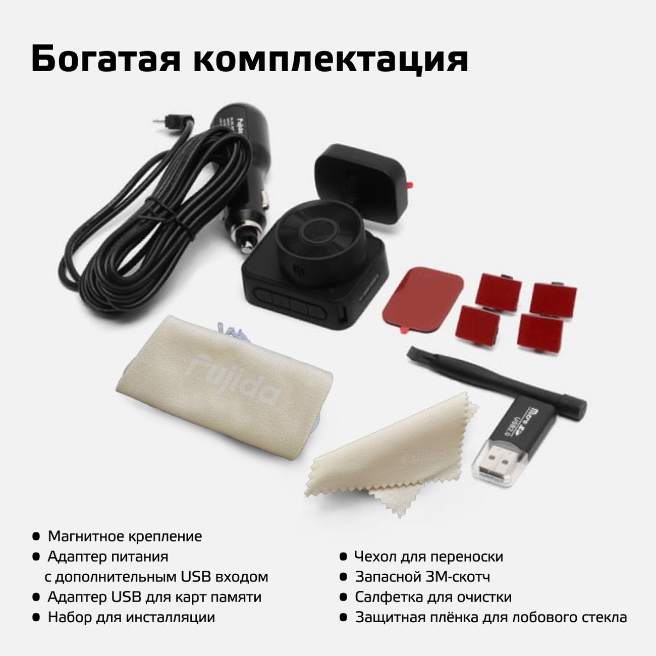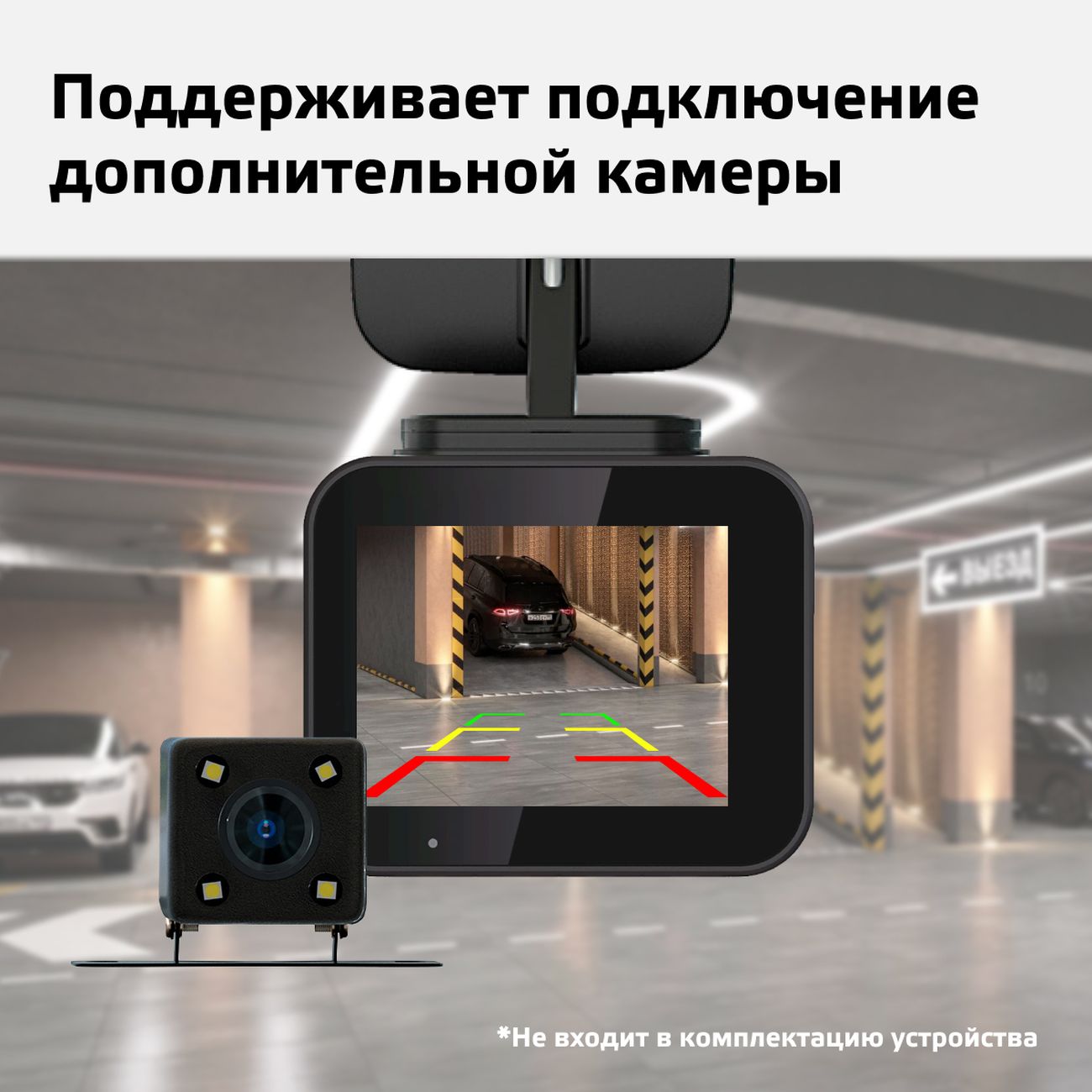 Устройство поддерживает установку карты памяти формата microSDHC, microSDXC или microSD. Питание производится от прикуривателя. Крепление осуществляется на лобовое стекло. В комплект входят кабель для прикуривателя, набор для монтажа. Габаритные размеры видеорегистратора — 4,8х3,5х5,7 см, вес — 50 г.