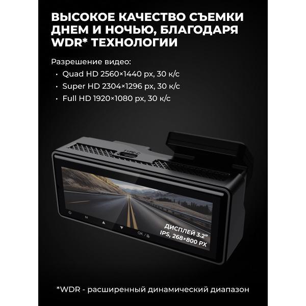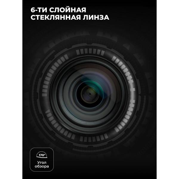 Съемка осуществляется в формате 2560x1440 Пикс. Угол охвата равен 170°. Модель ведет непрерывную запись с фиксацией аудиодорожки. В комплект входит кабель USB, шнур для электроприкуривателя, HDMI и набор для установки.