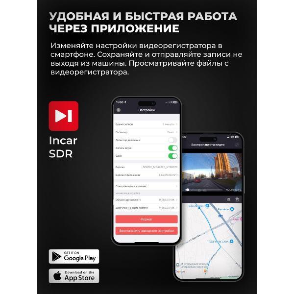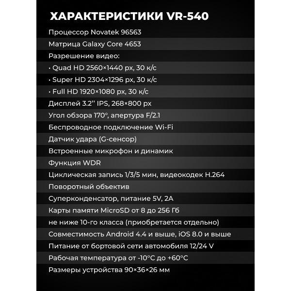 Видеорегистратор Incar VR-540 оснащен модулем Wi-Fi для связи со смартфоном, съемным блоком задней камеры с разрешением FullHD 30 кадр/сек и дисплеем 3,2" с поворотным механизмом, который помогает оценивать ракурс и корректность установки устройства.