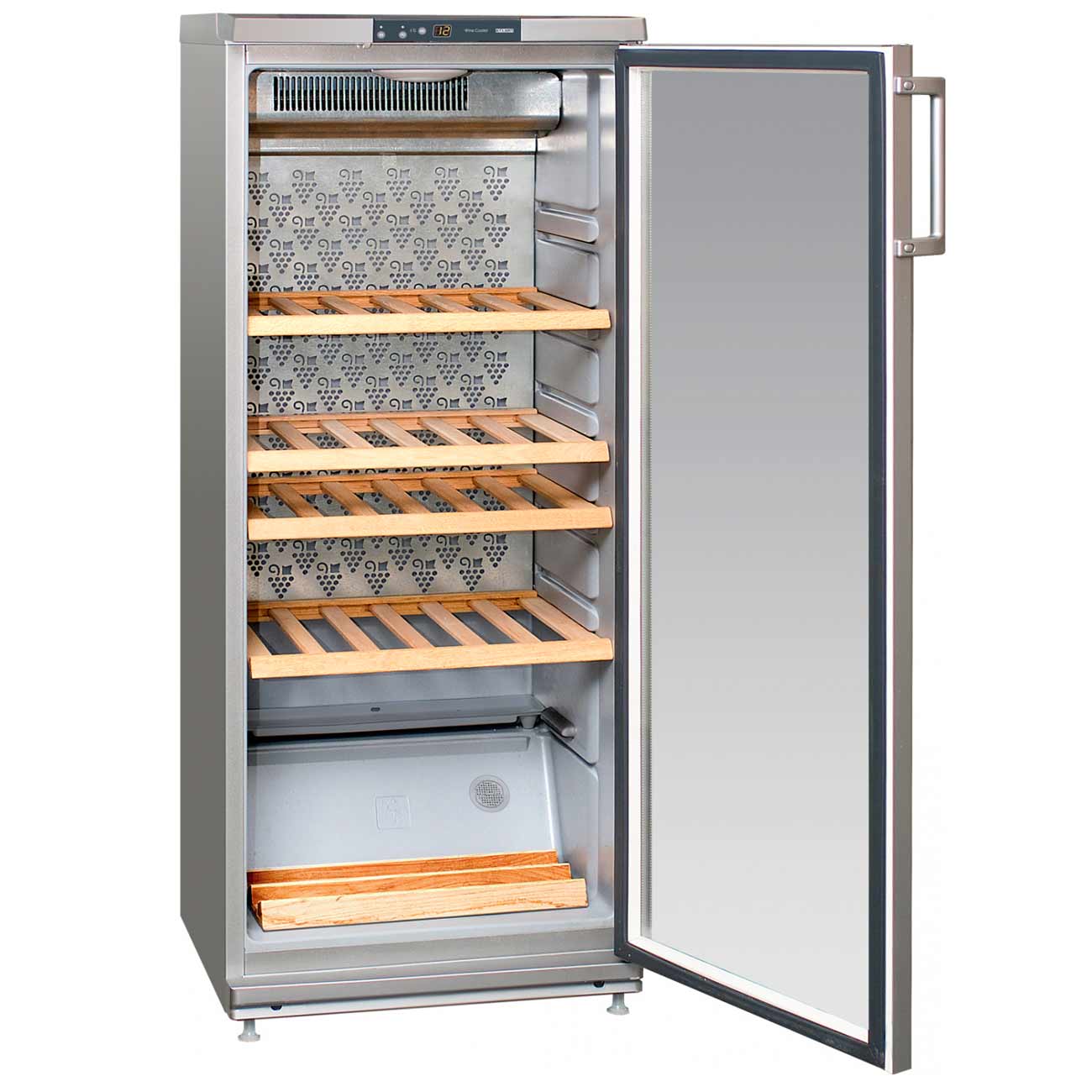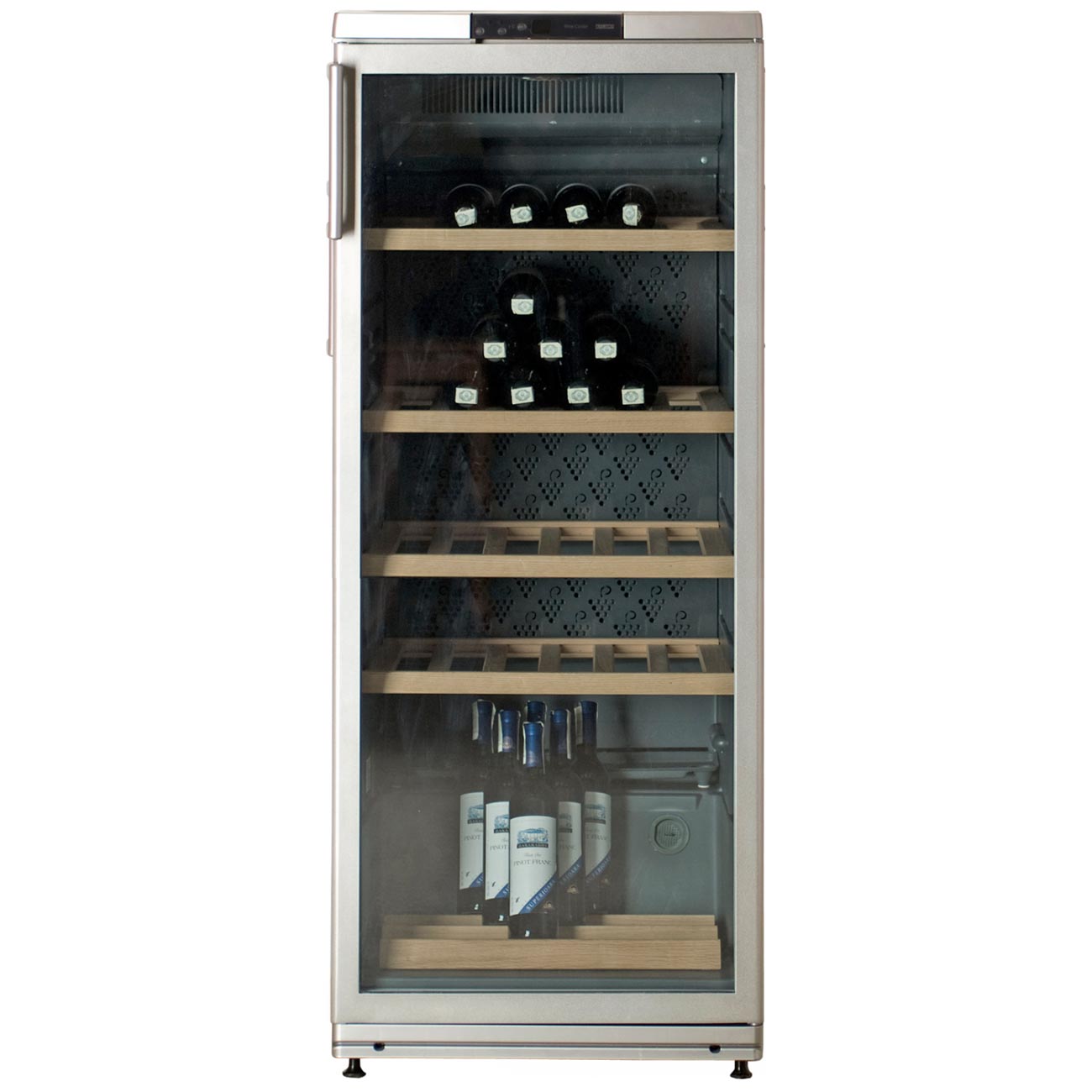 Полки изготовлены из дерева, их можно регулировать по высоте. Электронная панель управления наглядна и удобна. Устройство поддерживает температуру в диапазоне от +6 до +16 градусов. Более тёплый воздух не соберётся вверху камеры, за его равномерное распределение отвечает встроенный вентилятор. Заданные установки отображаются на цифровом дисплее. Внутренняя светодиодная подсветка поможет вам легко найти нужное вино. Она включится, как только вы откроете дверцу. Эффективное устранение запахов обеспечивает угольный фильтр.