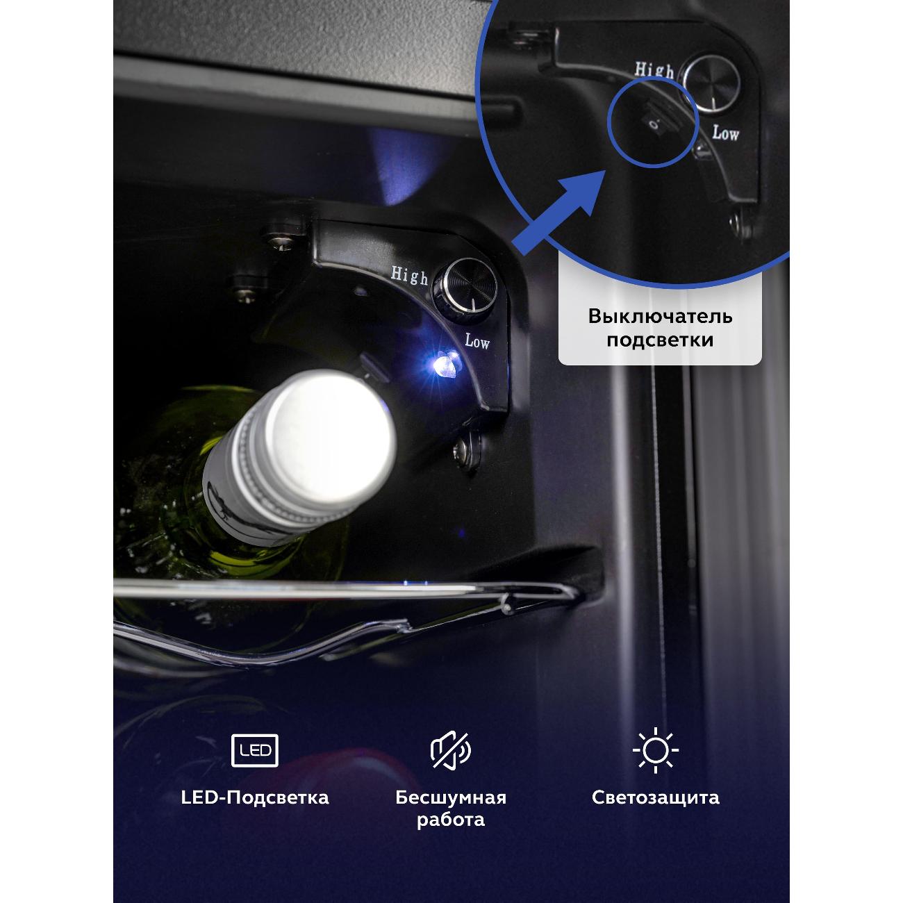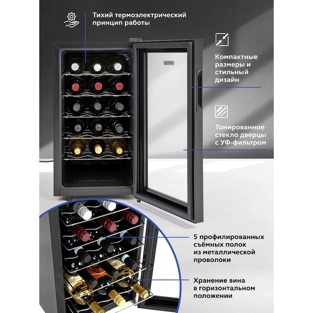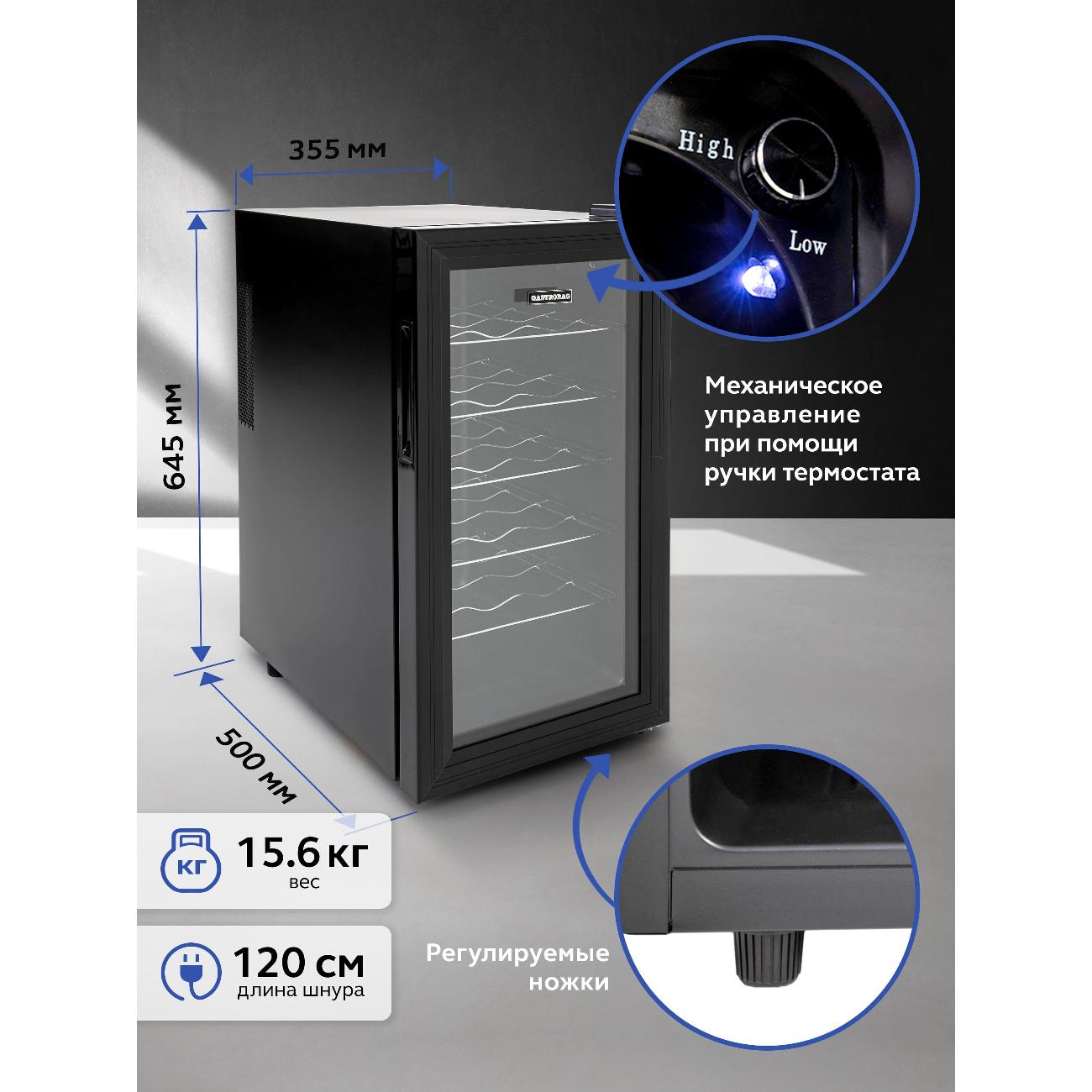 Винный шкаф до 140 см Gastrorag JC-48 отличается наличием единственной температурной зоны. Общий объем равен 48 л, что подходит для хранения 18 бутылок с напитком. Охлаждение поддерживается термоэлектрической системой. В процессе работы устройства сохраняется минимальный уровень шума. Пять внутренних полок выполнены из металла. Пространство модели разделено на шесть отсеков. Для управления параметрами предназначена сенсорная панель. Корпус устройства изготовлен из металла, дверца — из высокопрочного стекла с защитой от УФ-лучей. Внутри реализована светодиодная подсветка.