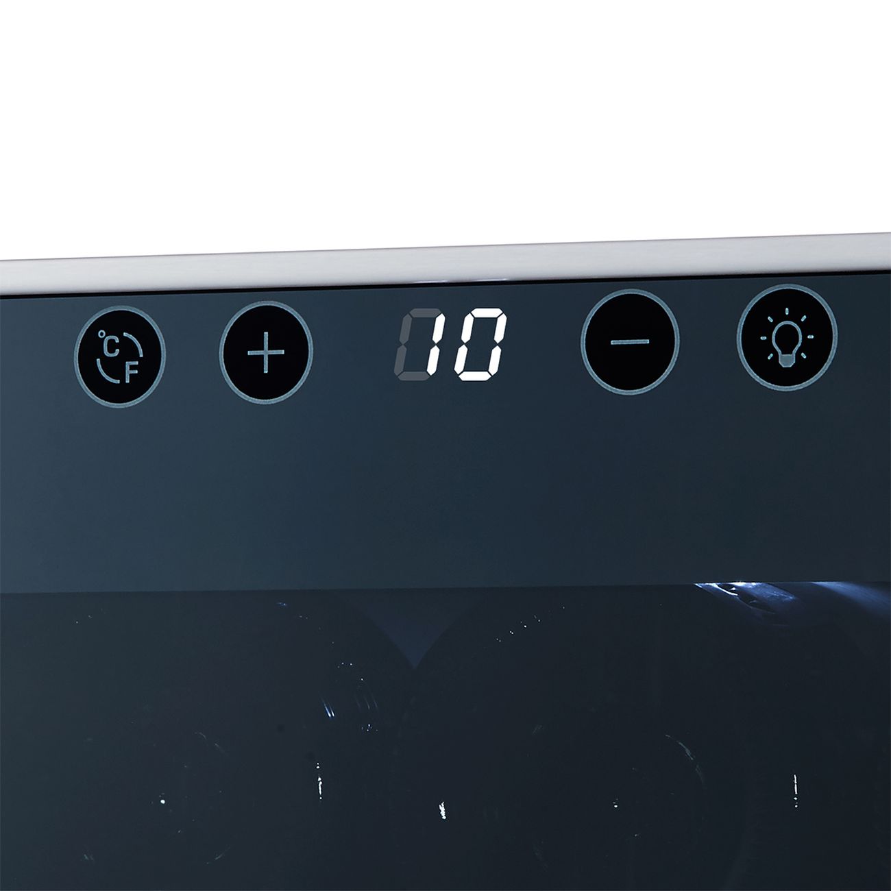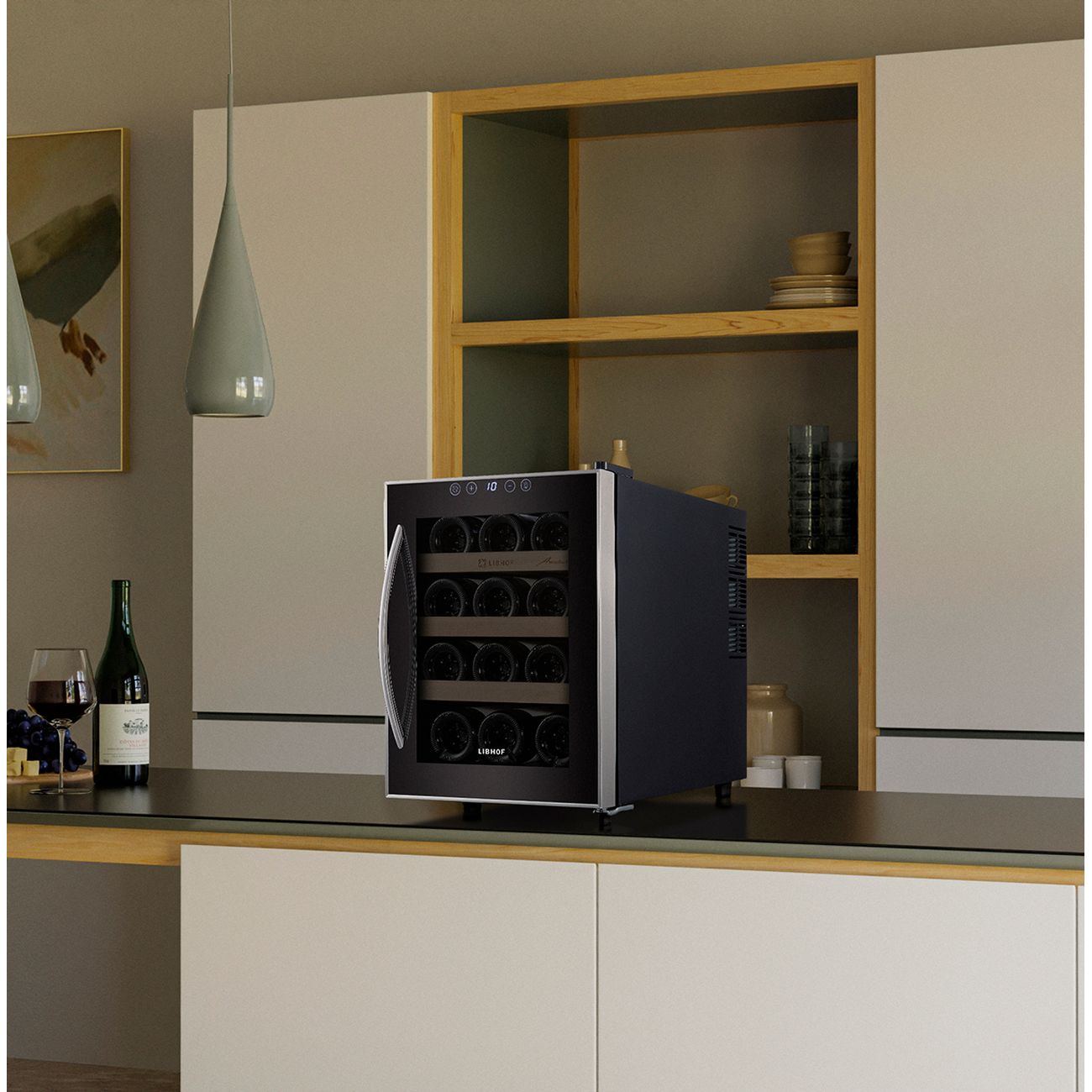 Libhof AM-12 — винный холодильник, работающий по принципу термоэлектрики. Габариты — 34х46,8х51 см. Шкаф снабжен дисплеем и цифровым термометром, чтобы контролировать работу устройства, не прибегая к открытию дверцы. Сенсорные кнопки управления находятся непосредственно на двери. Модель вмещает до 12 бутылок со стандартным объемом 750 мл. Обладает единым температурным пространством с общим объемом 48 л и возможностью температурной регулировки от +10°C до +18°C . Присутствие особого покрытия на стеклянной дверце дает защиту от ультрафиолетовых лучей. Напитки располагаются на пяти съемных буковых полках, которые не реагируют на воздействие влаги. Полностью отсутствует вибрирующий эффект. Шкаф с классом энергоэффективности A+, низким уровнем шума 39 дБ.