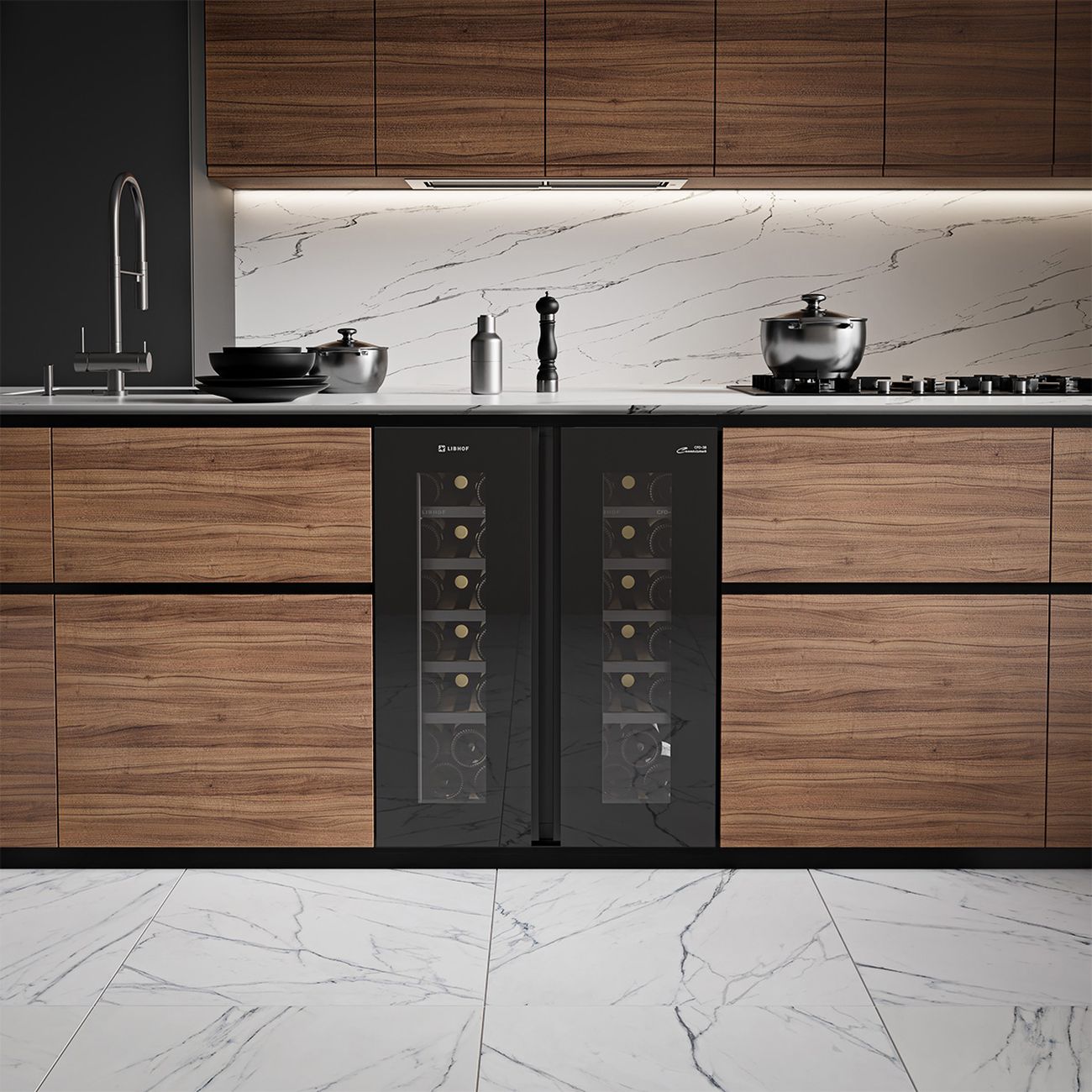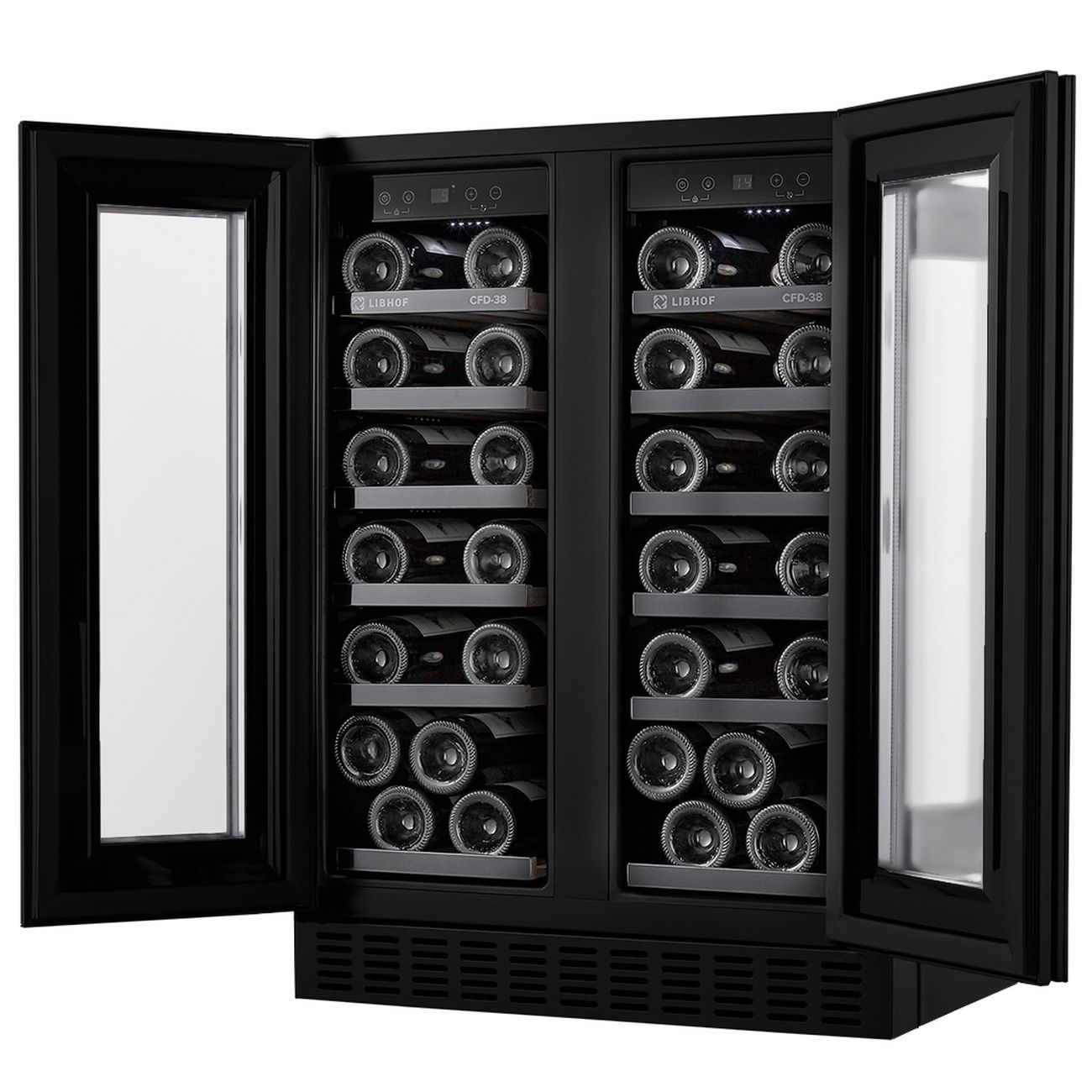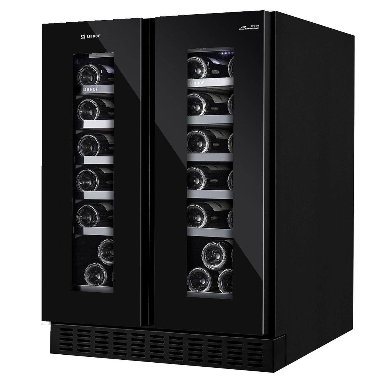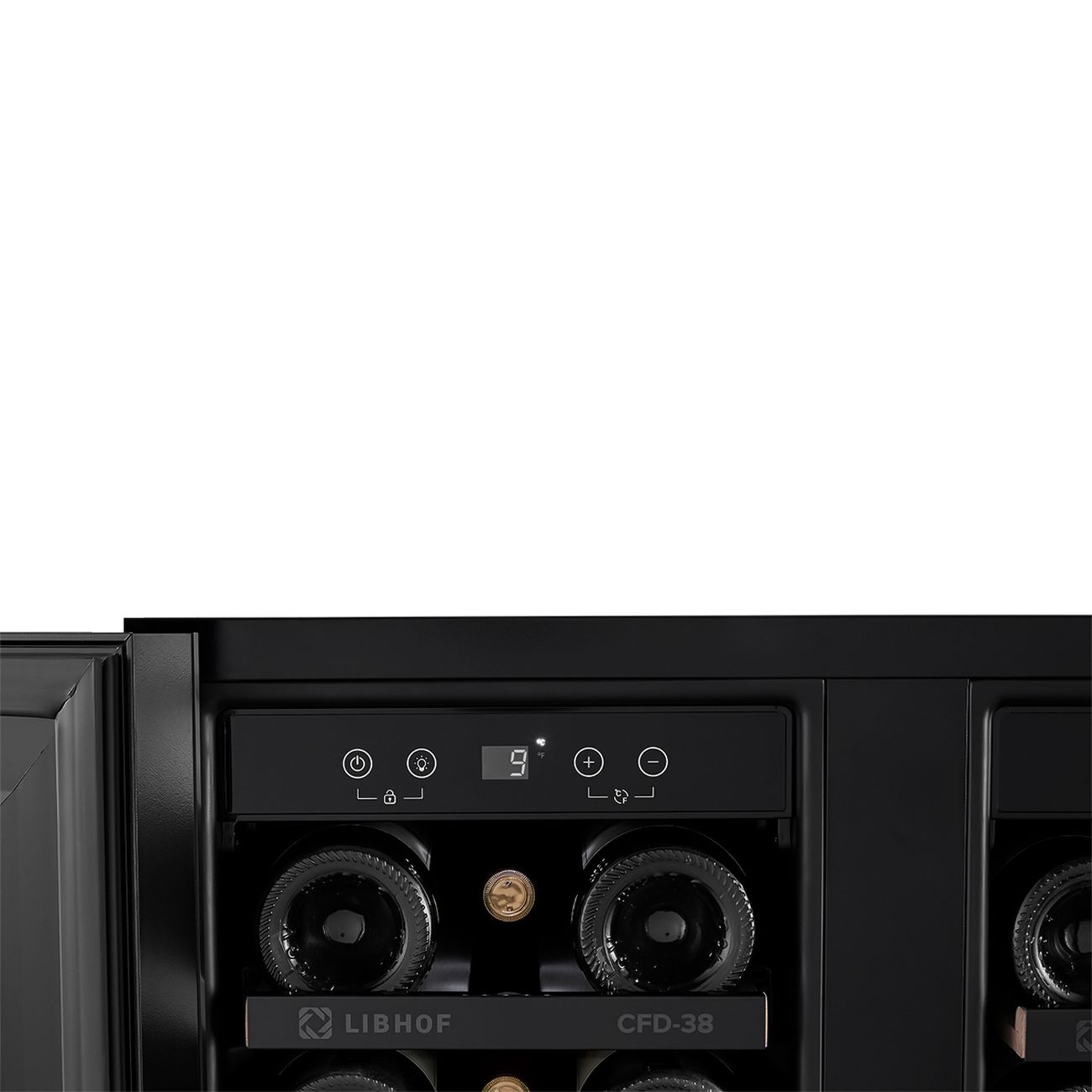 Винный шкаф Libhof CFD-38 Black с корпусом черного цвета рассчитан на 38 стандартных бутылок, которые можно распределить по 12 деревянным полкам. Модель имеет возможность встраивания. Внутреннее пространство разделено на две зоны. Для каждой из них устанавливается свой уровень температуры, это позволяет хранить напитки, которым требуются разные условия.