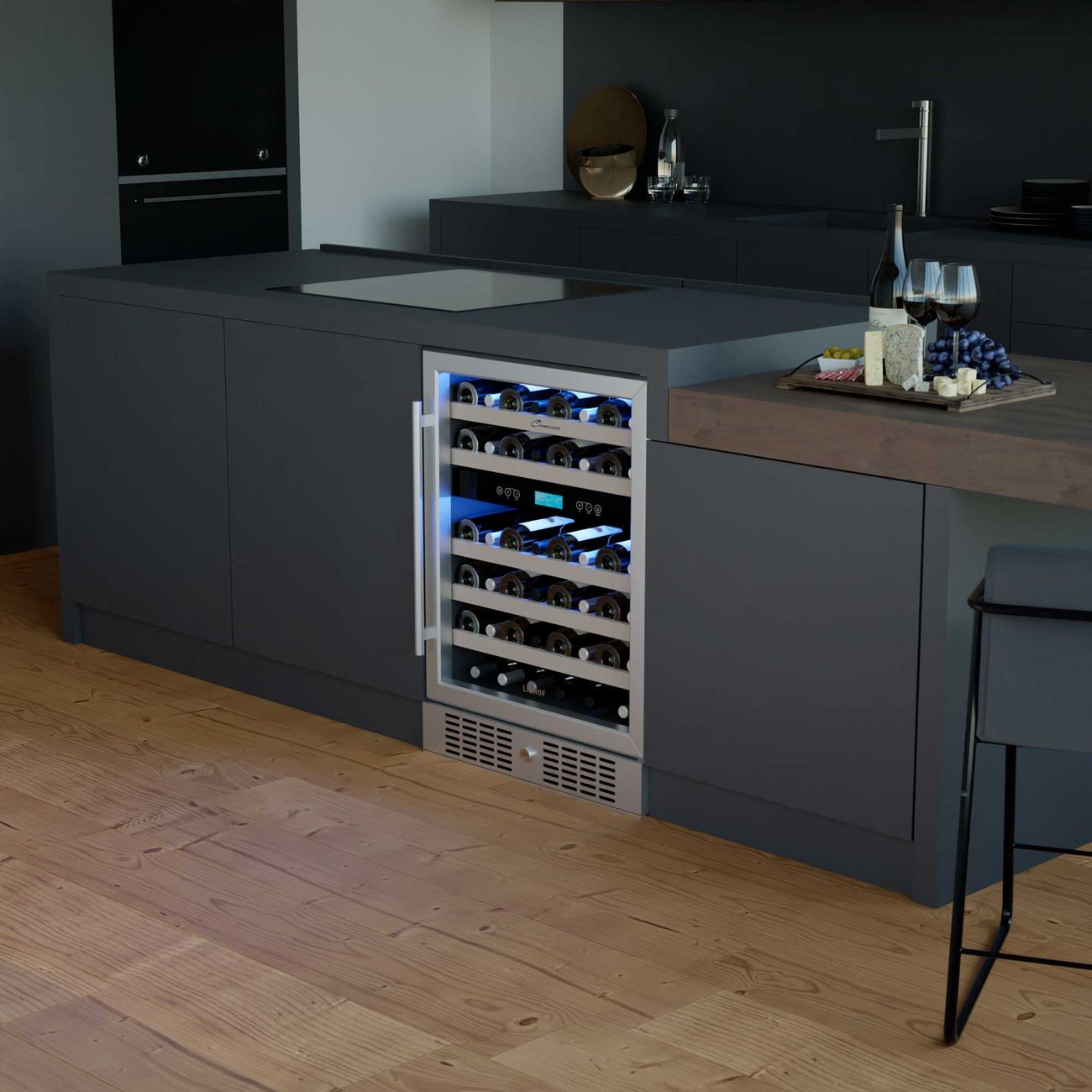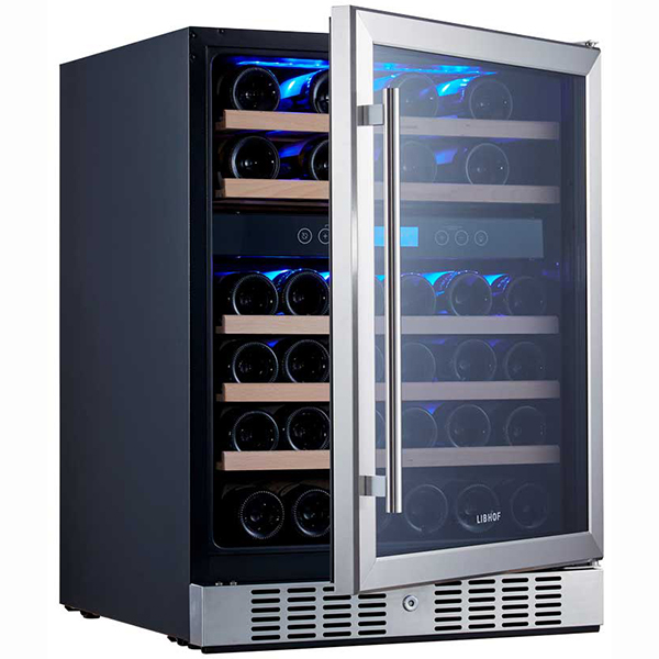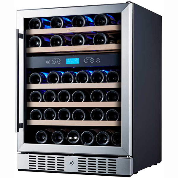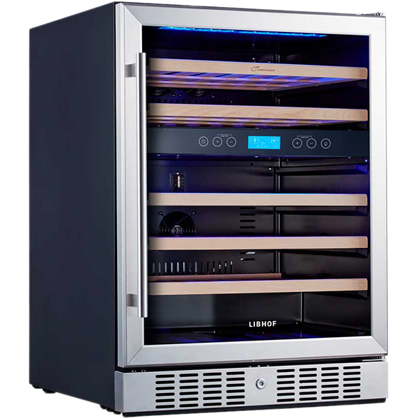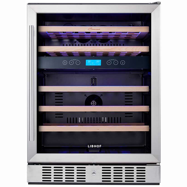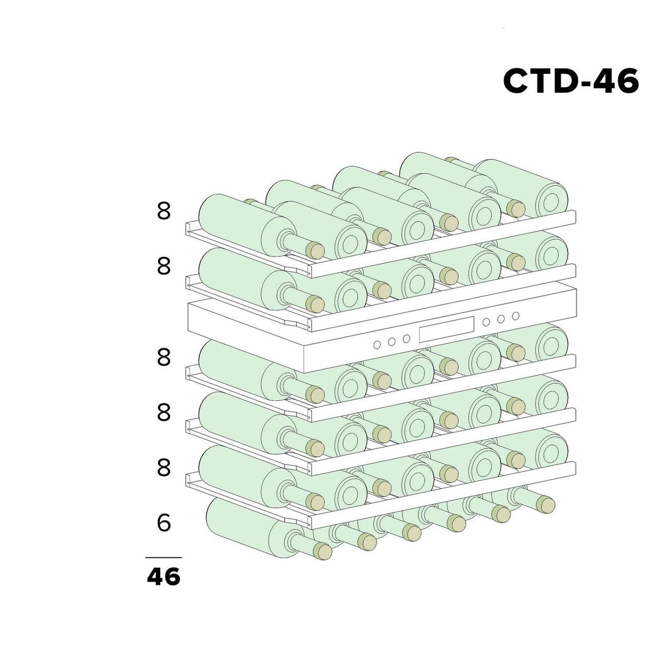 Libhof CTD-46 — компрессорный холодильник для хранения вин. Модель встраивается в нишу и обладает габаритами 59,5 х 82 х 57 см. Шкаф выполнен в металлическом корпусе. Вмещает до 46 бутылок со стандартным объемом 750 мл. Обладает двумя внутренними пространствами для хранения общим объемом 138 л с возможностью температурной регулировки от +8 до +18°. Класс энергоэффективности у модели G, вибрации сведены к минимуму, низкий уровень шума 41 дБ. Вино располагается на пяти буковых полках. «Зимний режим» дает возможность установки прибора даже в холодных помещениях. Мощность модели — 90 Вт.