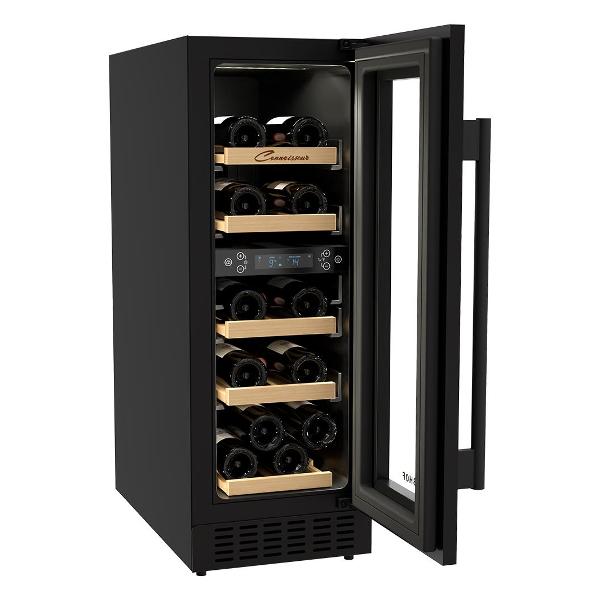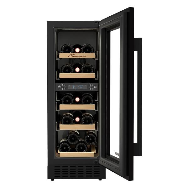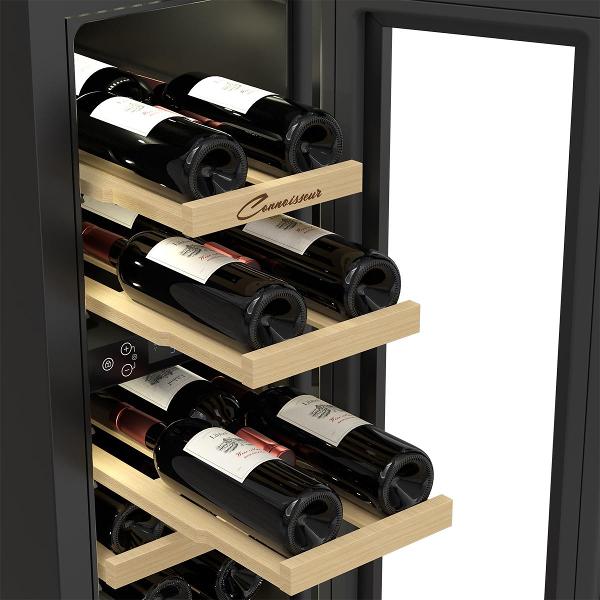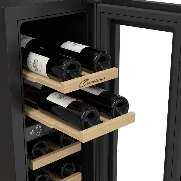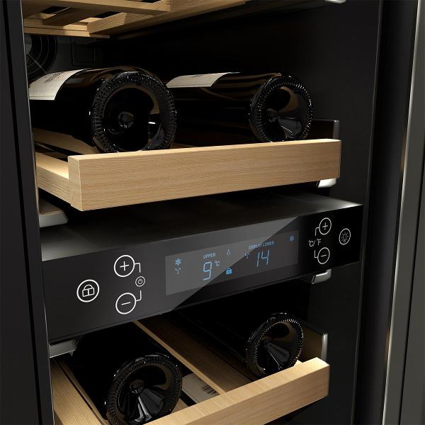 Управление производится при помощи сенсорной панели, два дисплея отображают параметры работы. Бутылки размещаются на пяти прочных полках, выполненных из натурального дерева — массива бука. Равномерное распределение воздуха обеспечивает встроенный вентилятор.