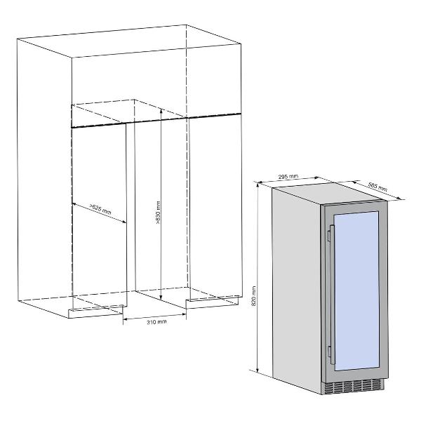Корпус выполнен из металла, для обзора содержимого дверь снабжена тонированным стеклом. При необходимости ее можно перенавесить, чтобы изменить направление открывания. Габариты винного шкафа: 29,5х82х58,5 см, вес — 30 кг.
