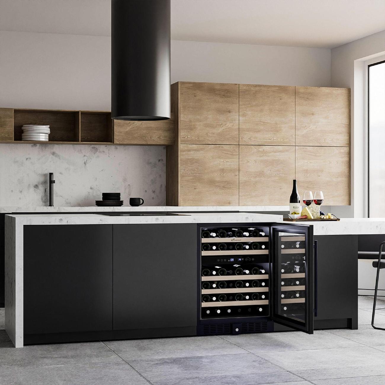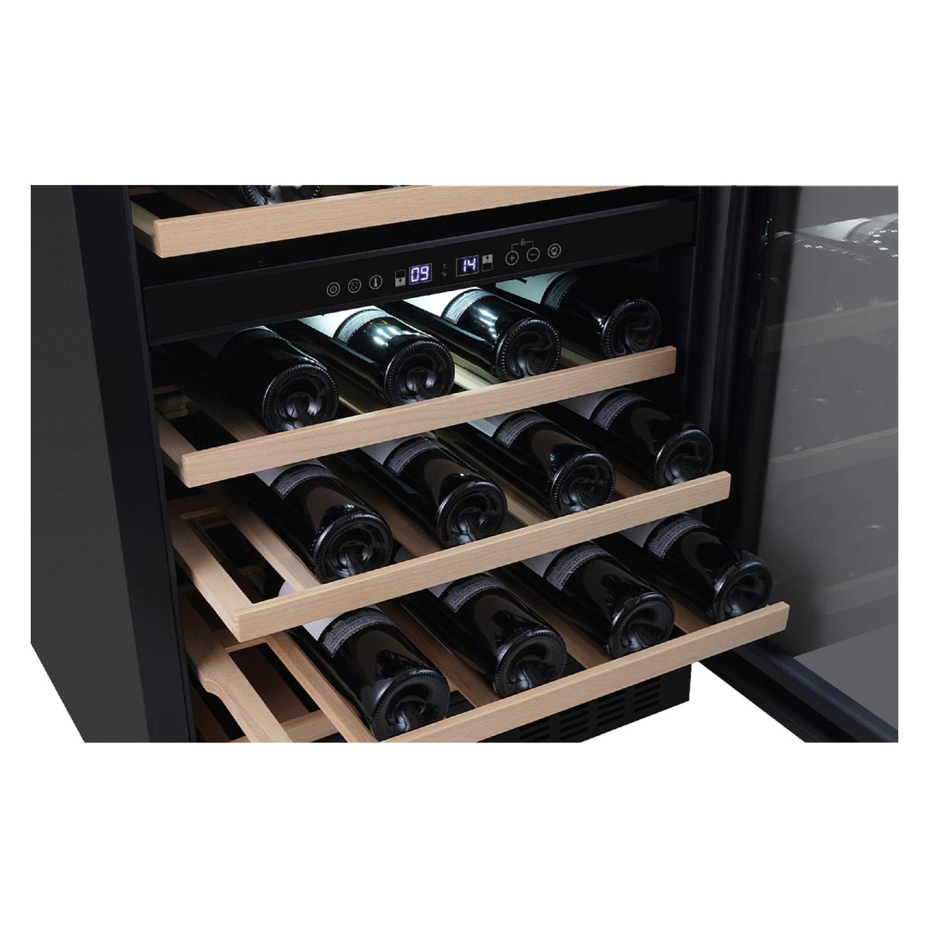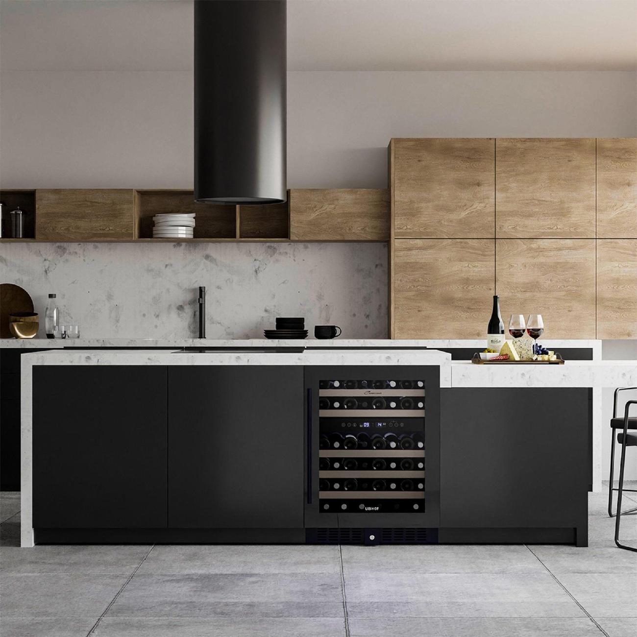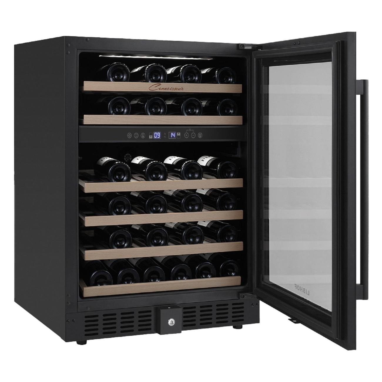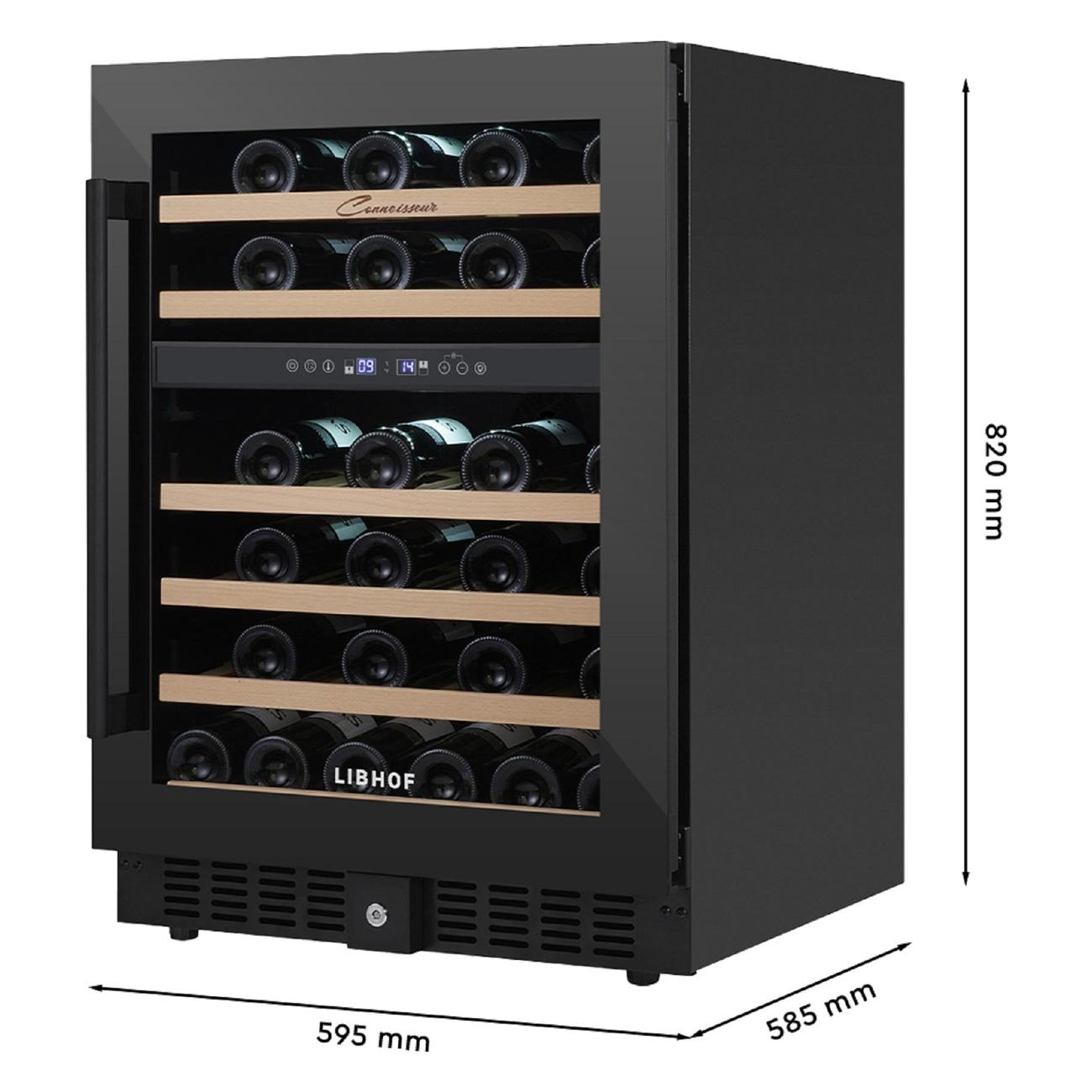 Винный шкаф Libhof CXD-46, черный объемом 145 л рассчитан на 46 бутылок. Модель предназначена для встраивания. У прибора две зоны, температуру в них можно установить в диапазоне от от 5°С до 12°С и от 12°С до 20°С, что позволит хранить вина разных сортов. Бутылки располагаются на шести полках, выполненных из бука. Хороший обзор обеспечивает светодиодная подсветка. Угольный фильтр освежает воздух и предотвращает появление неприятного запаха. Панель управления сенсорная, оснащена цифровым дисплеем. Шкаф оборудован современным компрессором с пониженным уровнем вибрации. Уровень шума при работе не превышает 40 дБ. Дверца с защитой от ультрафиолета. Оснащена внутренними петлями, может быть перенавешена. Размеры прибора: 59,5х82х58,5 см, вес — 46 кг.