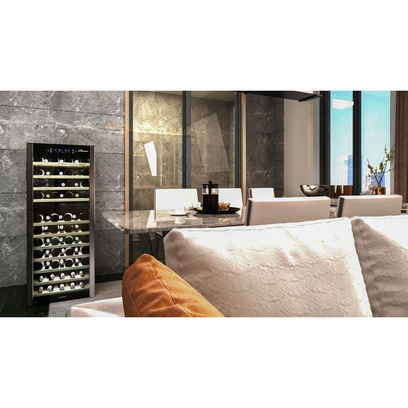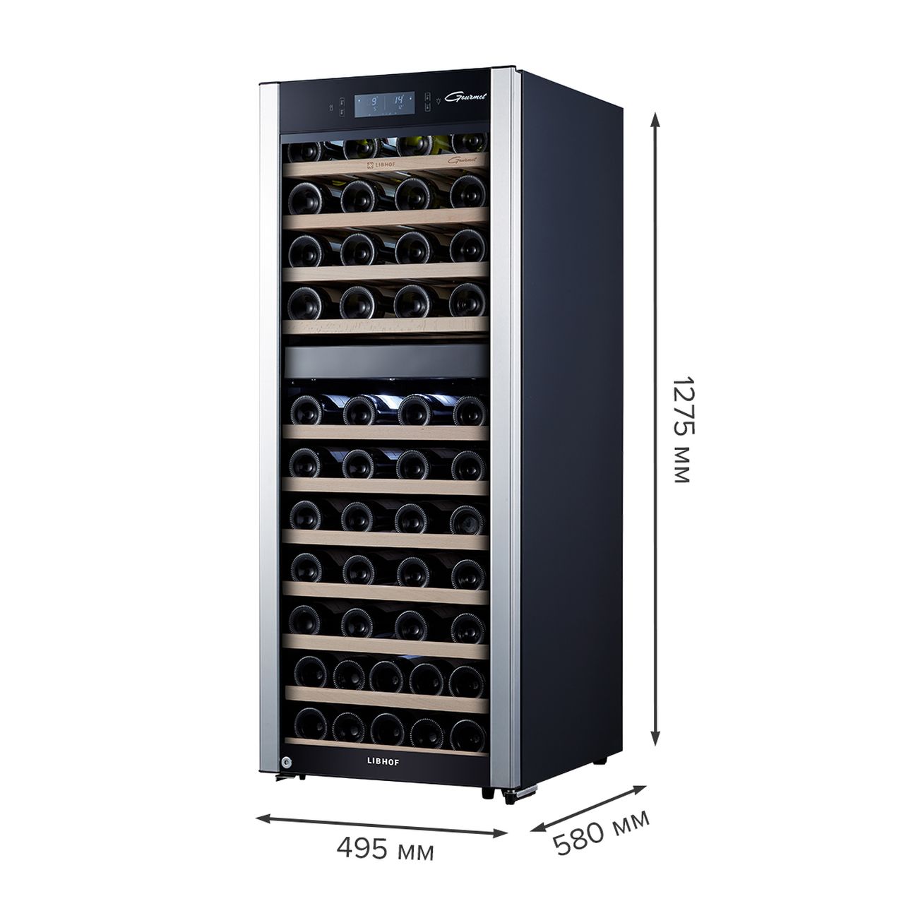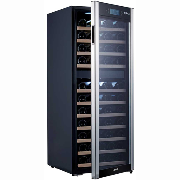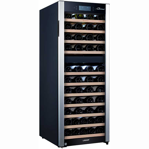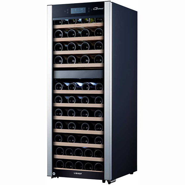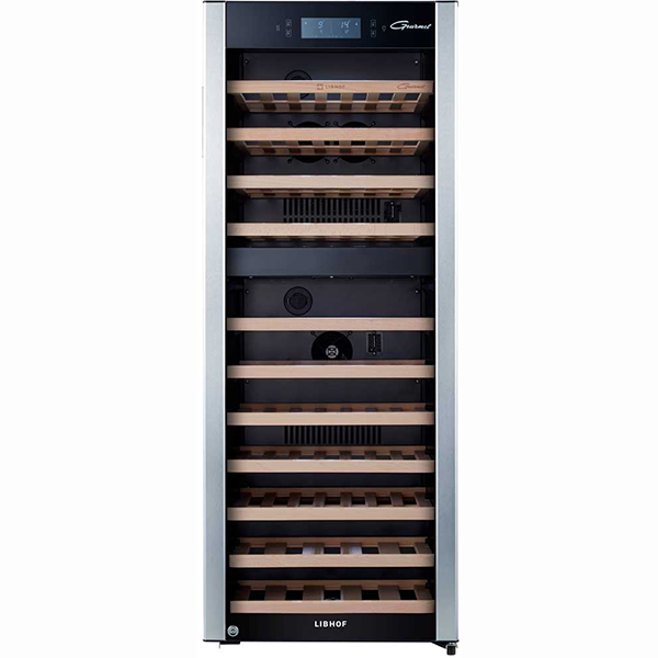 Libhof Gourmet GPD-73 Premium — отдельностоящий винный холодильник премиум-класса. Размеры модели — 49,5 х 127,5 х 58 см. Шкаф выполнен в корпусе из металла с белой подсветкой внутри. Вмещает до 73 бутылок стандартным объемом 750 мл. Прибор оснащен специальной программой обогрева, которая отвечает за сохранность нужной температуры внутри холодильника, даже если в помещении похолодает. Мощность модели — 90 В, уровень шума — 41 дБ. Полностью отсутствует вибрирующий эффект. Обладает двумя внутренними пространствами для хранения с общим объемом 192 л и возможностью температурной регулировки от +5 до +18°. Внутри вино располагается на 11 деревянных полках, устойчивых к влаге и обеспечивающих нужный уровень обзора винной коллекции. Присутствует угольный фильтр, чтобы устранять посторонние запахи. Встроенный вентилятор отвечает за равномерное распределение температуры внутри устройства. Шкаф с классом энергоэффективности G.