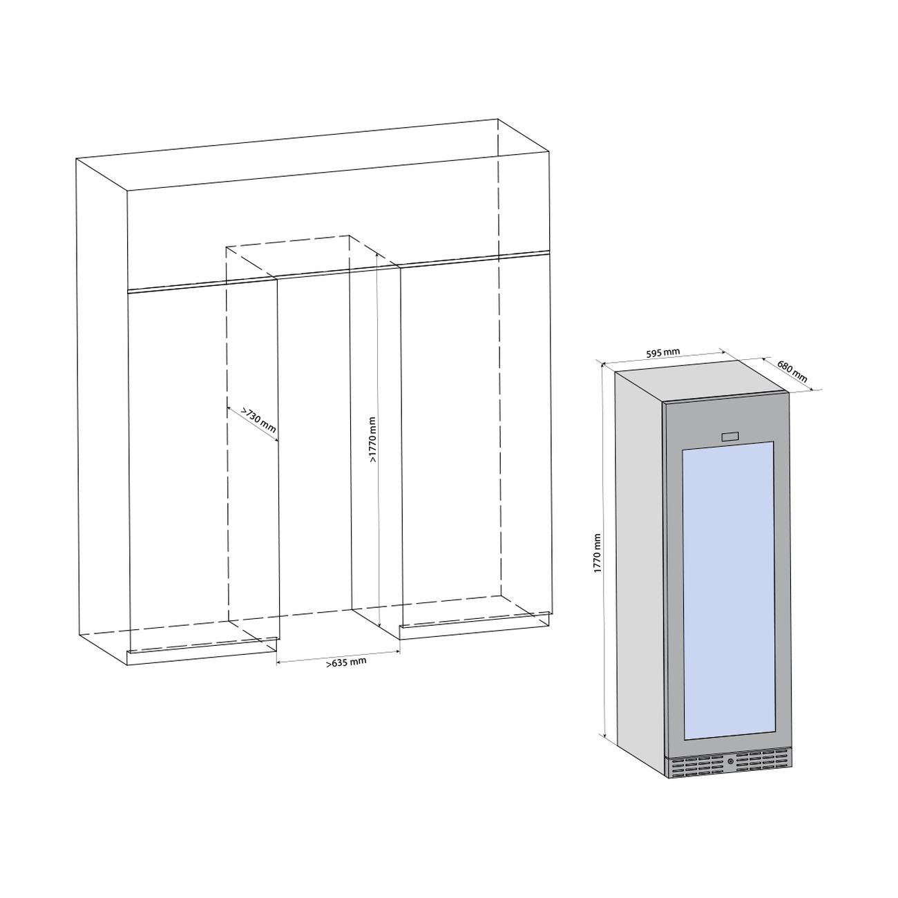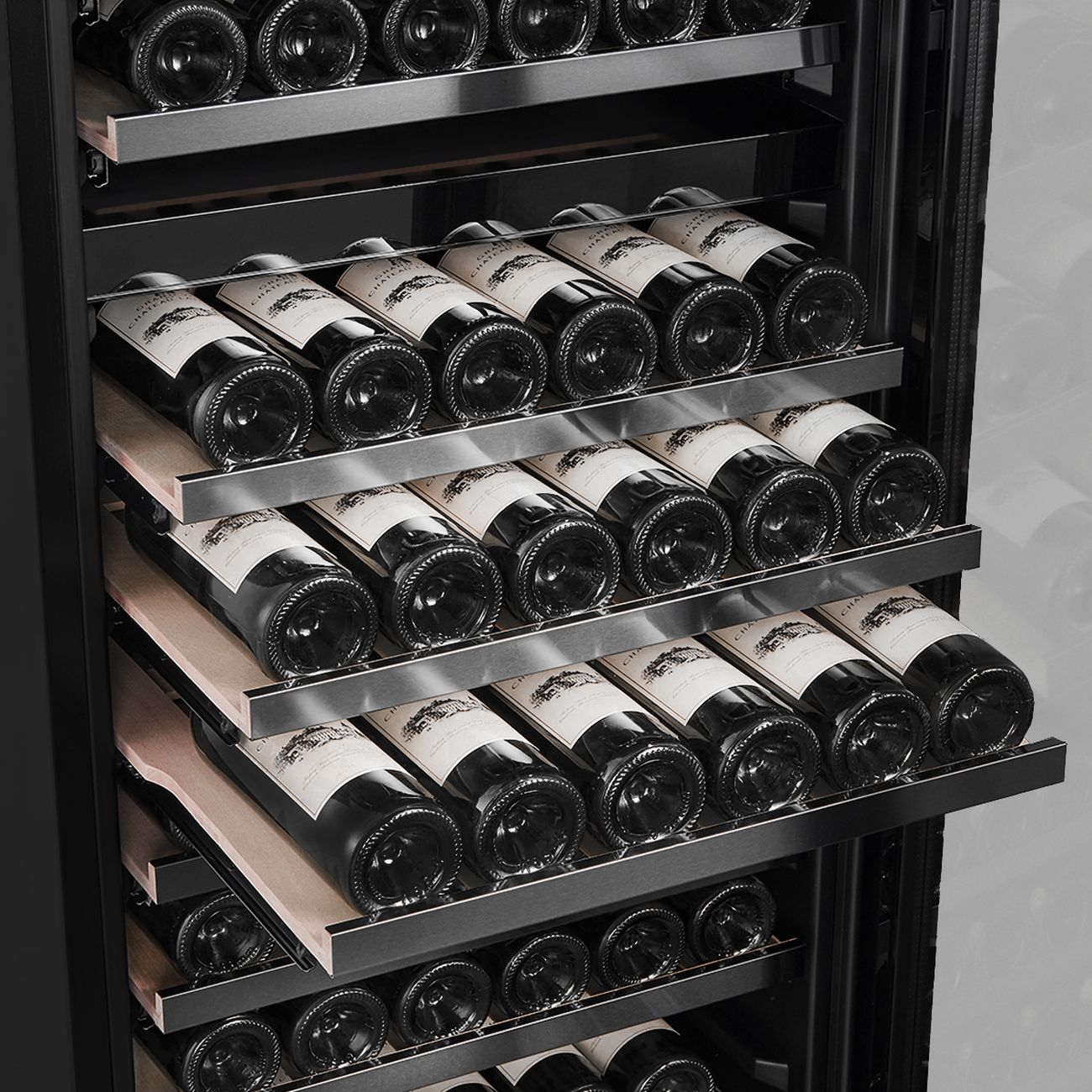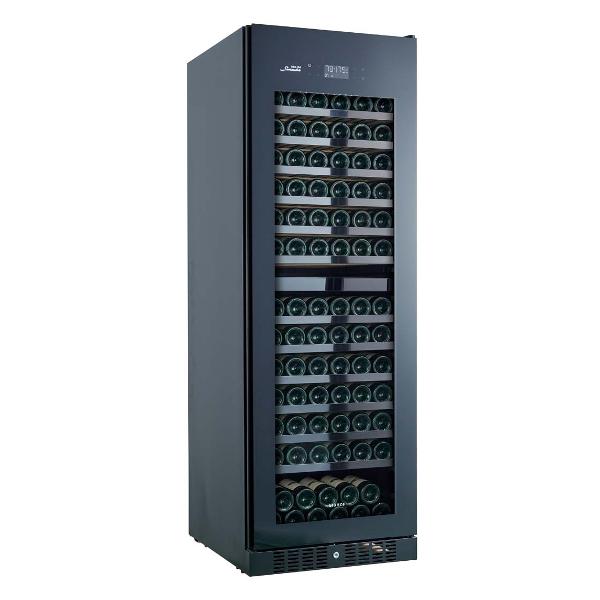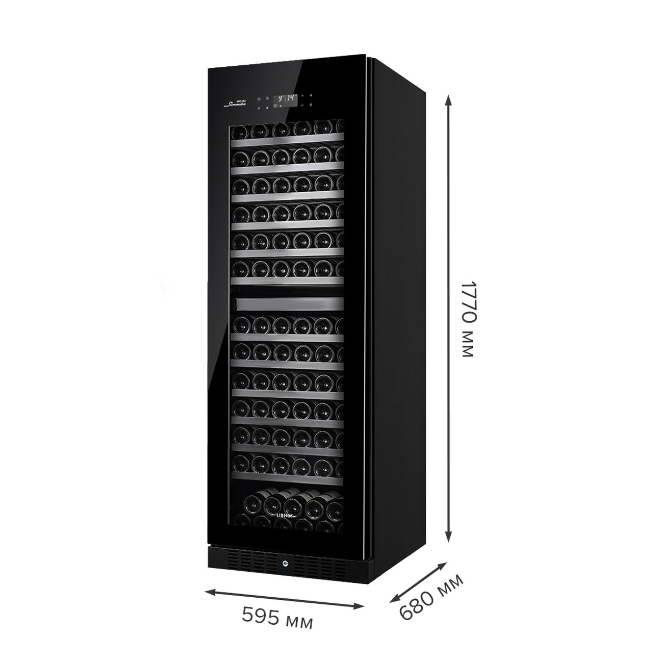 Объем — 418 л. 14 деревянных полок с решетками из металла позволяют хранить до 164 стандартных бутылок. Для регулировки основных параметров служит сенсорная панель, есть функция сохранения настроек в памяти. Доступно LED-освещение и защита от детей. Класс энергоэффективности — G, годовой расход электричества — примерно 177 кВт*ч. Размеры — 177х59,5х68 см.