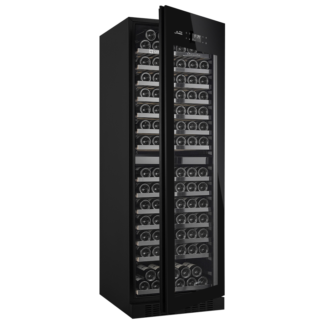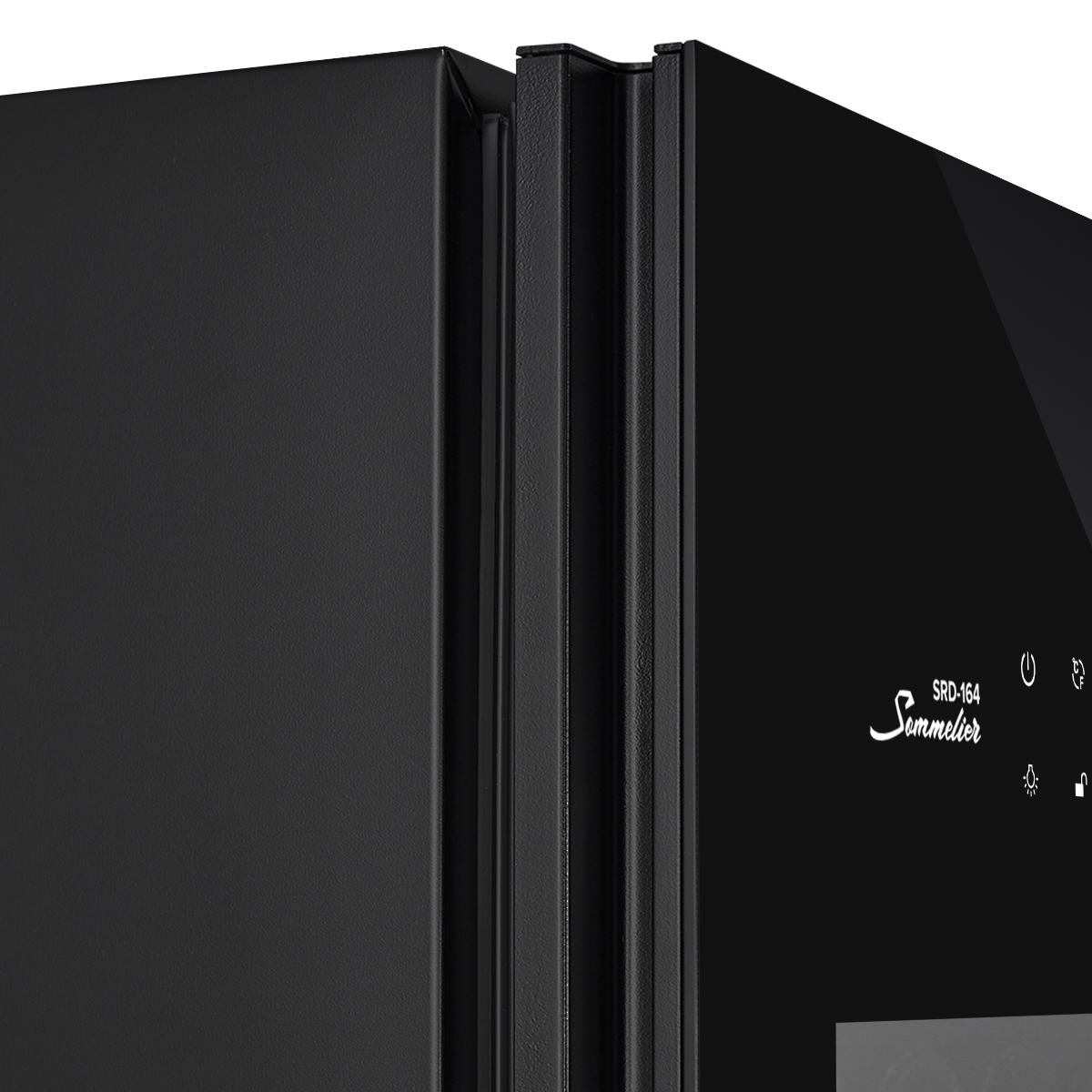 Винный шкаф Libhof SRD-164 Black с корпусом черного цвета оснащен инверторным компрессором и встроенным вентилятором, за счет которого охлажденный воздух равномерно распределяется по камере. Есть угольный фильтр, задерживающий неприятные запахи. Внутреннее пространство разделено на две зоны, в каждой из них устанавливается свой уровень температуры. Винный шкаф можно встроить в стену.
