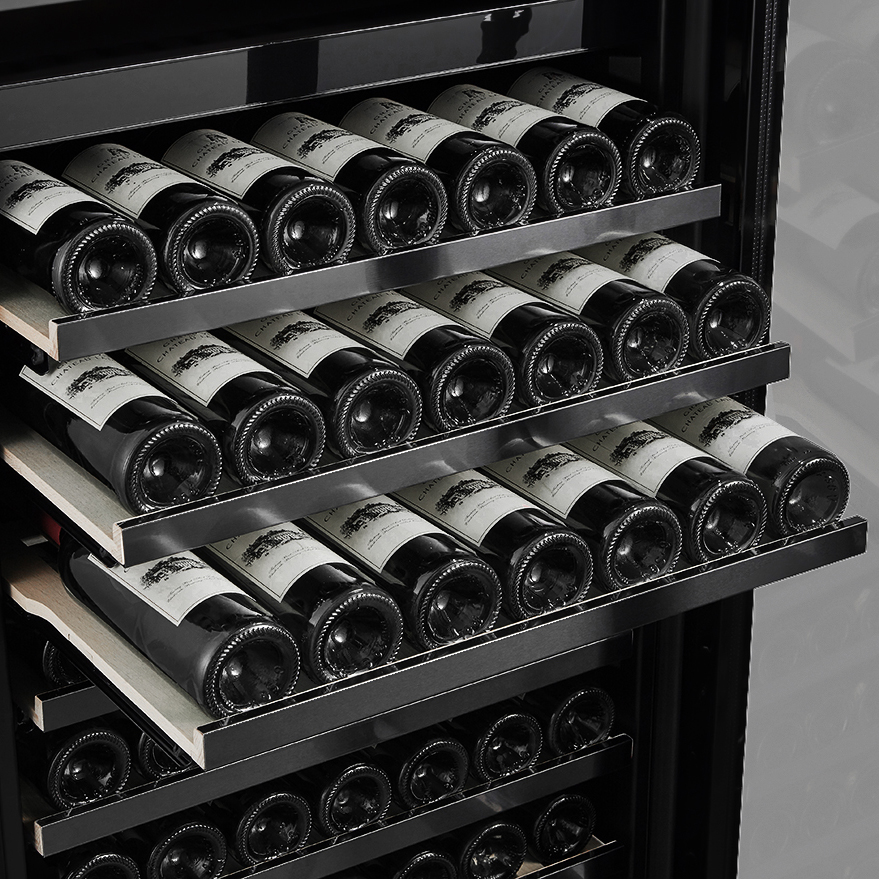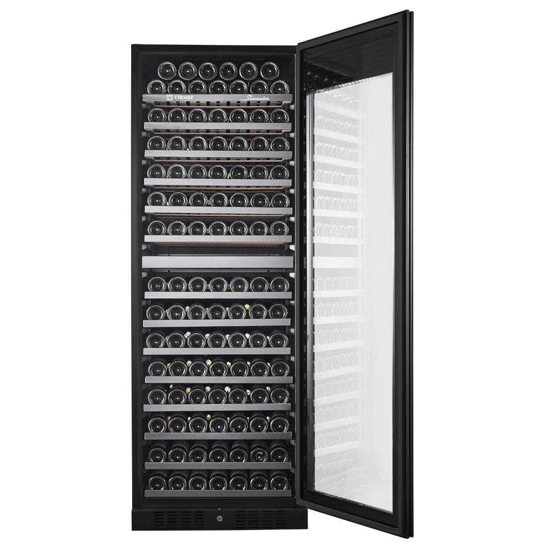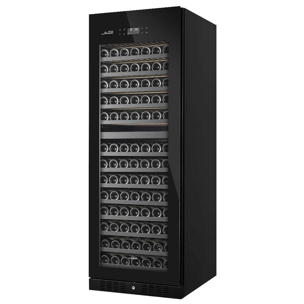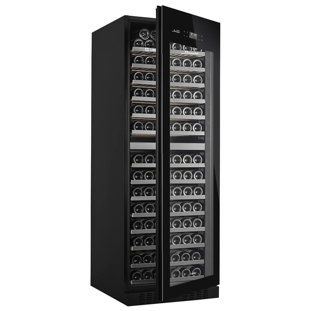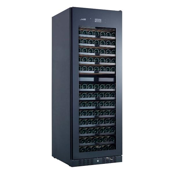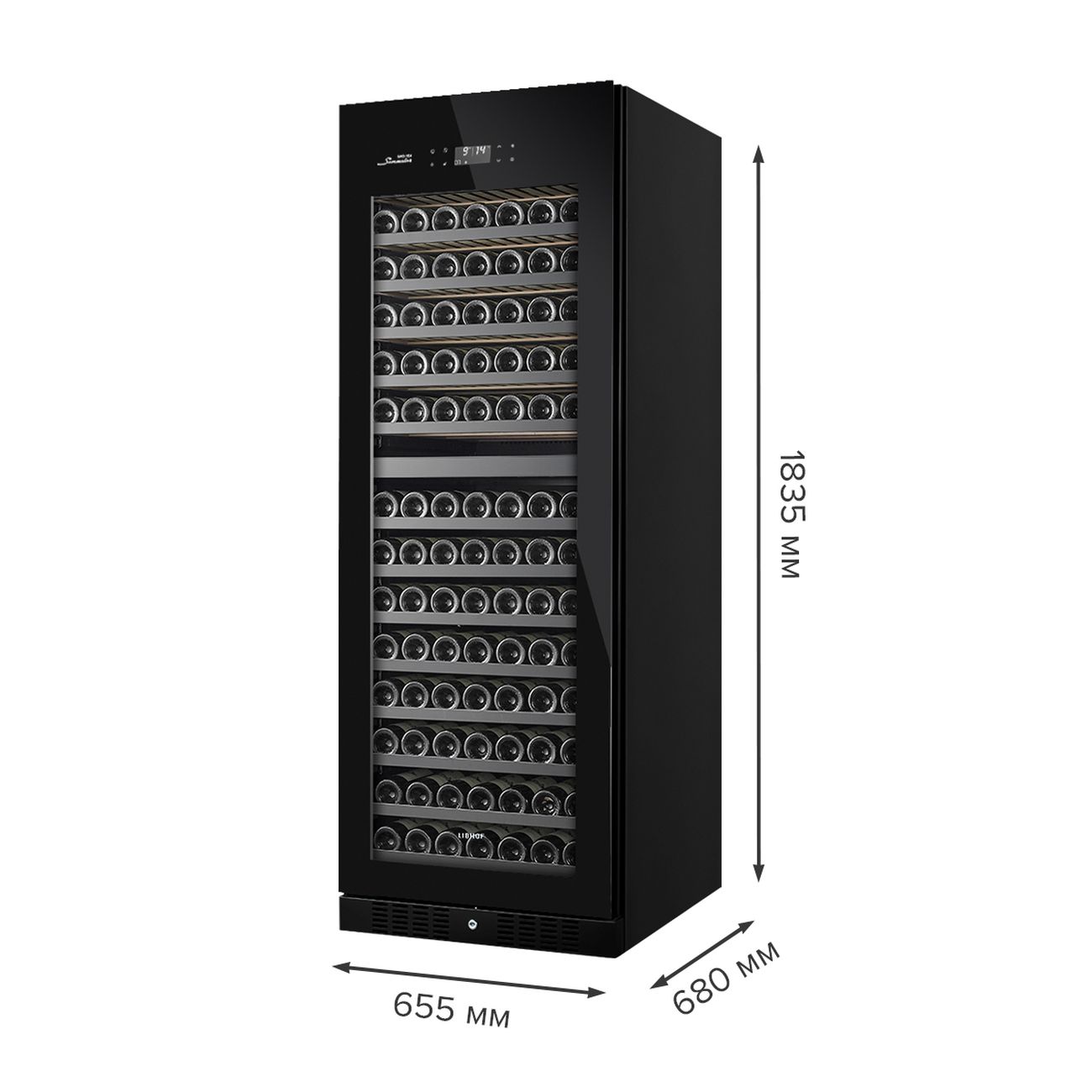 Объем — 482 л. 14 деревянных полок с решетками из металла позволяют хранить до 181 стандартной бутылки. Для регулировки основных параметров служит сенсорная панель, есть функция сохранения настроек в памяти. Также есть возможность встраивания винного шкафа в стену. Доступно LED-освещение и защита от детей. Класс энергоэффективности — F, годовой расход электричества — примерно 186 кВт*ч. Размеры — 183,5х65,5х68 см.