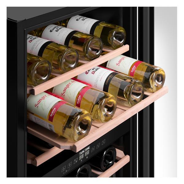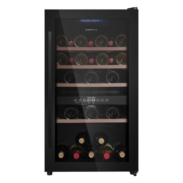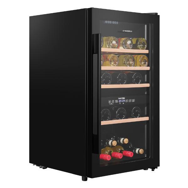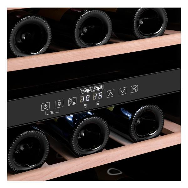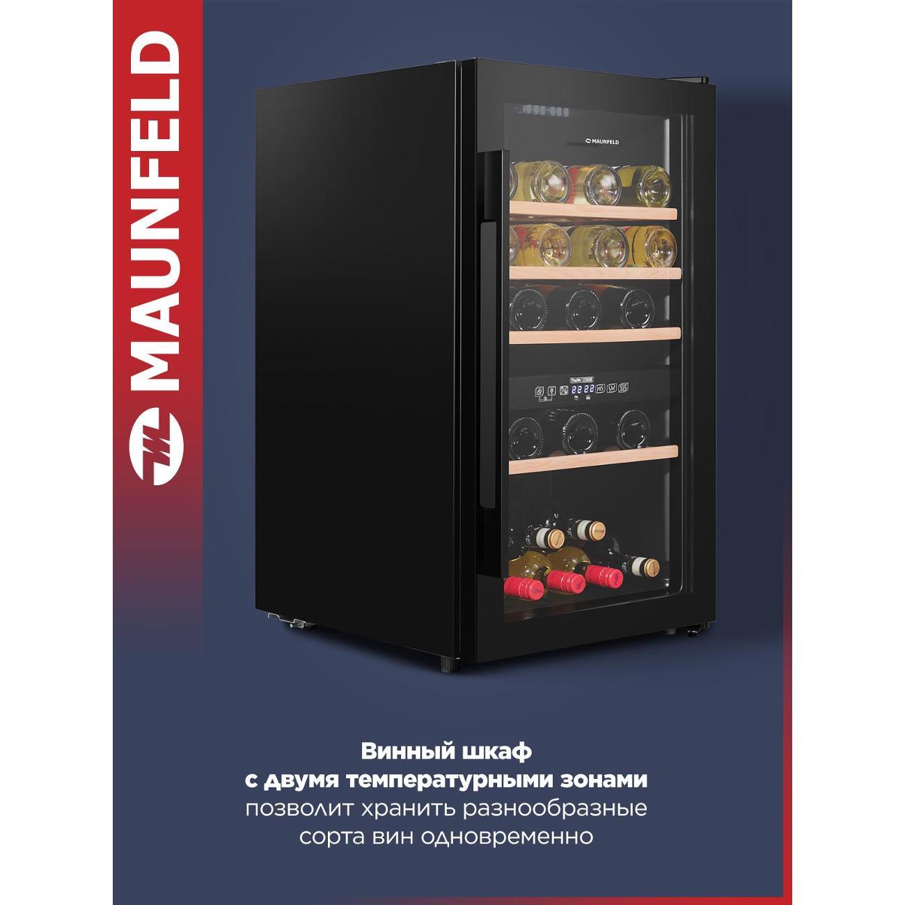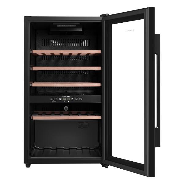 Устройство оборудовано сенсорным типом управления, LED дисплеем, LED подсветкой холодильника с плавным включением освещения и вентилятором для распределения температуры. Для устранения запахов предусмотрено наличие угольного фильтра. На корпусе шкафа расположены индикаторы режима работы, включения, температуры в холодильнике и каждой зоне. Для безопасной эксплуатации модель оборудована световым сигналом увеличения температуры, звуковым сигналом отсутствия питания и звуковым сигналом при открытии двери холодильника. Габаритные размеры модели — 85,5х57,5х48 см. Цвет модели — черный.
