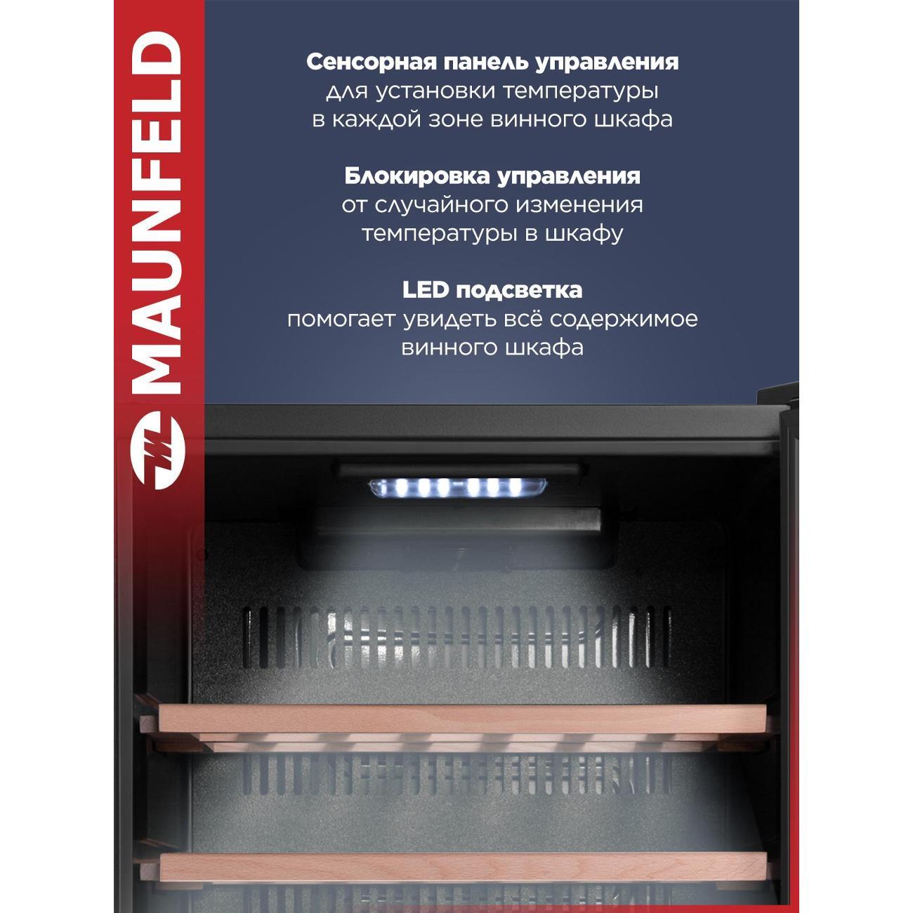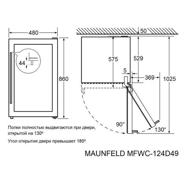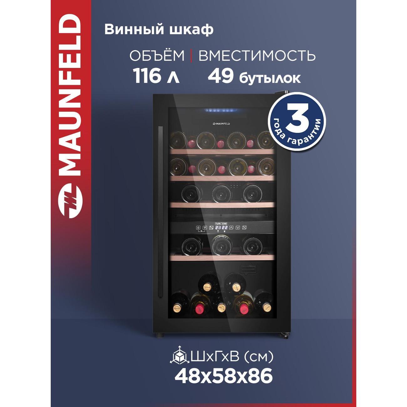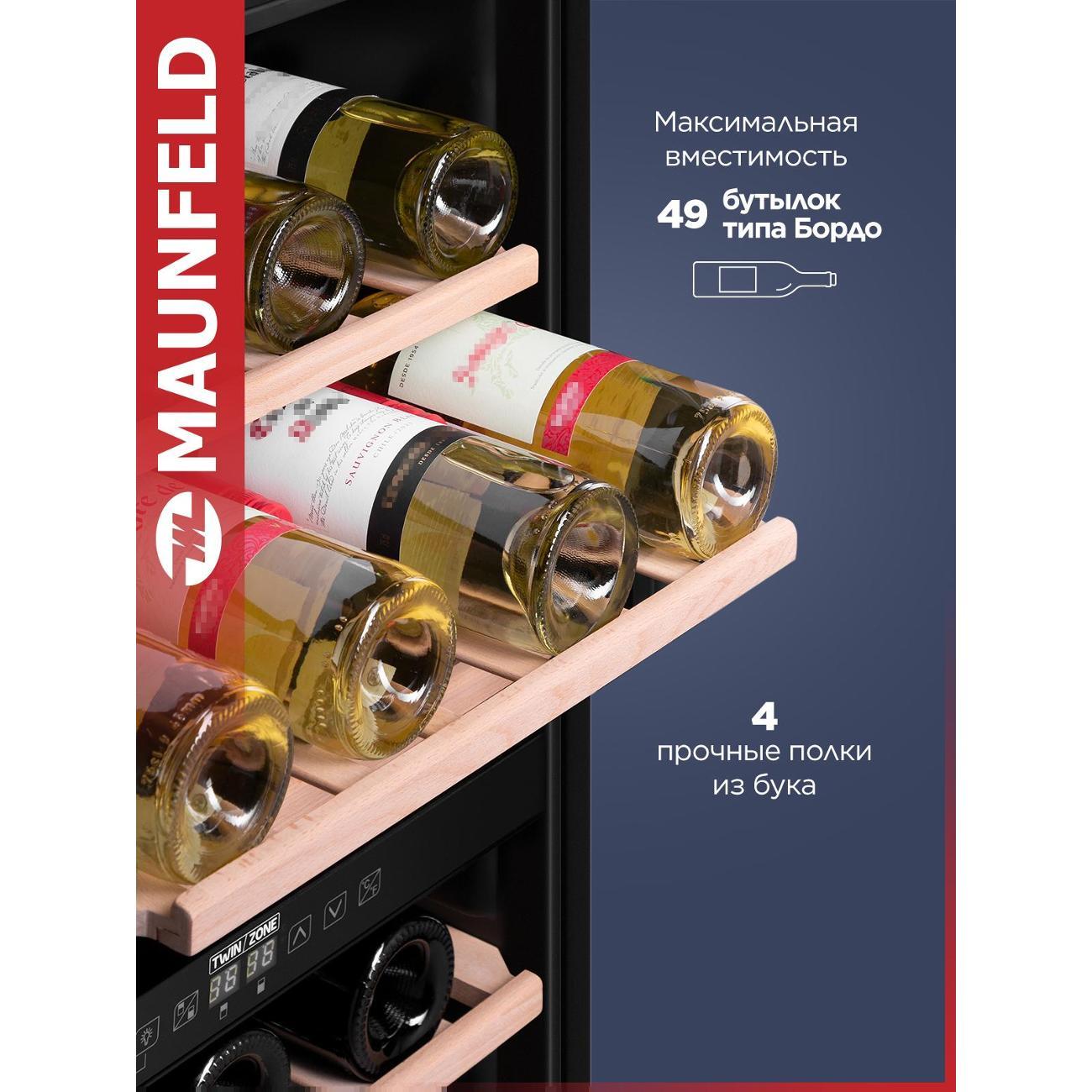 Винный шкаф от 140 см Maunfeld MFWC-124D49 компрессорного типа охлаждения относится к климатическому классу N-SN-ST. В устройстве используется хладагент типа R 600a. Объем холодильной камеры достигает 116 л. Модель оборудована четырьмя полками, которые вмещают в себя до 49 бутылок. При работе уровень шума не превышает 41 дБ.