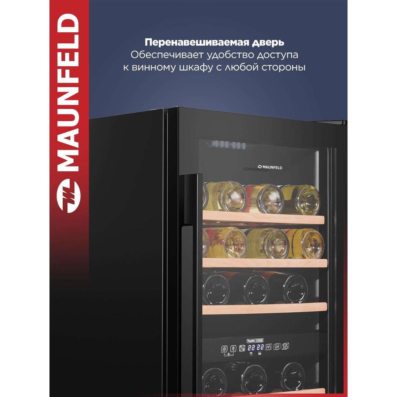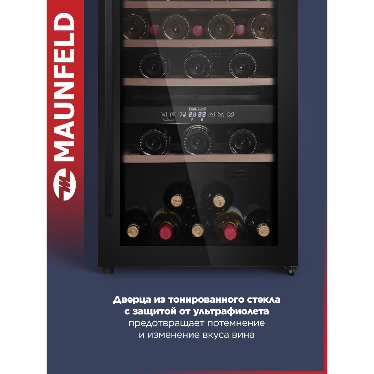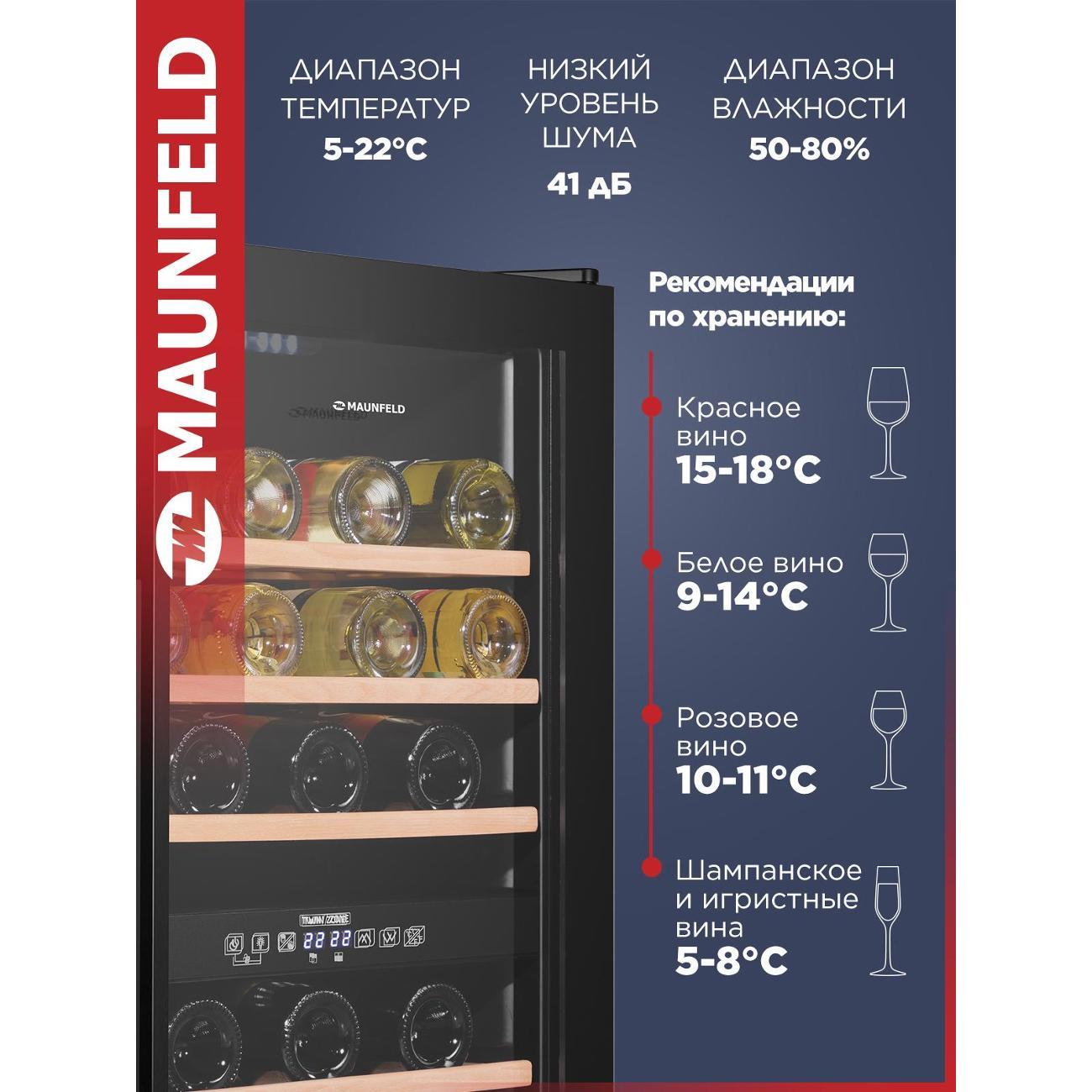 Винный шкаф от 140 см Maunfeld MFWC-124D49 компрессорного типа охлаждения относится к климатическому классу N-SN-ST. В устройстве используется хладагент типа R 600a. Объем холодильной камеры достигает 116 л. Модель оборудована четырьмя полками, которые вмещают в себя до 49 бутылок. При работе уровень шума не превышает 41 дБ.