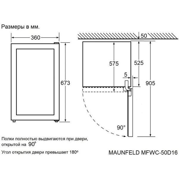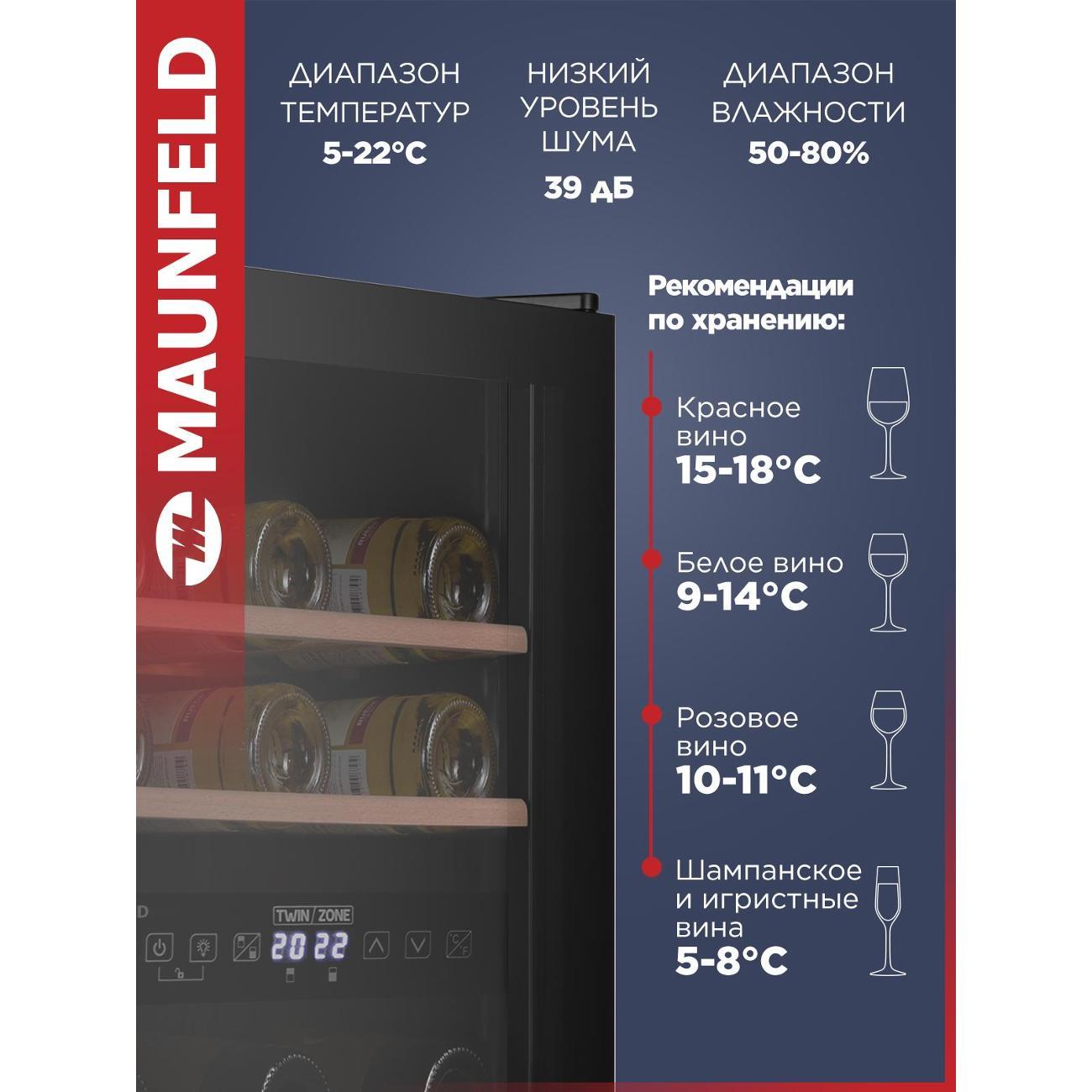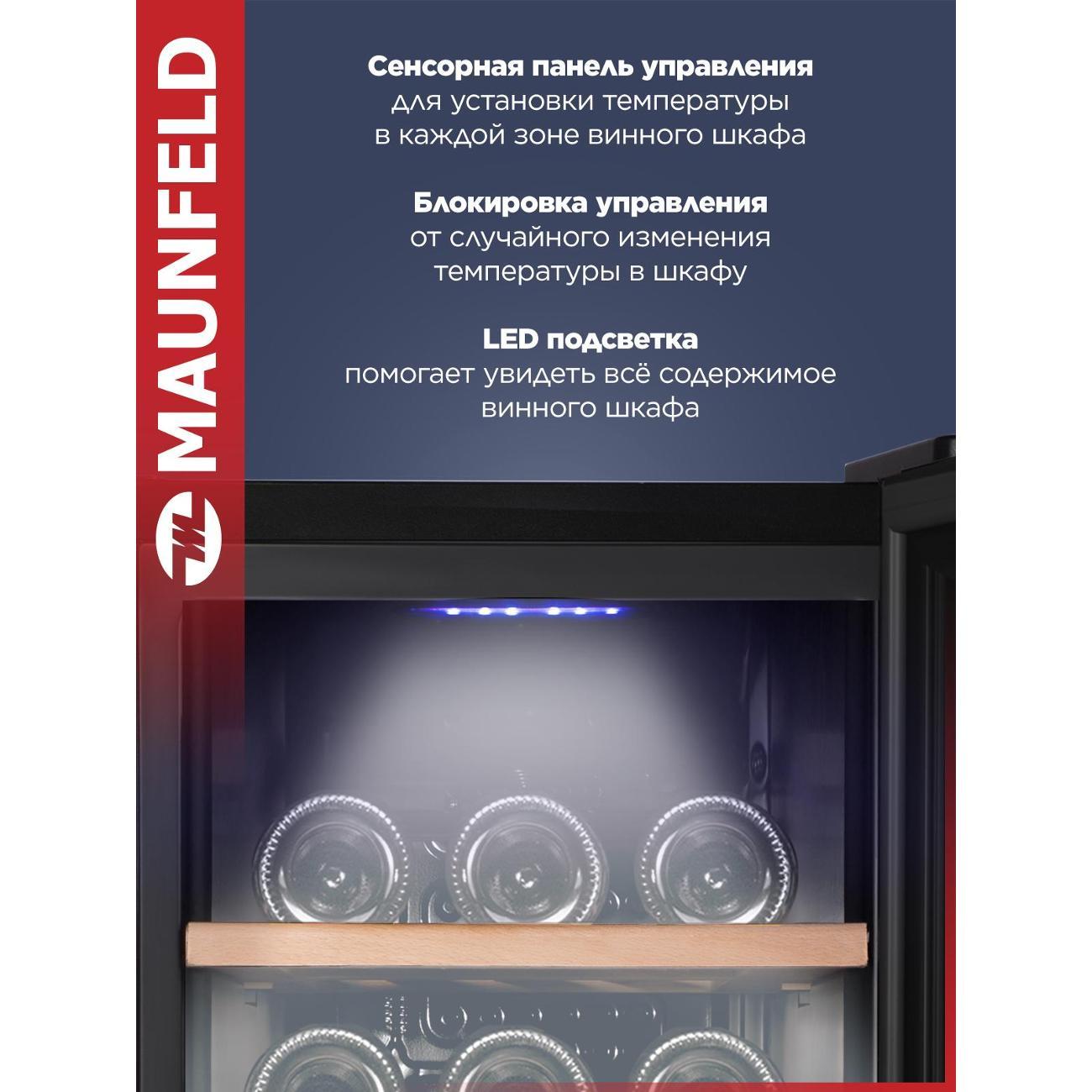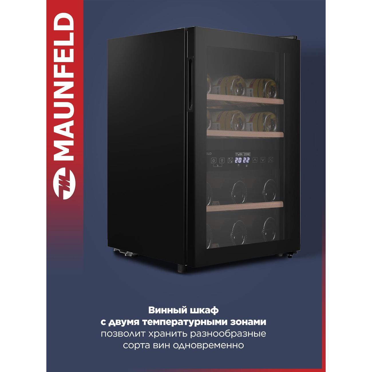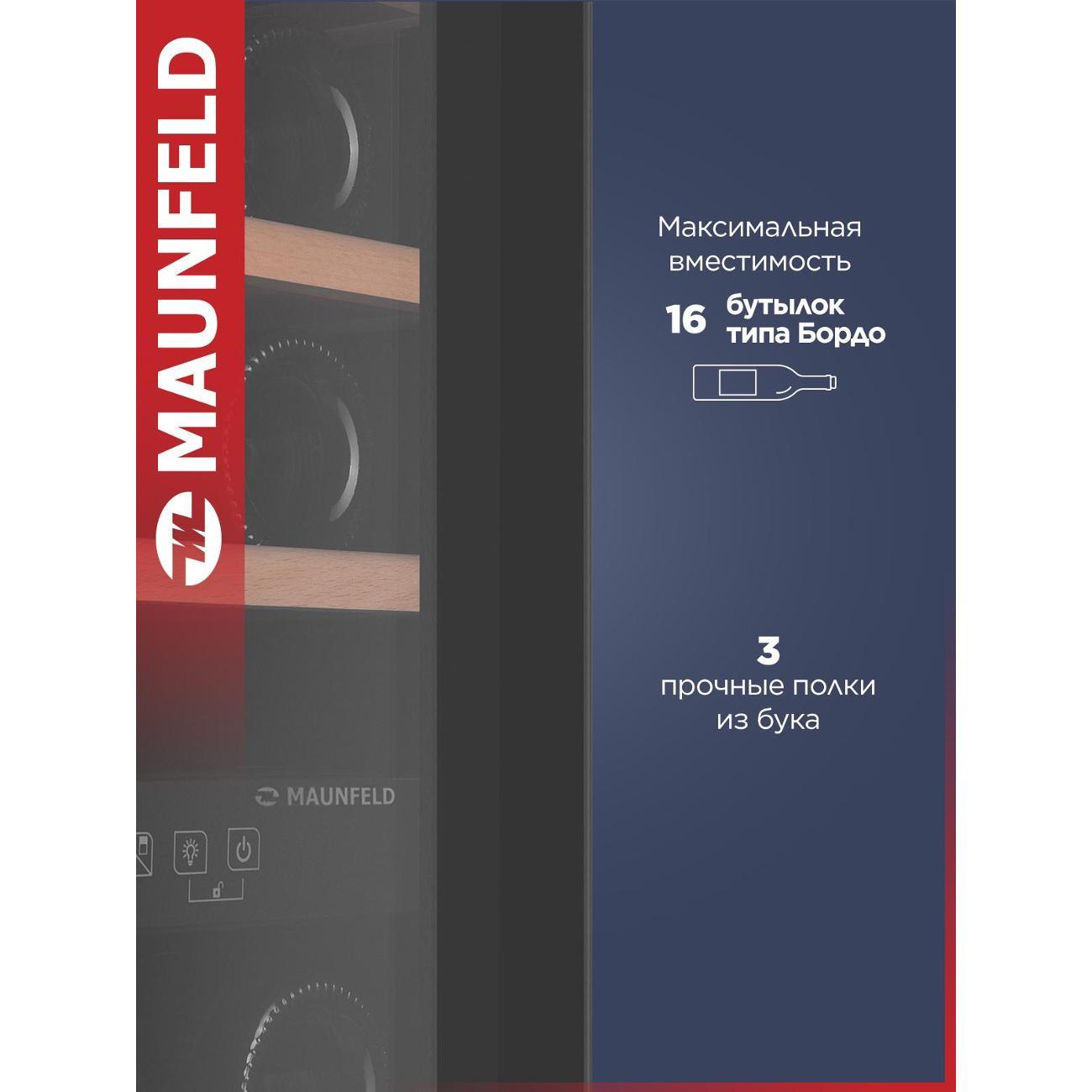 Винный шкаф до 140 см Maunfeld MFWC-50D16 — компактное устройство, предназначенное для профессионального хранения и вызревания винных коллекций. Общий объем модели составляет 50 л. В камере расположены три деревянные полки, которые вмещают до 16 бутылок, дополненные фиксаторами против выдвижения.