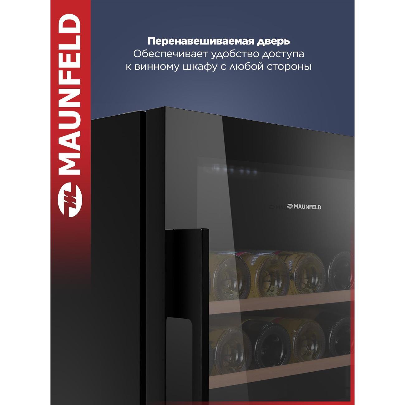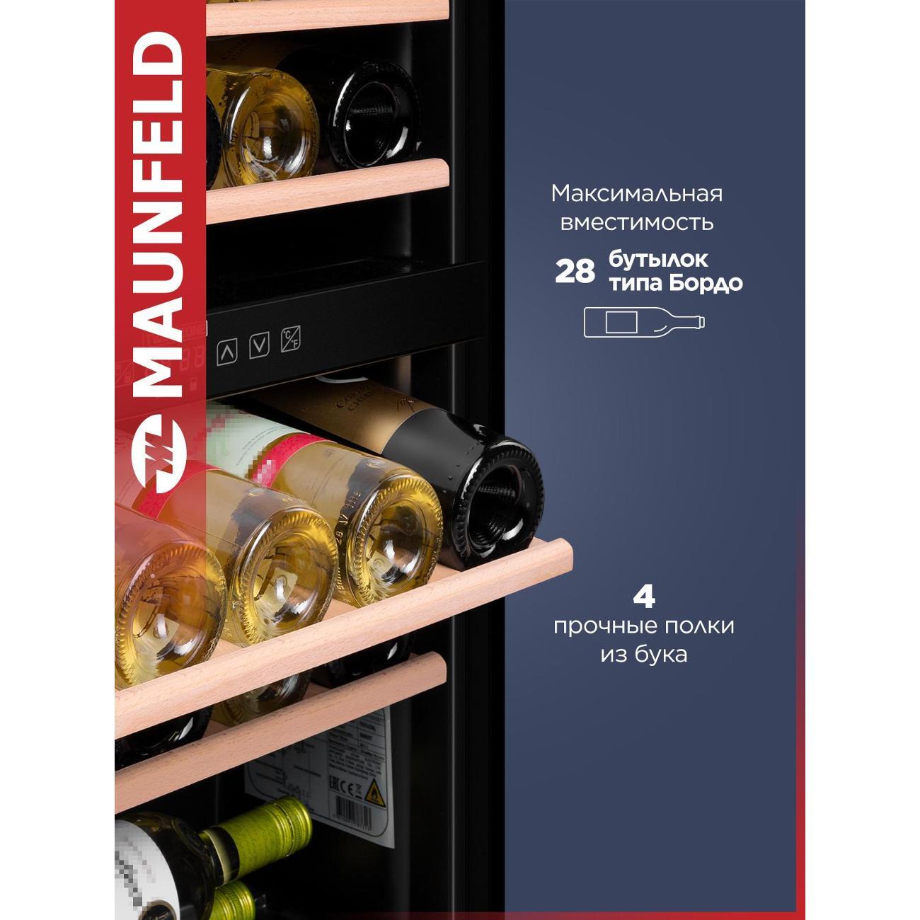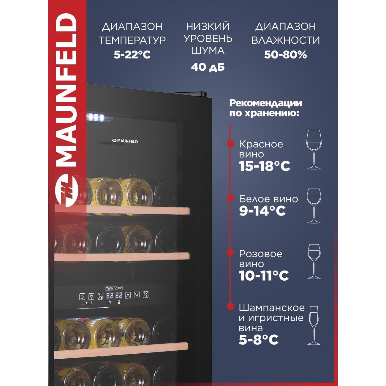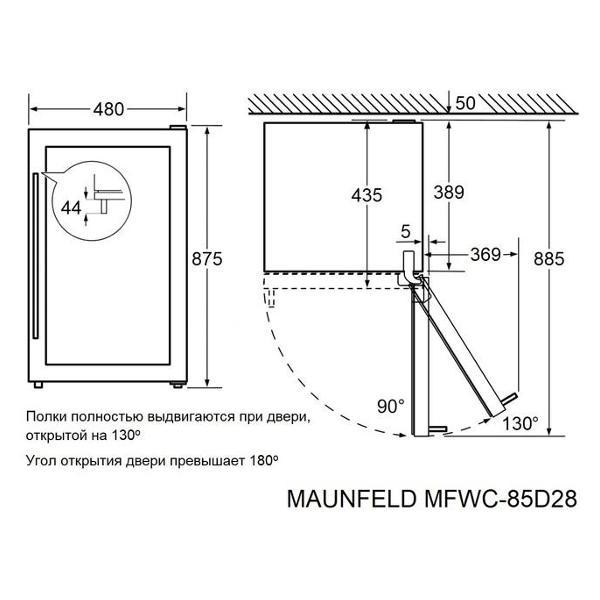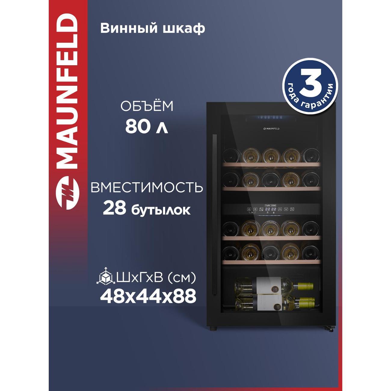 Винный шкаф от 140 см Maunfeld MFWC-85D28 компрессорного типа охлаждения относится к климатическому классу N-SN-ST. В устройстве используется хладагент типа R 600a. Объем холодильной камеры достигает 80 л. Модель оборудована пятью полками, которые вмещают в себя до 28 бутылок. При работе уровень шума не превышает 40 дБ.