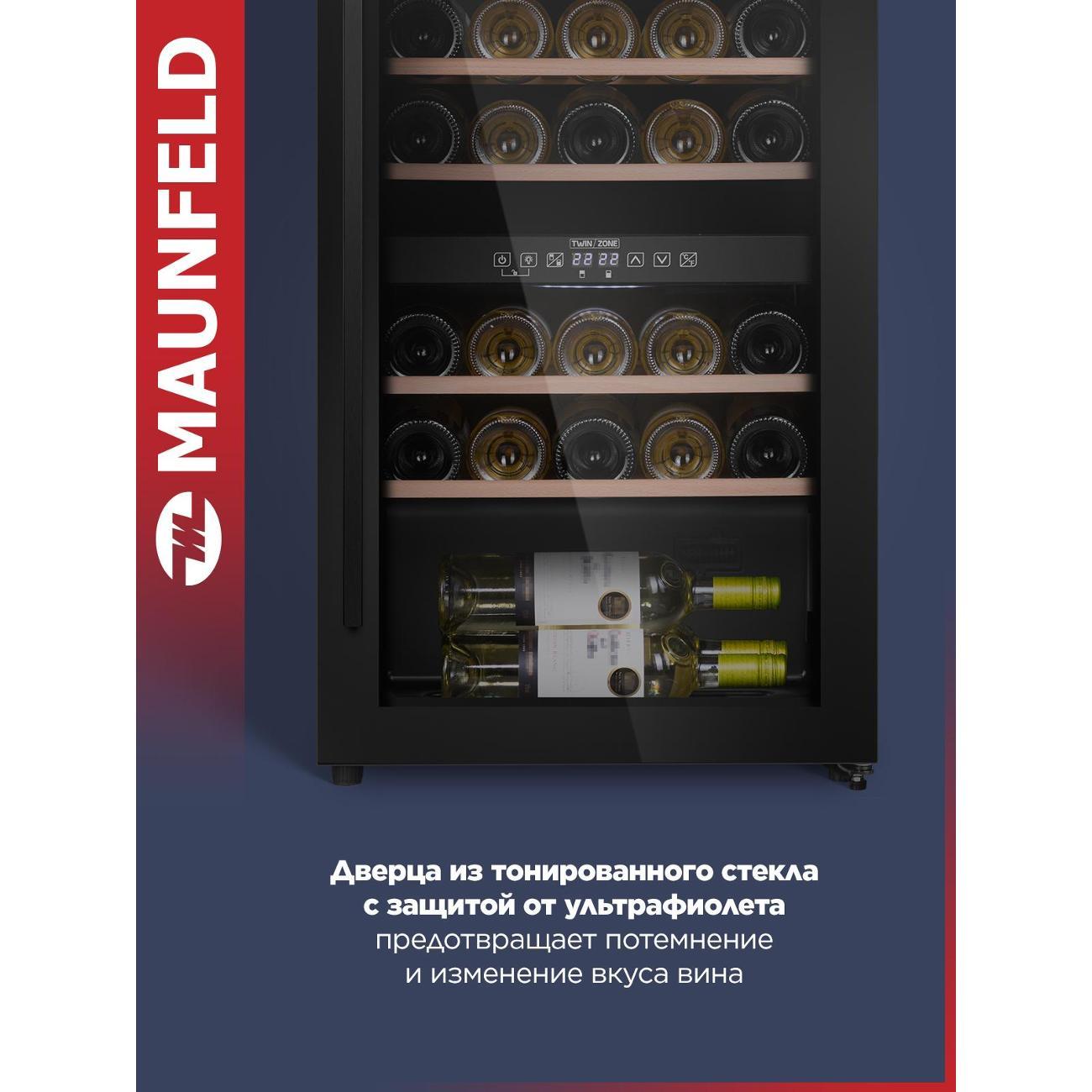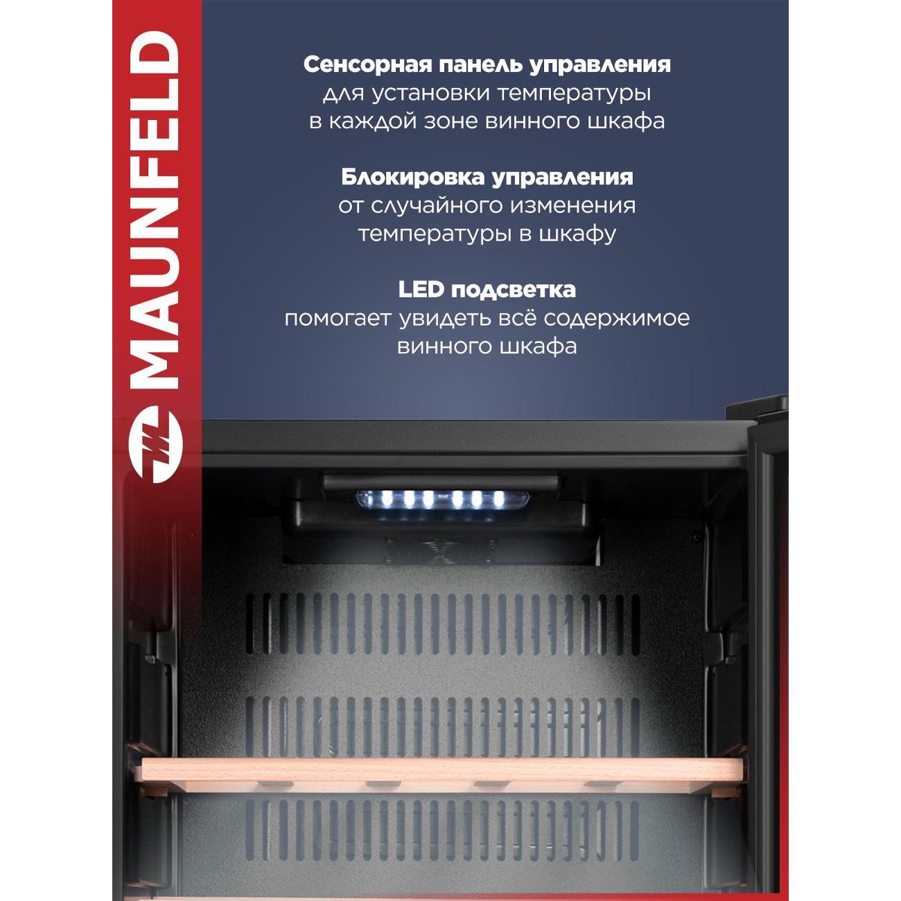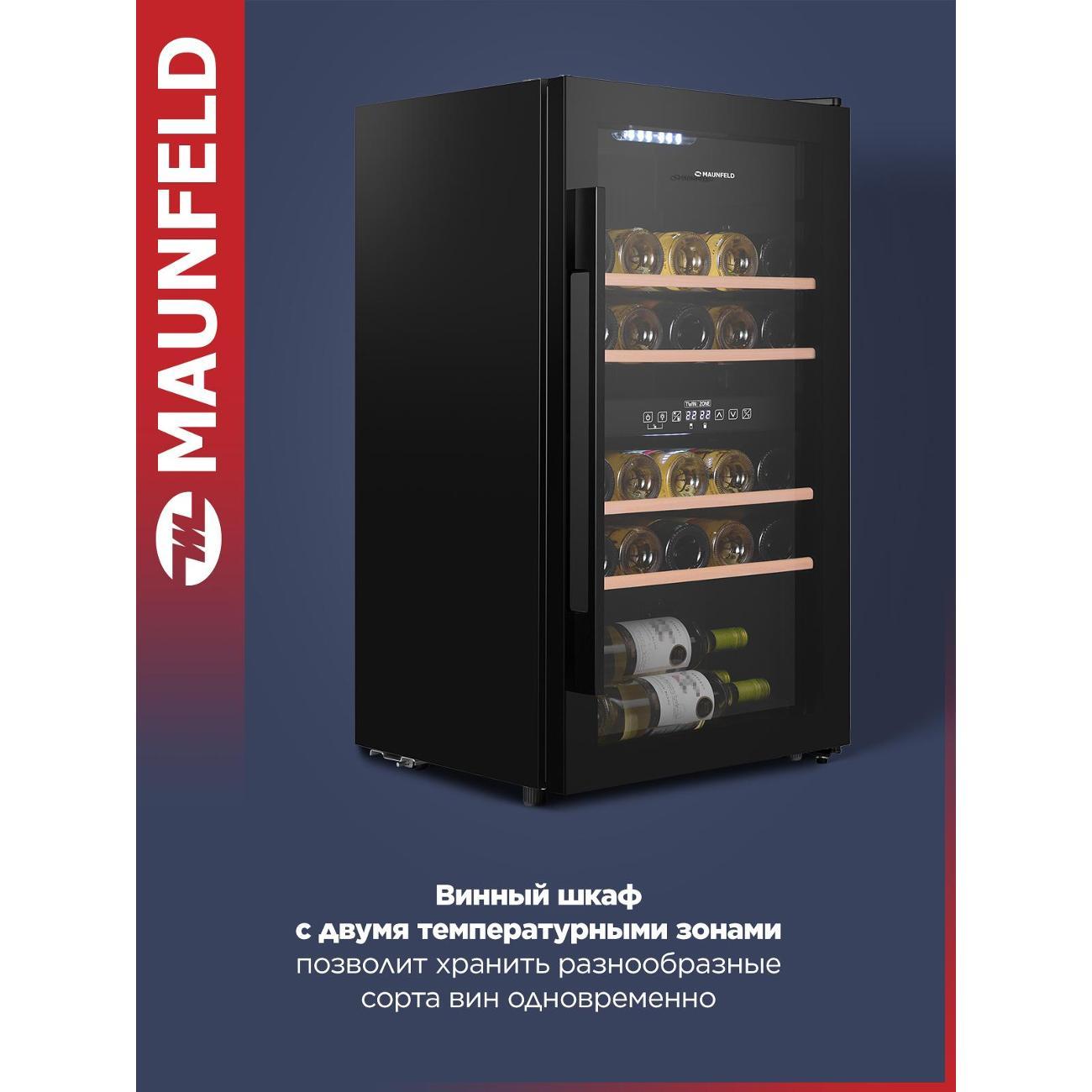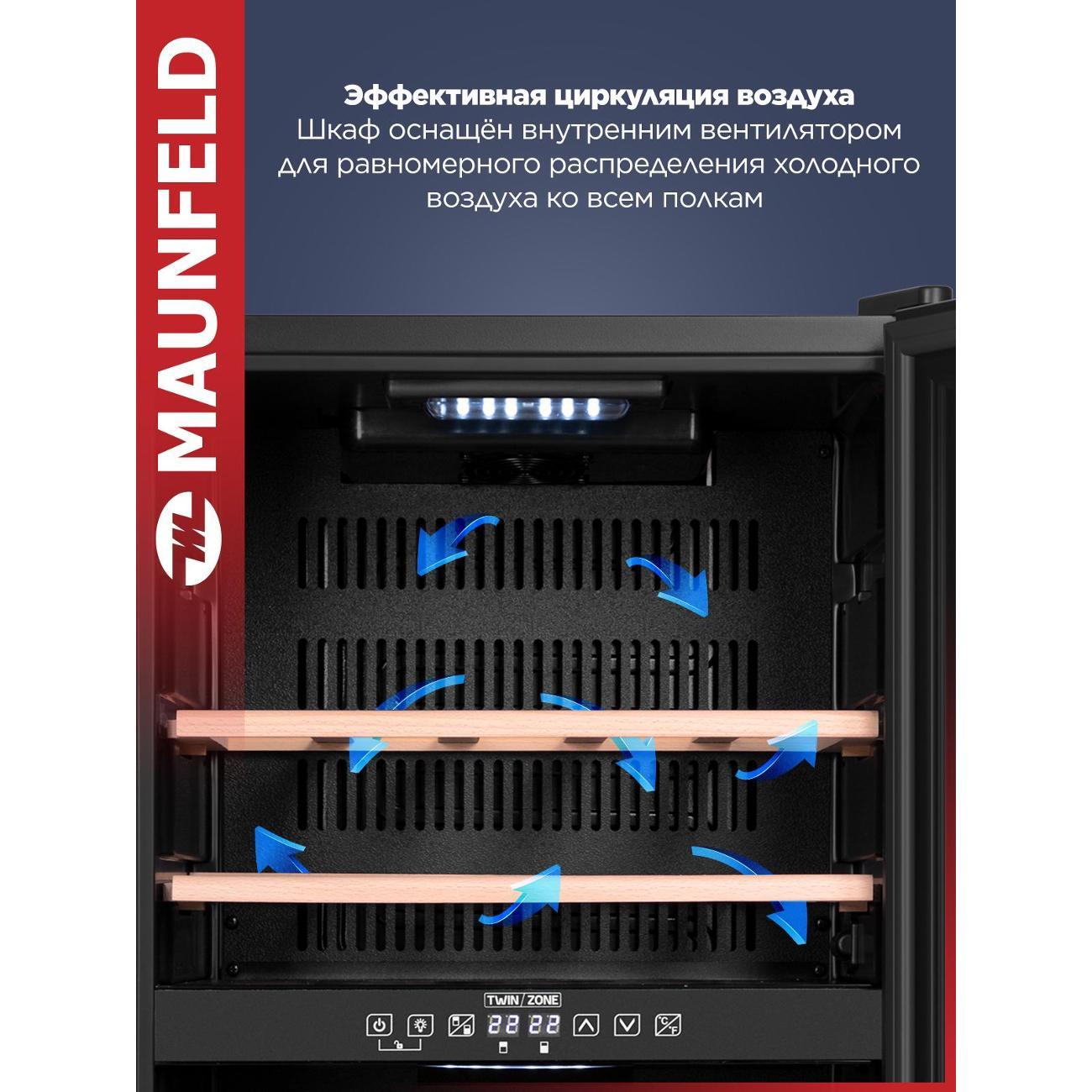 Винный шкаф от 140 см Maunfeld MFWC-85D28 компрессорного типа охлаждения относится к климатическому классу N-SN-ST. В устройстве используется хладагент типа R 600a. Объем холодильной камеры достигает 80 л. Модель оборудована пятью полками, которые вмещают в себя до 28 бутылок. При работе уровень шума не превышает 40 дБ.
