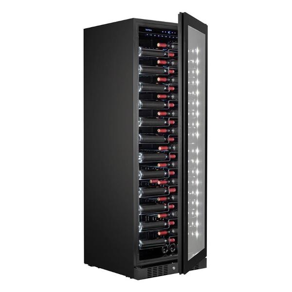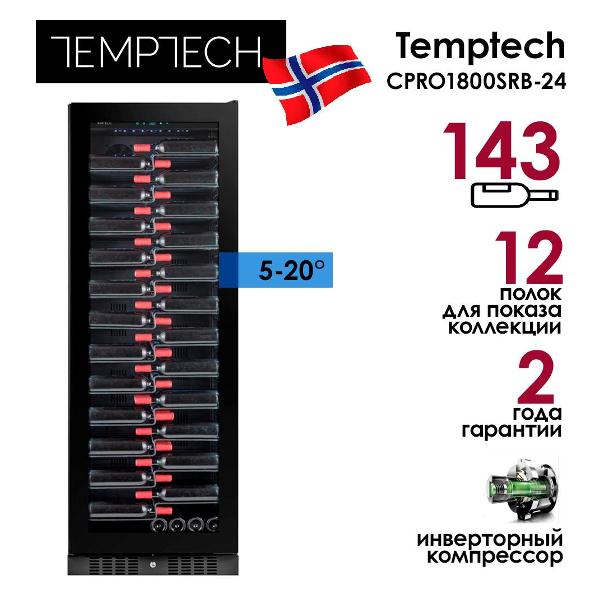 Винный шкаф Temptech CPRO1800SRB-24, черный, объемом 472 л разработан для использования в ресторанах и барах. Прибор вмещает до 143 бутылок, которые размещаются на 12 выдвигающихся металлических полках. Особая конструкция дает возможность демонстрировать этикетку — помогает быстро найти нужное и показать ассортимент.