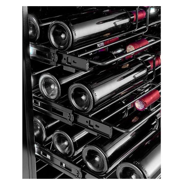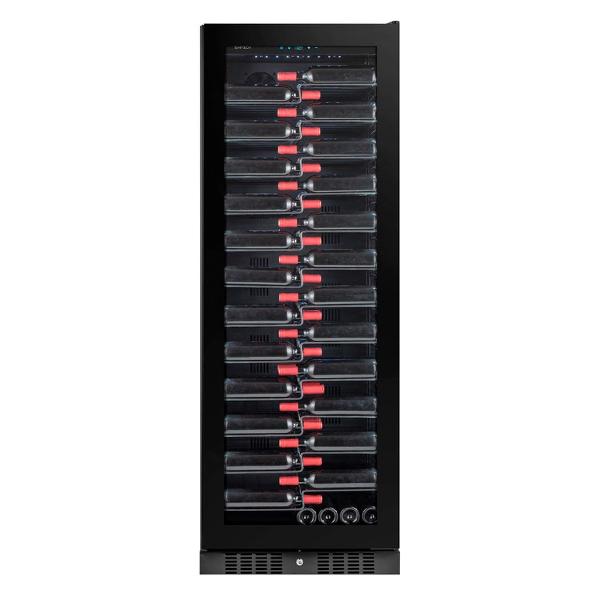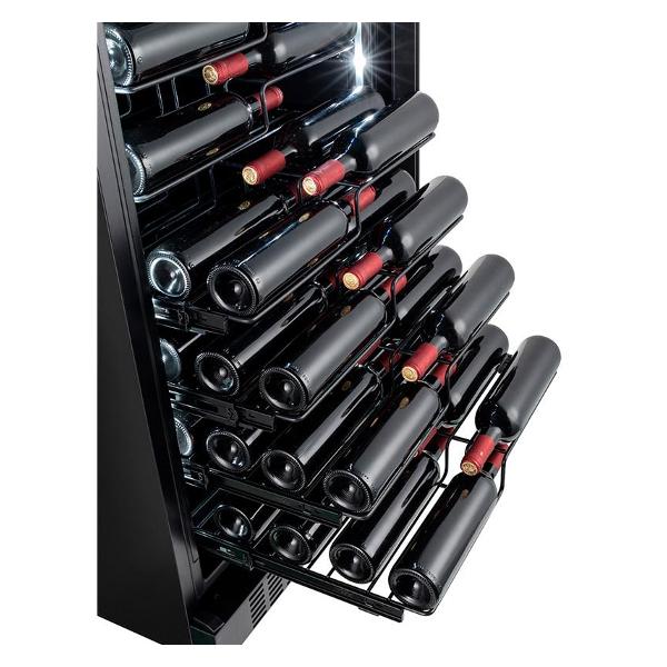 Винный шкаф оснащен замком для предотвращения доступа посторонних. Управление сенсорное, панель размещена в верхней части корпуса. Параметры работы отображает цифровой дисплей.