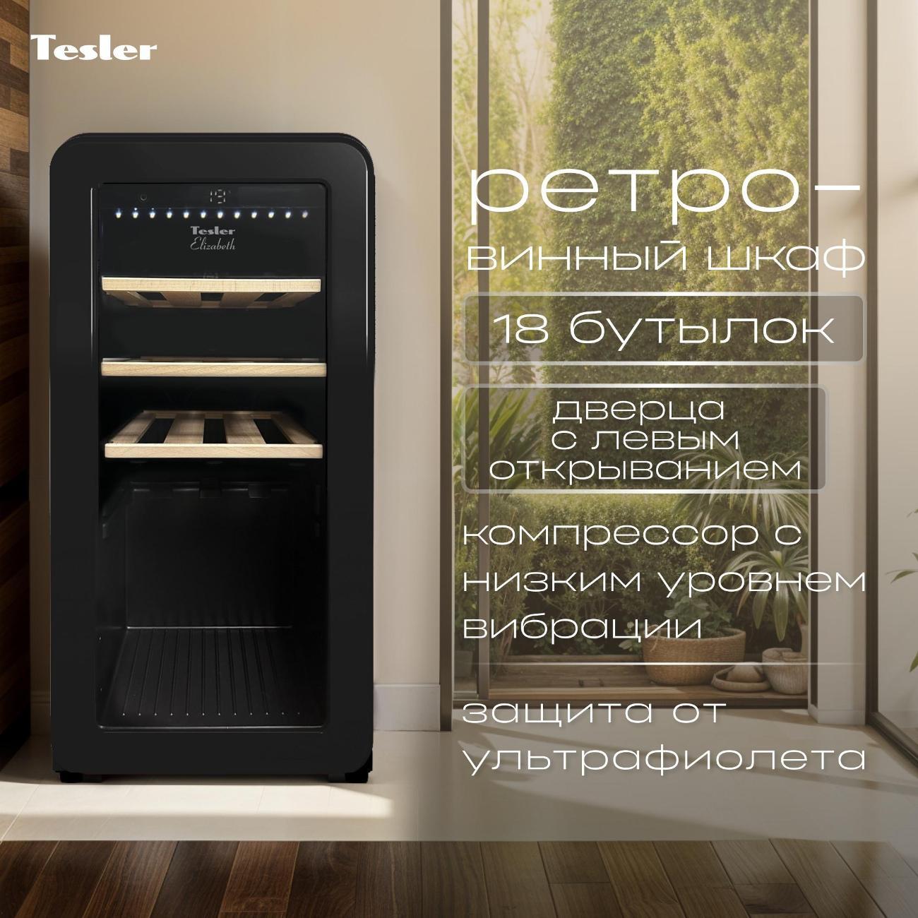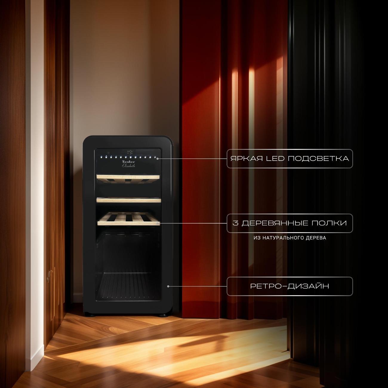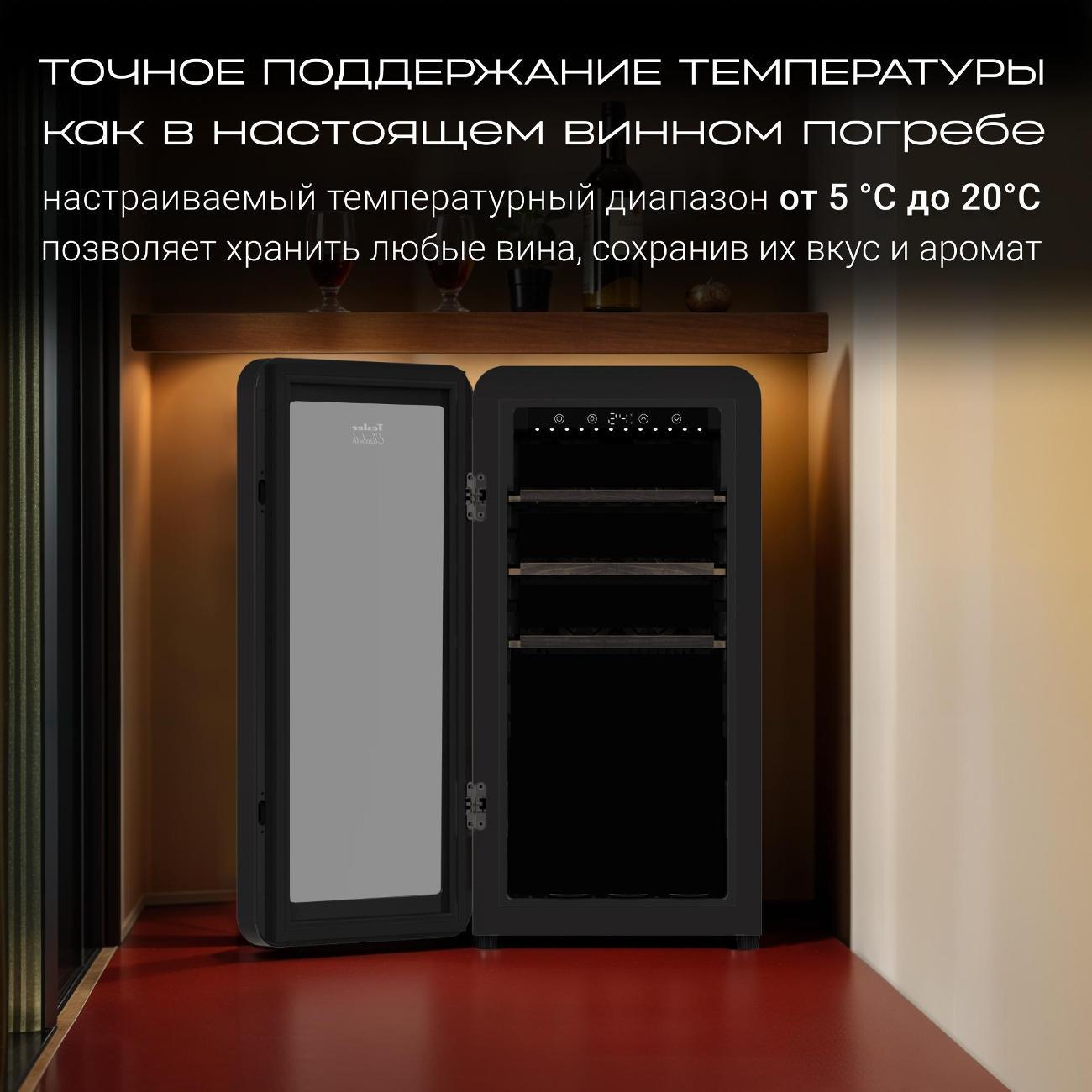 Компрессорный винный шкаф Tesler CWC-188 Black LD вмещает 18 бутылок вина, предлагая оптимальные условия для созревания напитка. Деревянные полки гасят вибрации, защищая напитки от взбалтывания осадка.
