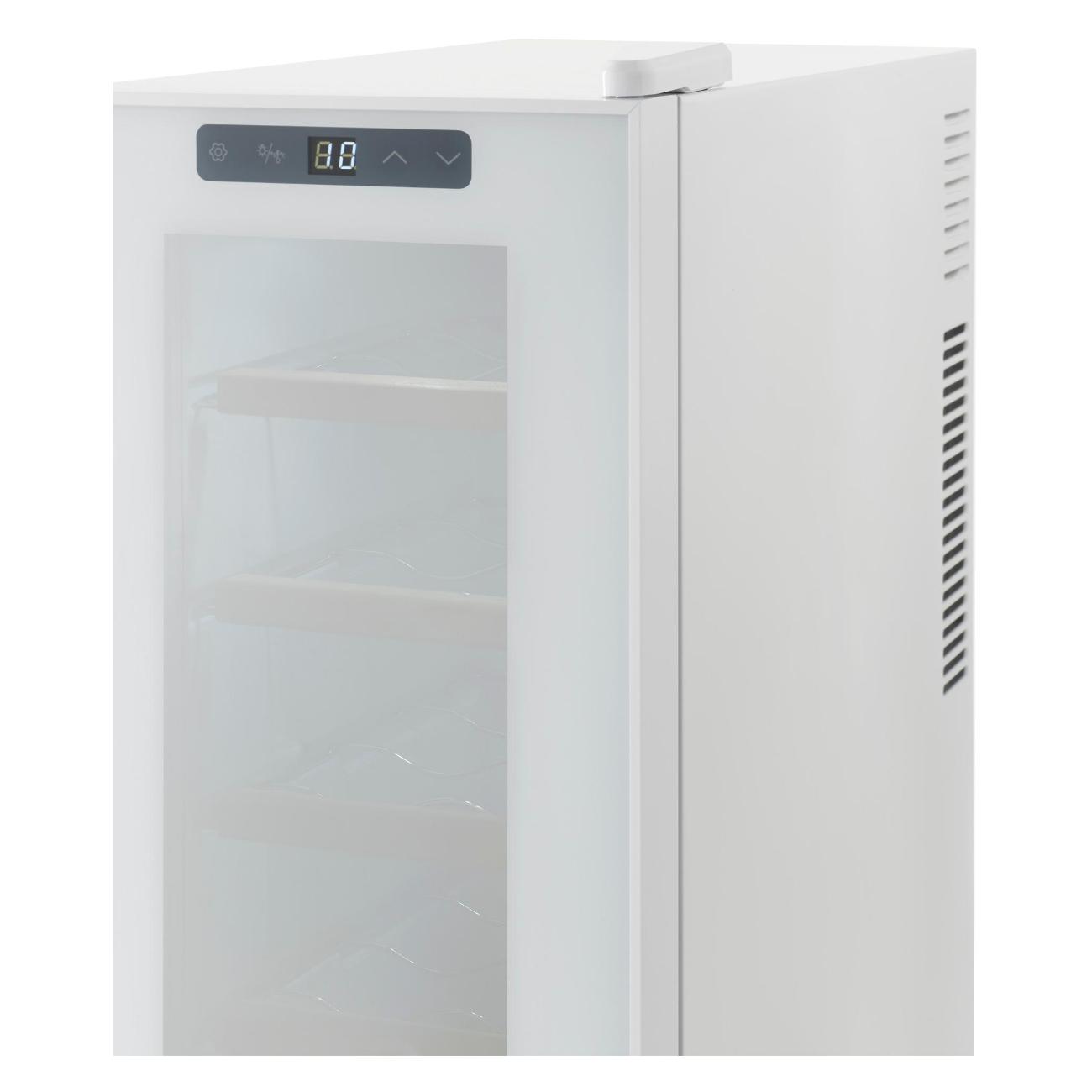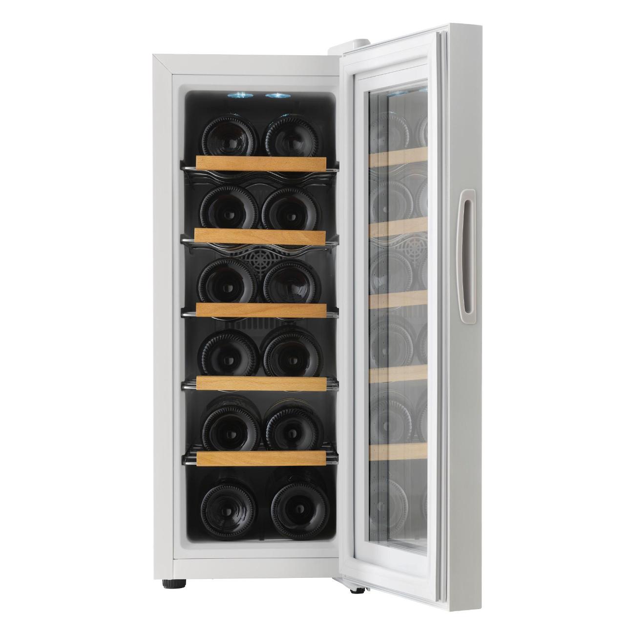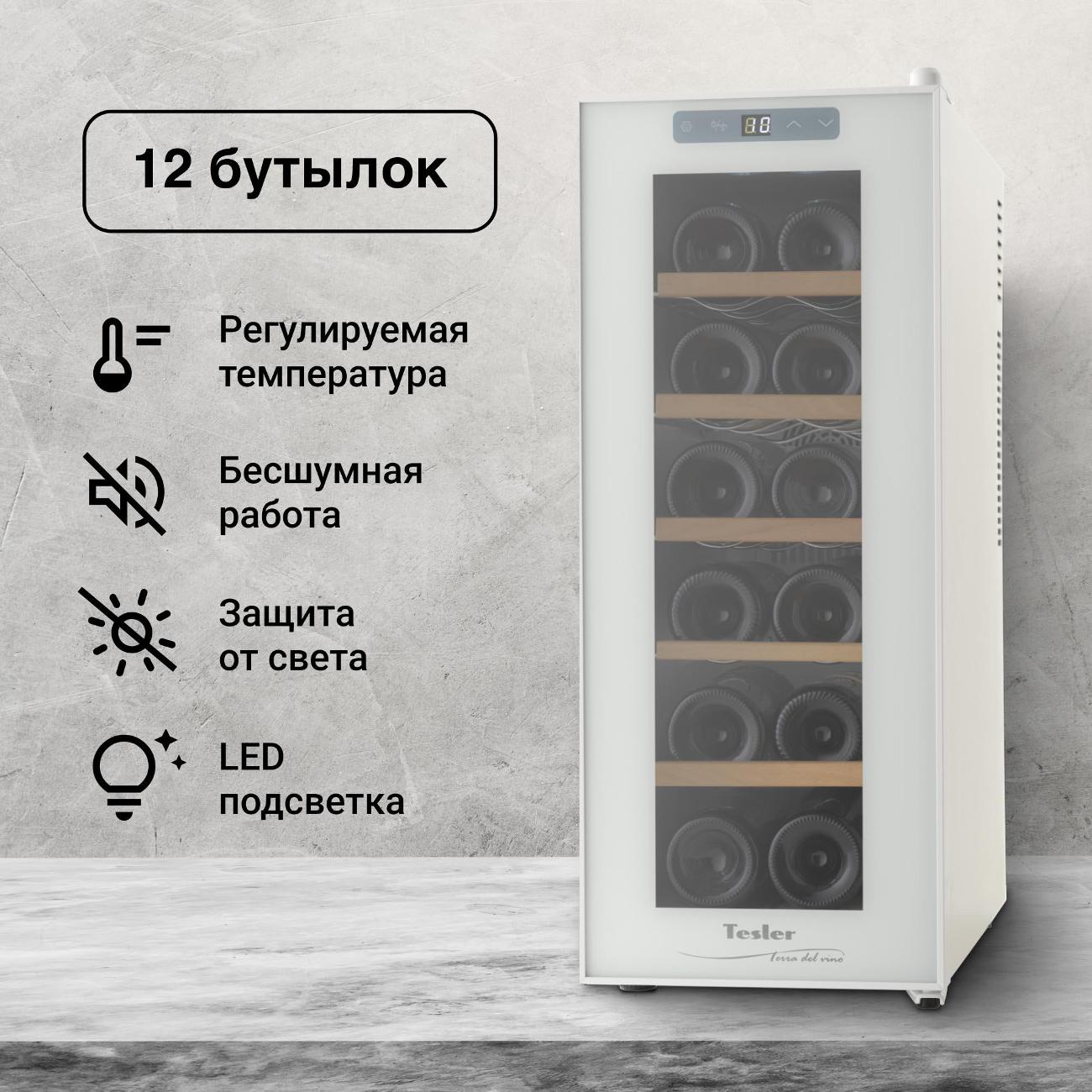 Винный шкаф Tesler WCV-125, белый, обладает объемом 30 л и вмещает 12 бутылок. Климатическая зона одна, температура устанавливается в диапазоне от +10°С до +18°С. Управление сенсорное, панель с цифровым дисплеем, отображающим актуальные параметры работы, расположена в верхней части корпуса.