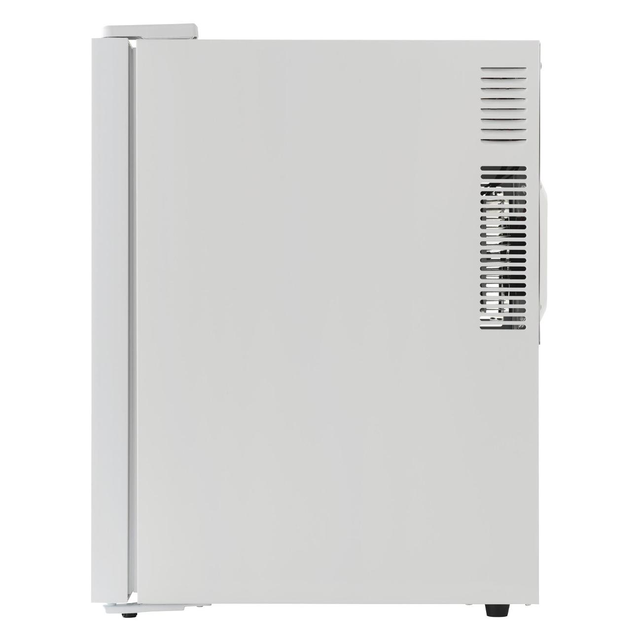 Двойное стекло дверцы обладает зеркальной поверхностью. Дверца снабжена бесшовным уплотнителем, надежно защищающим содержимое устройства от воздействия окружающей среды. Для термоизоляции корпуса применяется полиуретановая пена. Габариты винного шкафа: 252х500х635 мм, вес — 12,4 кг. Установку упрощают регулируемые ножки, они позволяют нейтрализовать небольшие неровности пола.