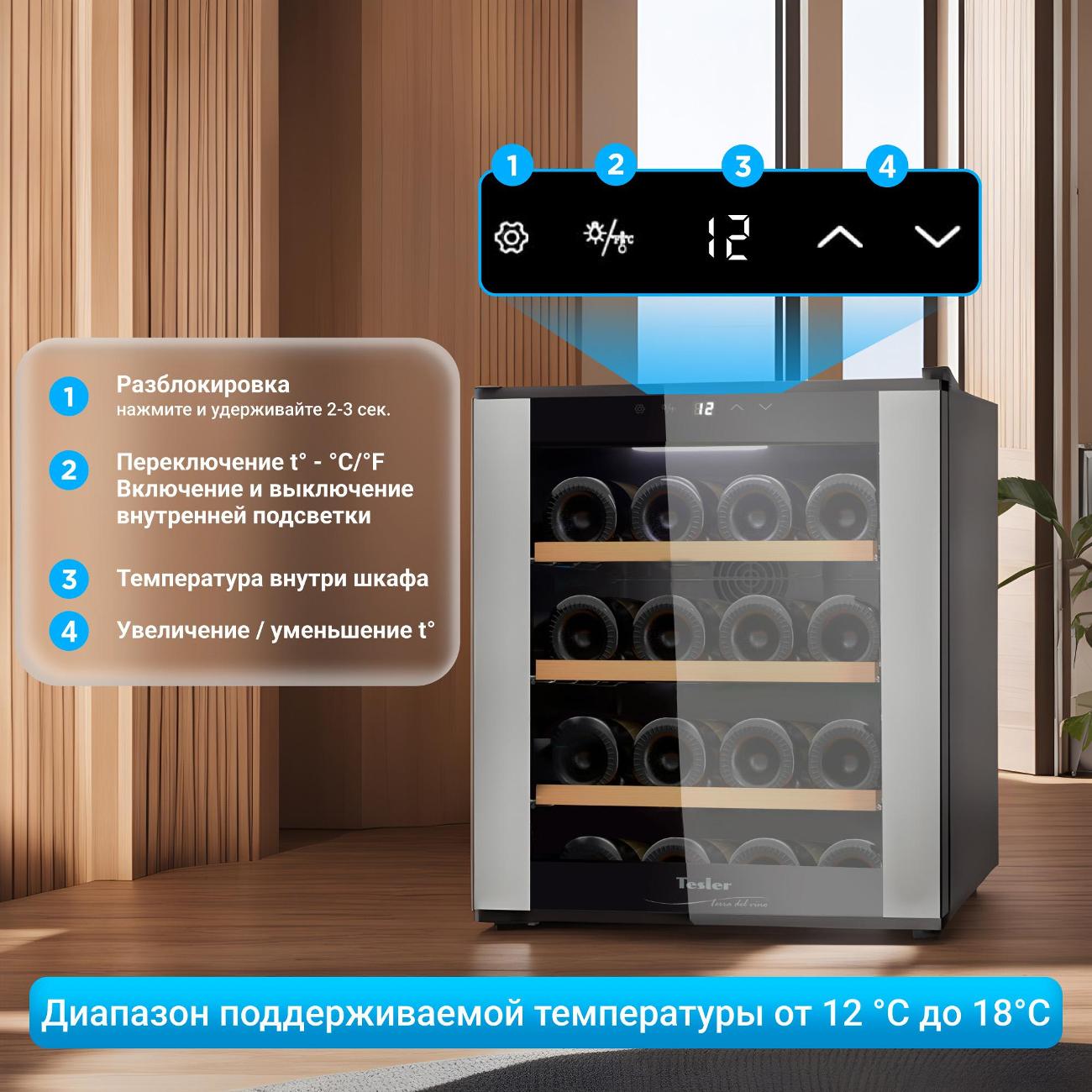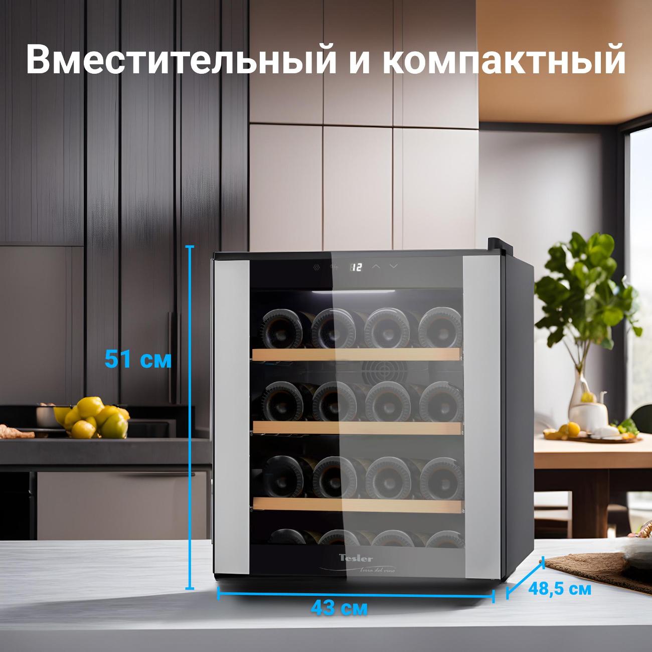 Винный шкаф до 140 см Tesler WCV-160 отличается широким температурным диапазоном. Охлаждение выполнено на базе термоэлектрической технологии. Внутри находятся четыре съемных хромированных полки. Дверца модели двойная. Полезный объем камеры — 16 л. Этого достаточно для размещения восьми винных бутылок. На дверце сделано зеркальное покрытие для защиты напитков от воздействия УФ-лучей. Для управления используется панель с сенсорными элементами. Настройки отображаются на дисплее. В процессе работы шкафа сохраняется низкий уровень шума.