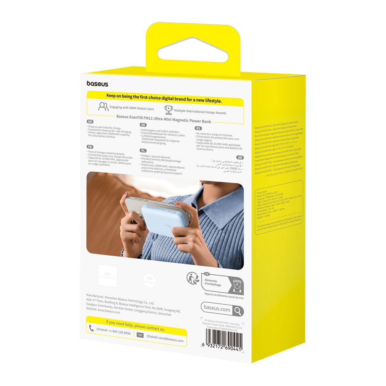 Компактный внешний аккумулятор Baseus EnerFill FM11 10000mAh 22.5W Galaxy Blue сочетает в себе элегантный дизайн и передовые технологии. Встроенные магниты обеспечивают точное позиционирование на задней панели совместимых смартфонов, а режим сквозной зарядки позволяет одновременно питать пауэрбанк и присоединенное устройство от одной розетки.