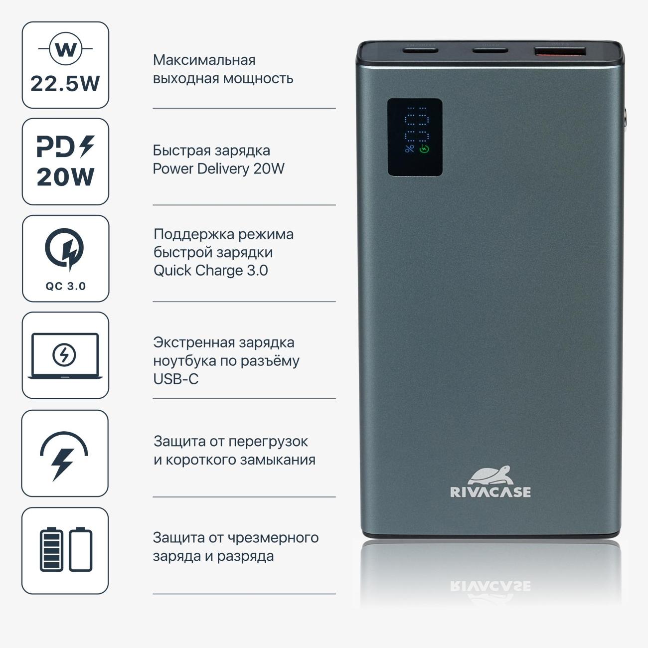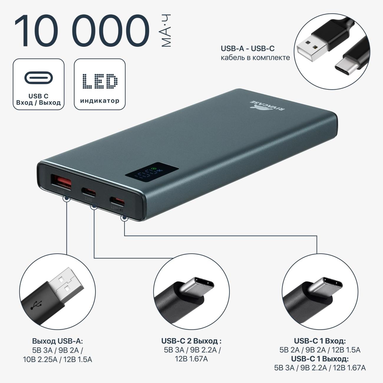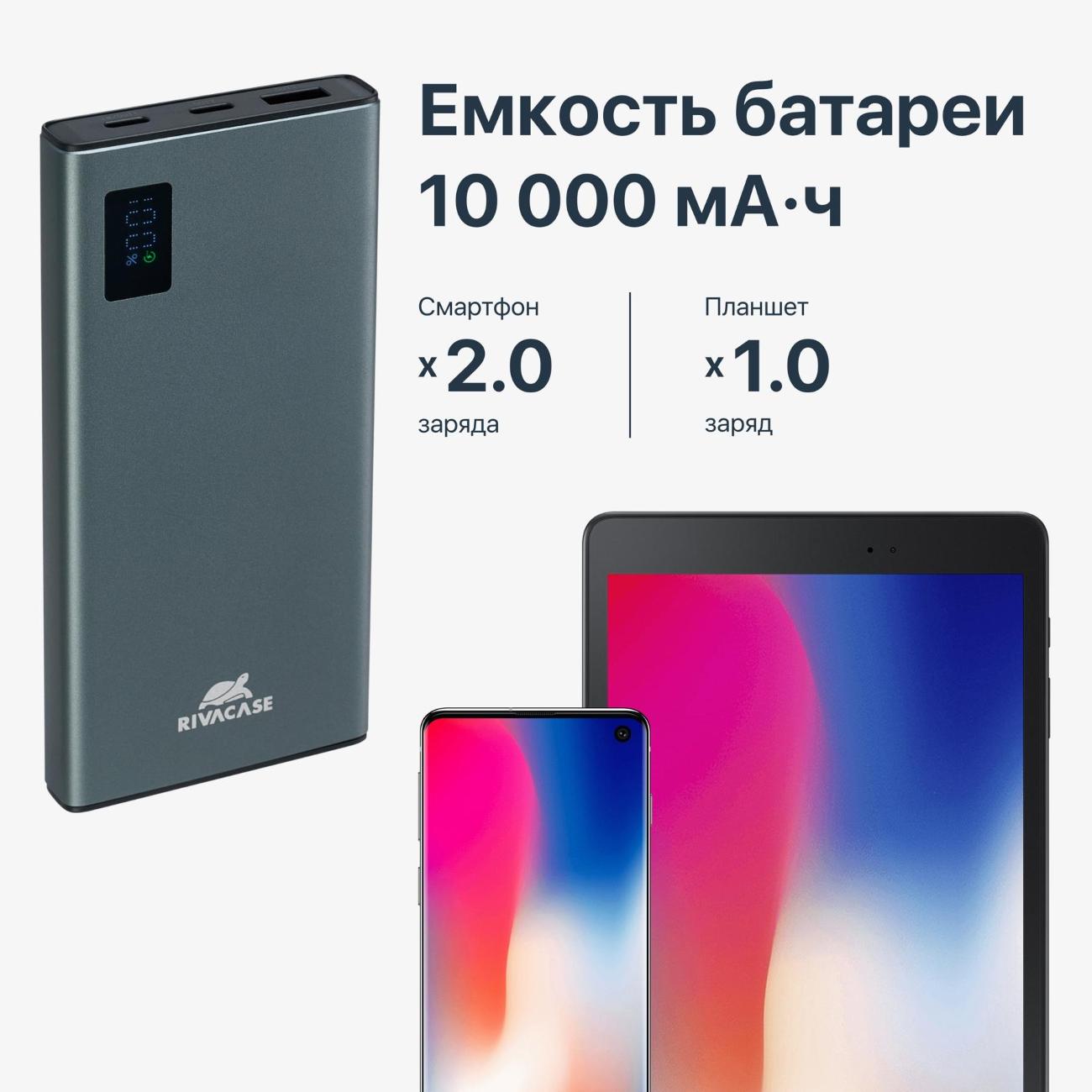 Внешний аккумулятор Rivacase 10000 mAh (VA1021) весом 255 г имеет два современных порта USB-C и один классический порт USB-A, что позволяет быстро подзарядить до трех устройств.