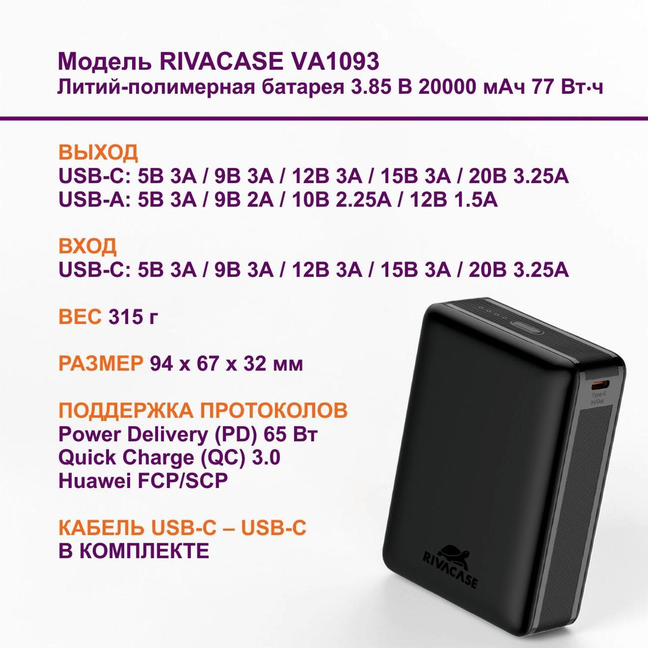 Внешний аккумулятор Rivacase VA1093 — мощный портативный источник питания емкостью 20000 мА*ч, спроектированный для работы с мобильными компьютерами, планшетами и смартфонами последнего поколения.