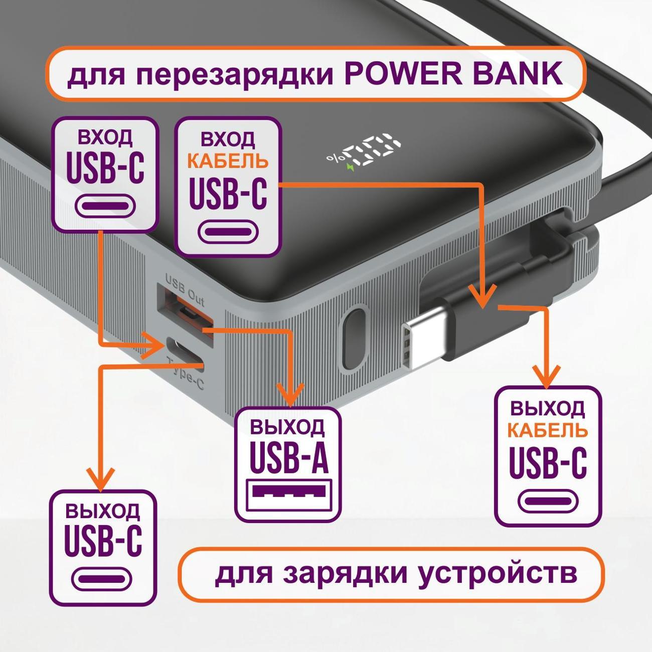 Порт USB Type-C с поддержкой технологии Power Delivery выдает до 65 Вт, что дает возможность полноценно эксплуатировать ультрабуки и MacBook без подключения к розетке. Прибор автоматически подбирает оптимальные параметры тока для быстрой зарядки.