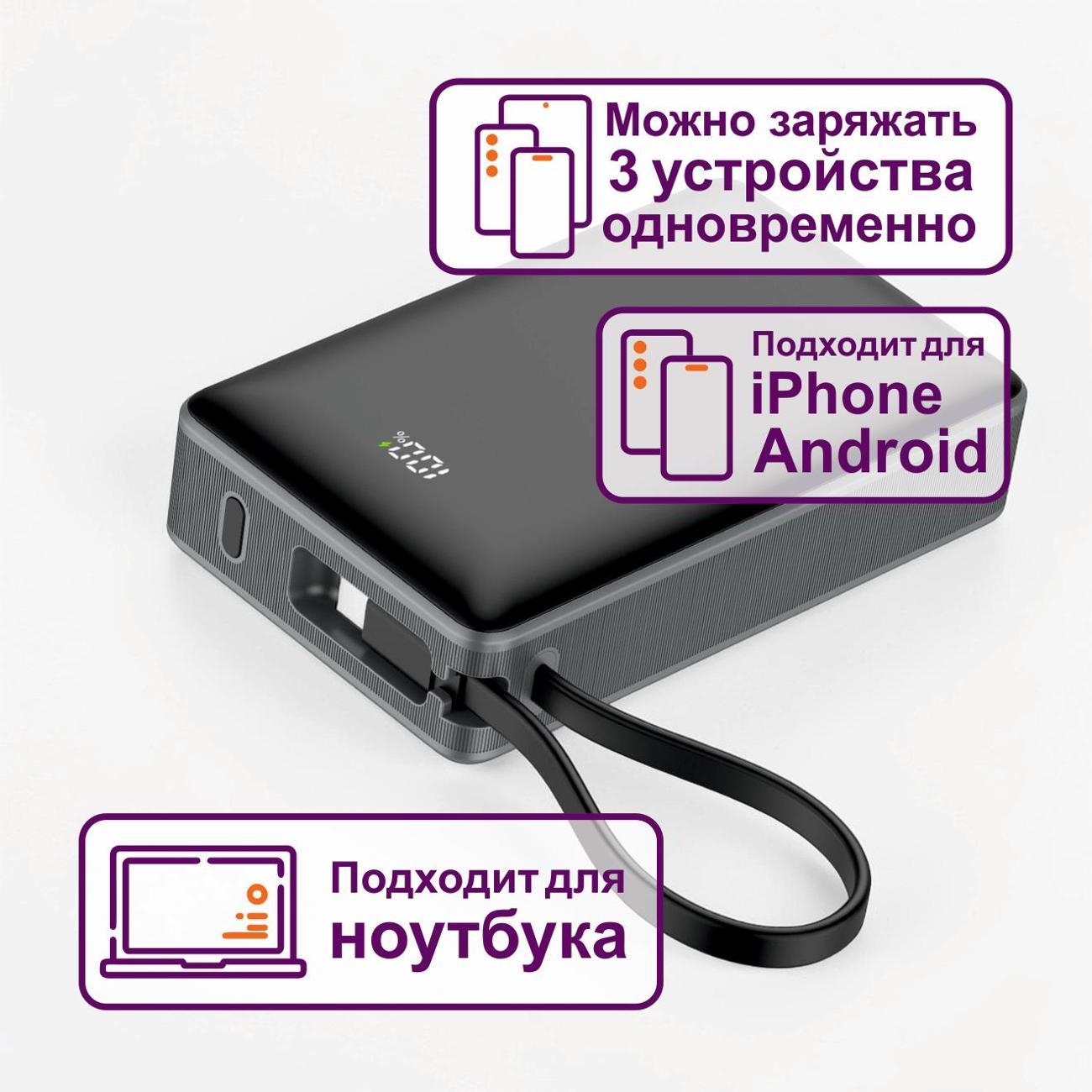 Темно-серый прибор весит 335 г и обладает компактными размерами 11х6,7х3,2 см, что делает его удобным для транспортировки в кармане рюкзака. Максимальная нагрузка достигает 3250 мА, обеспечивая стабильный ток даже при работе с ресурсоемкими устройствами. Дополнительный порт USB 3.0 типа A расширяет список совместимых кабелей для одновременного подключения двух или трех единиц техники.