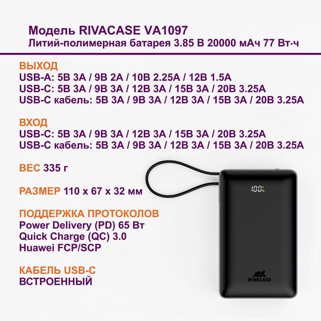 Внешний аккумулятор Rivacase VA1097 — практичное решение для тех, кто часто работает вне дома и нуждается в надежном резервном источнике питания для всей персональной электроники.