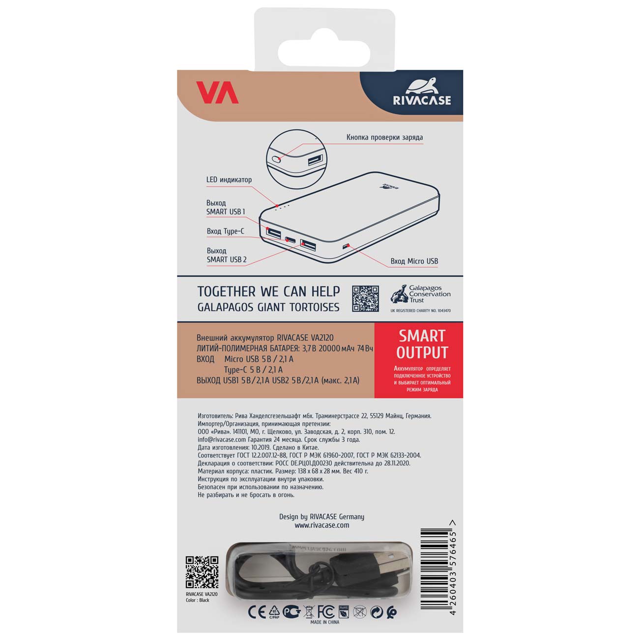 Rivacase VA2120 оснащён светодиодными индикаторами. Лампы показывают состояние батареи во время использования и зарядки. Для подключения девайсов в устройстве есть два порта USB 2.0, один – microUSB. Это позволяет подпитывать почти все современные смартфоны и планшеты.