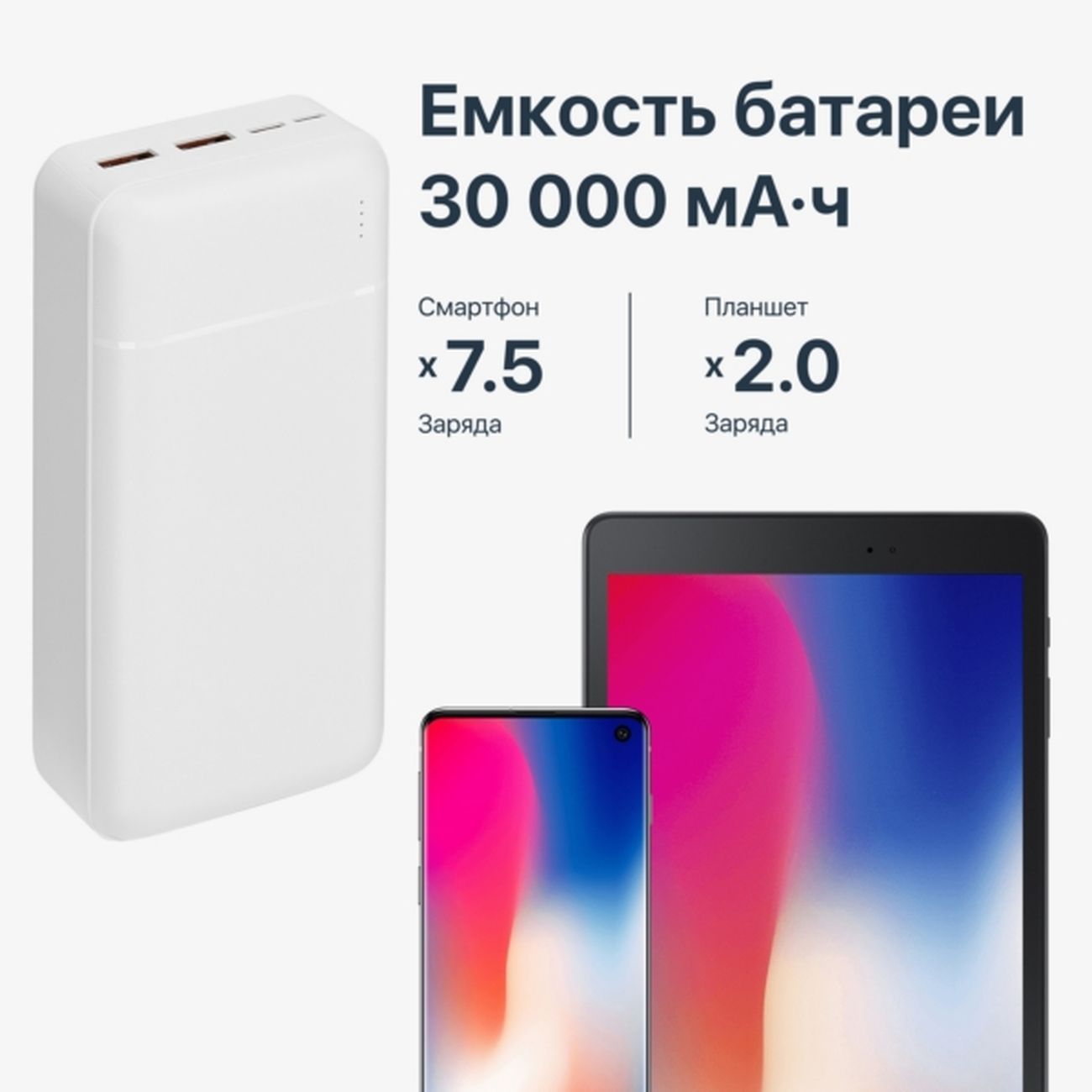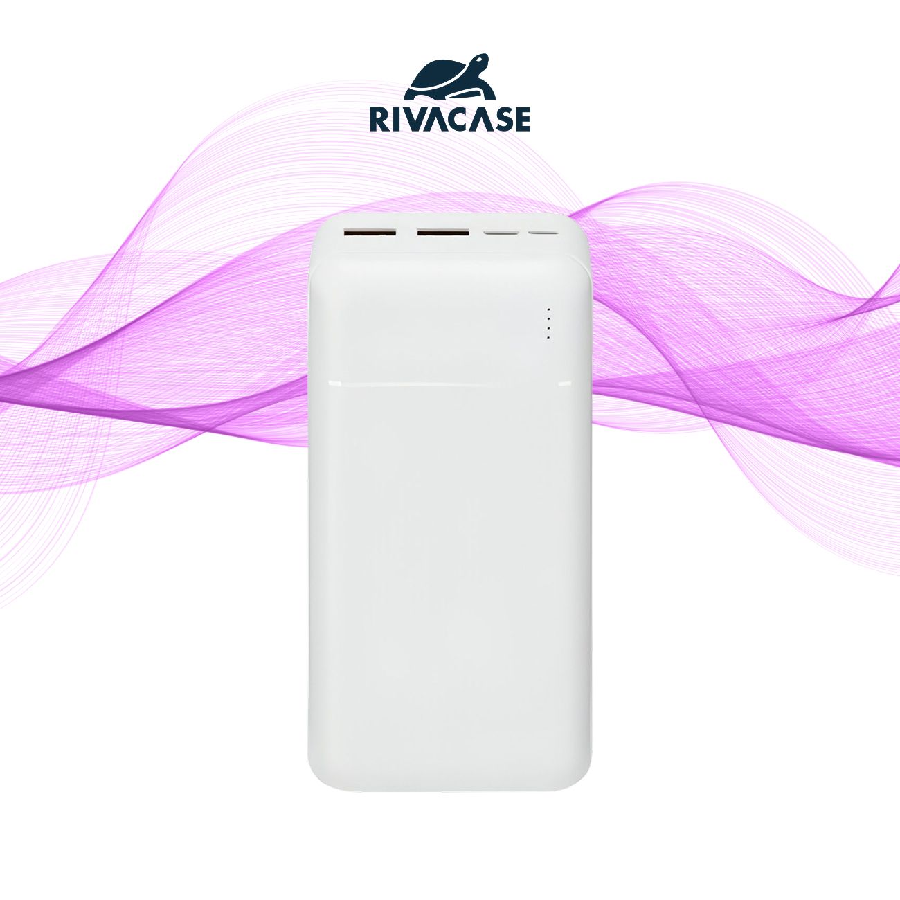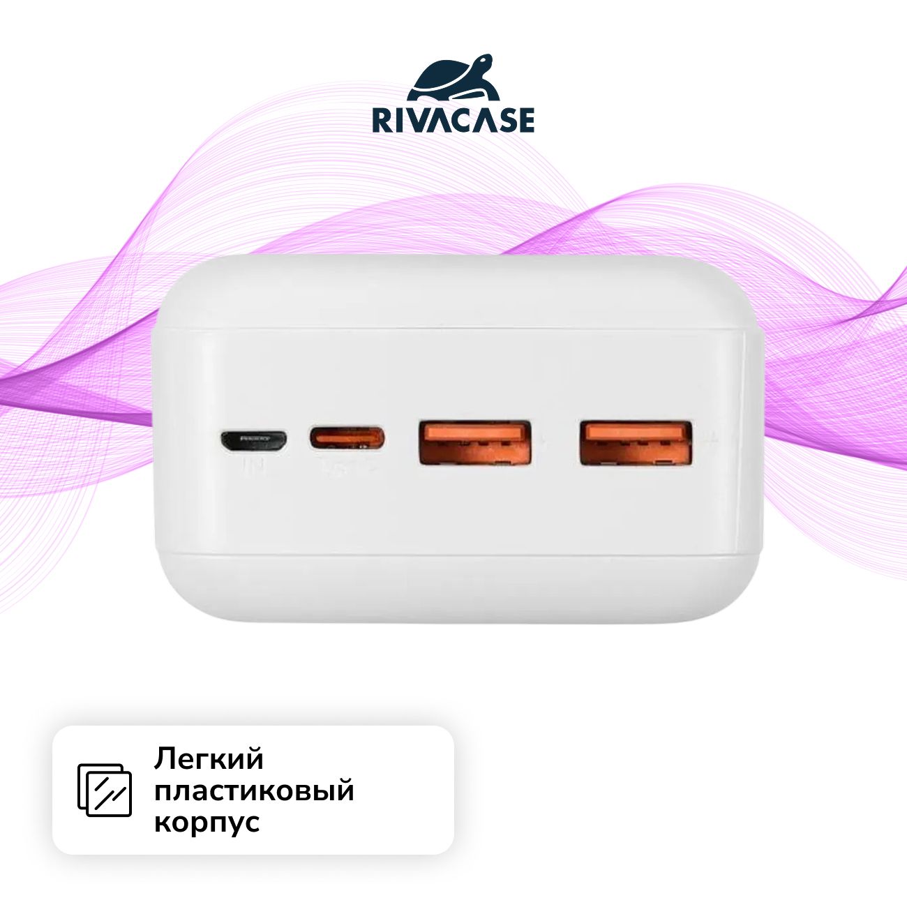 Внешний аккумулятор Rivacase VA2403 белого цвета обеспечивает несколько полных циклов зарядки за счет емкости 30000 мА*ч, что делает устройство подходящим для длительных поездок и повседневного использования.