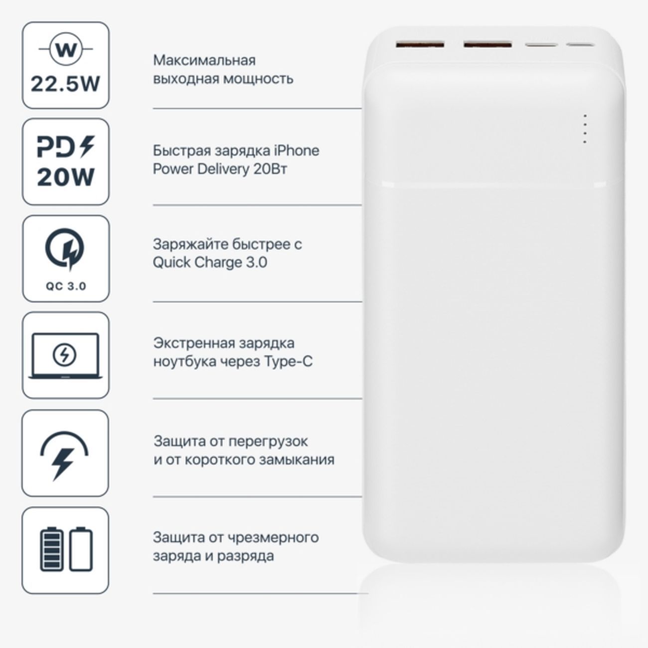 • Мощность 22,5 Вт и максимальная нагрузка 4500 мА