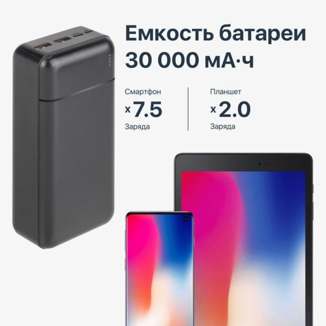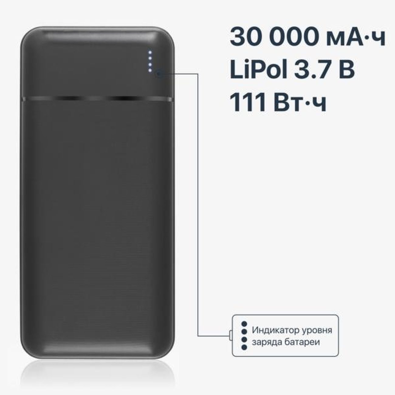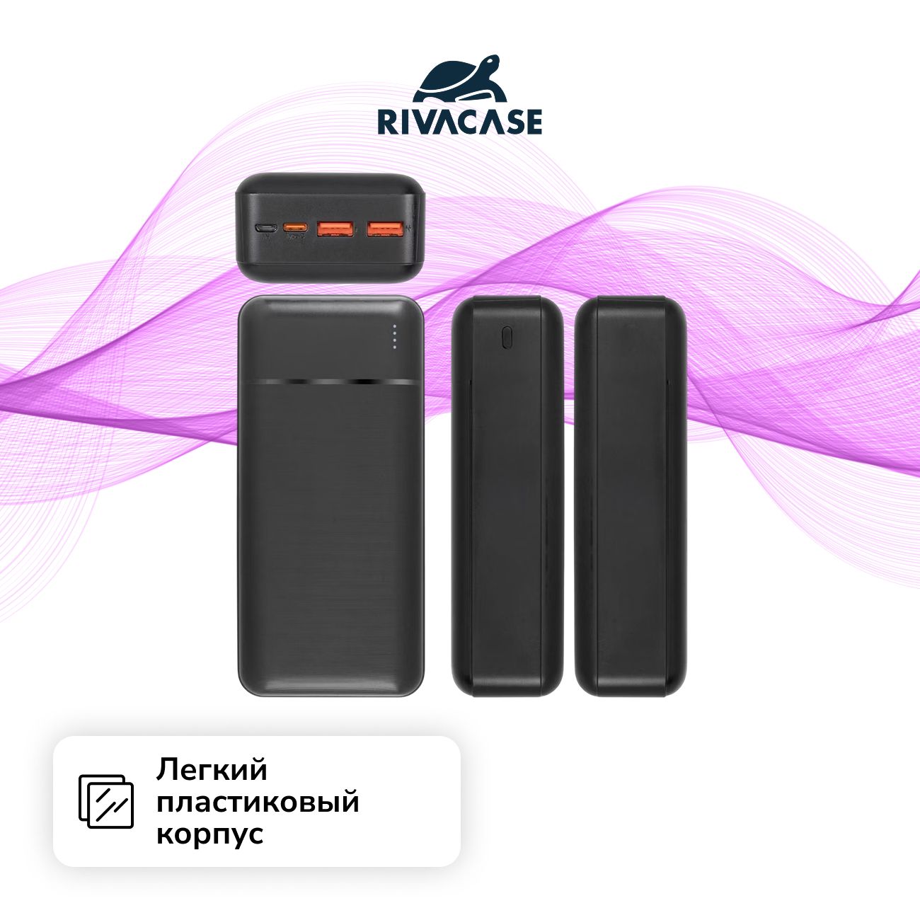 Внешний аккумулятор Rivacase VA2403 черного цвета обеспечивает несколько полных циклов зарядки за счет емкости 30000 мА*ч, что делает устройство подходящим для длительных поездок и повседневного использования.
