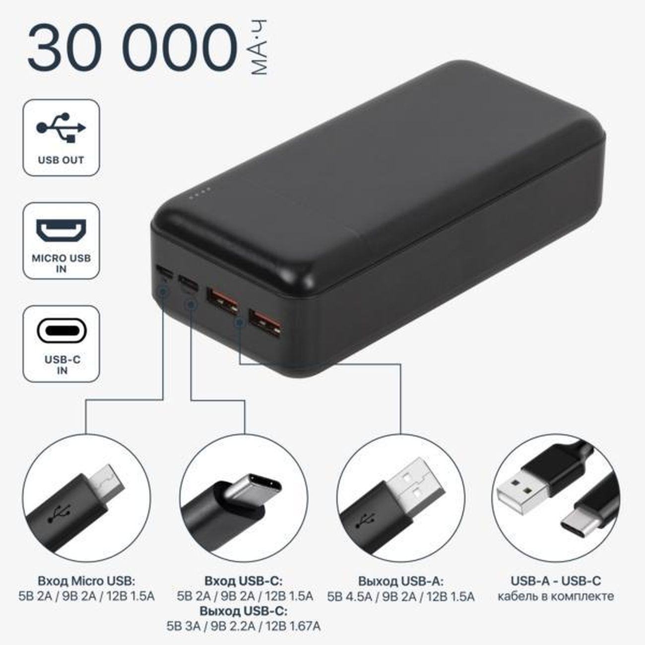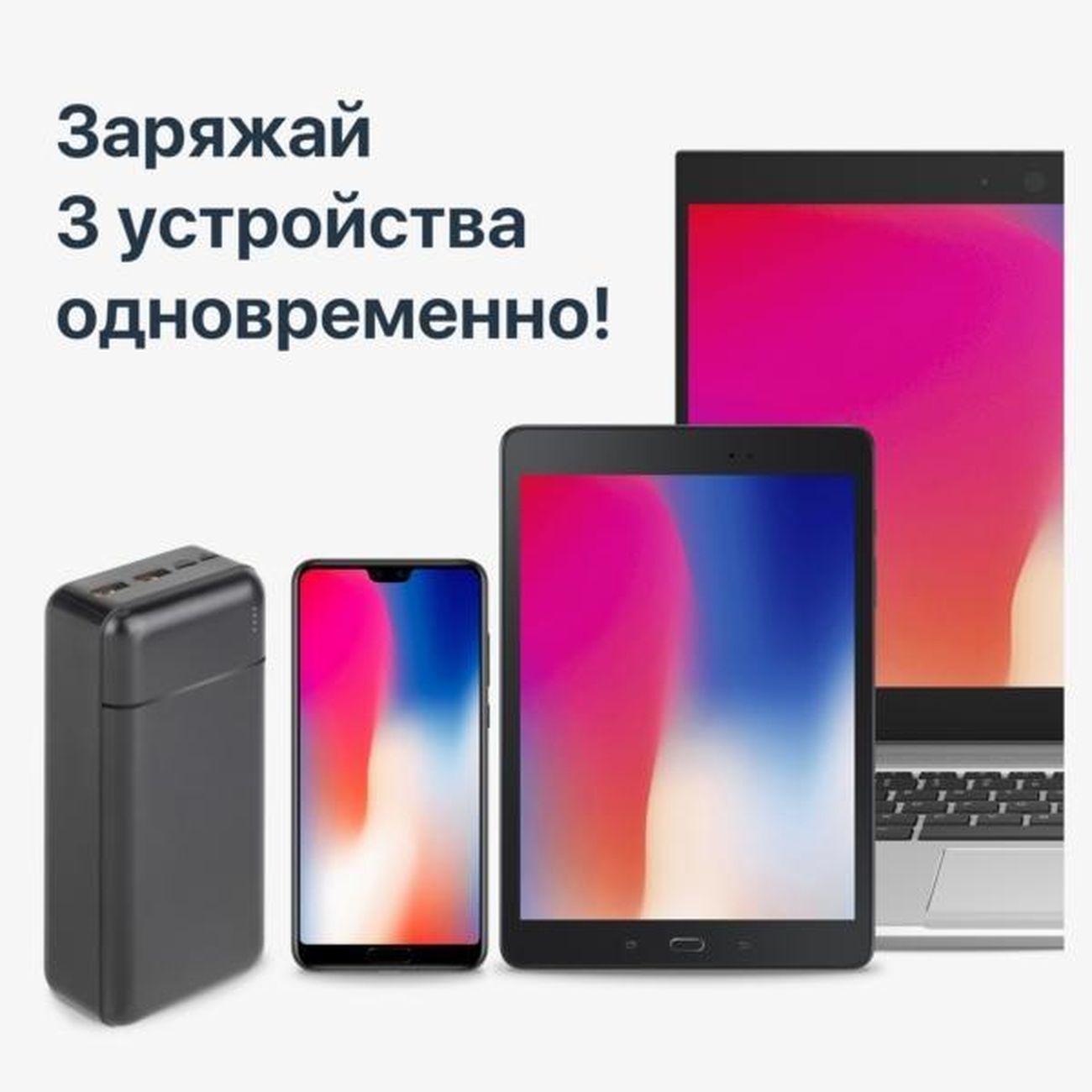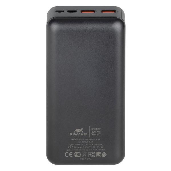 Внешний аккумулятор Rivacase VA2403 черного цвета обеспечивает несколько полных циклов зарядки за счет емкости 30000 мА*ч, что делает устройство подходящим для длительных поездок и повседневного использования.