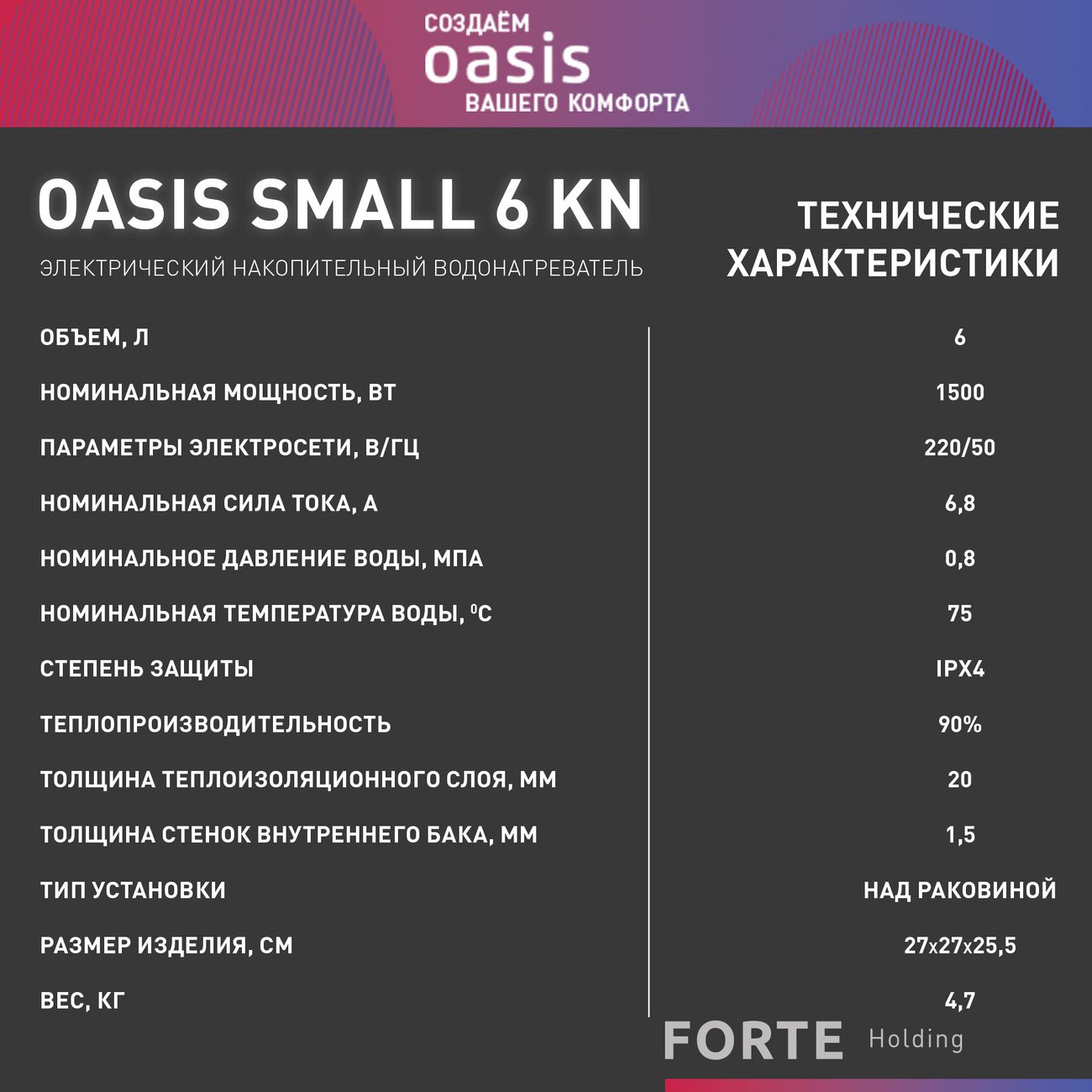 Электрический накопительный водонагреватель Oasis 6 KN — компактный прибор с нижней подводкой воды, подходящий для установки над раковиной. Объём бака 6 л обеспечивает стабильный нагрев воды до 75°C с индикацией режима работы, а эргономичный дизайн позволяет устанавливать устройство даже в узких пространствах.